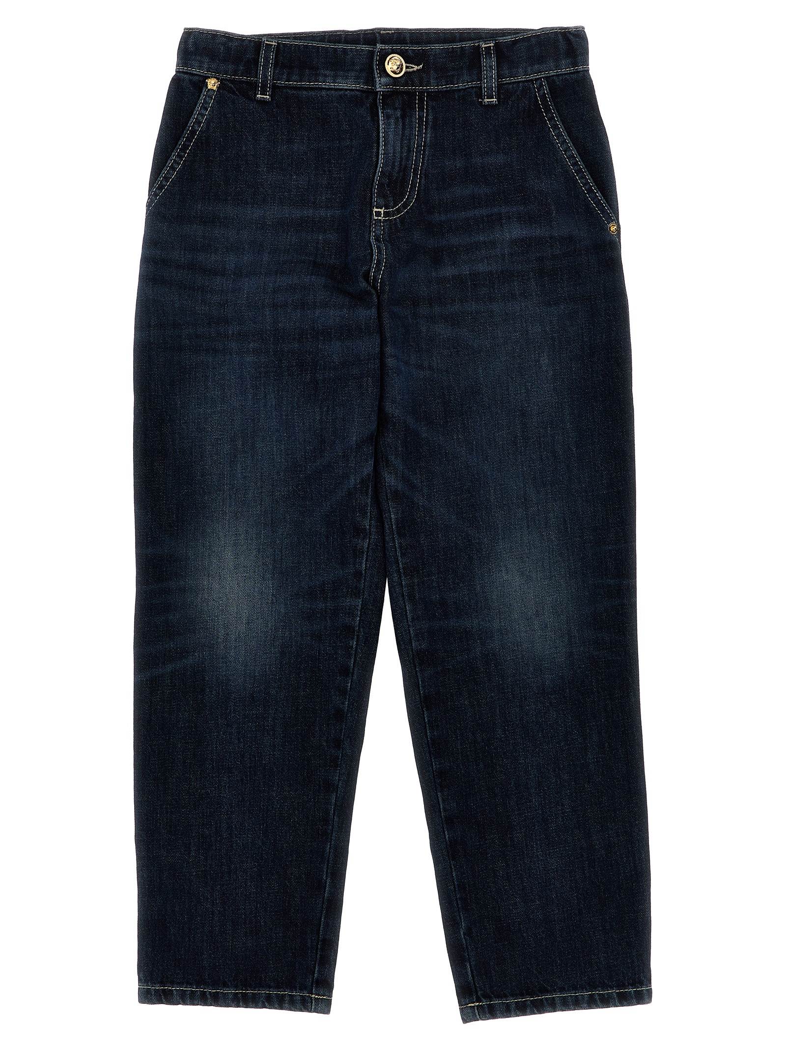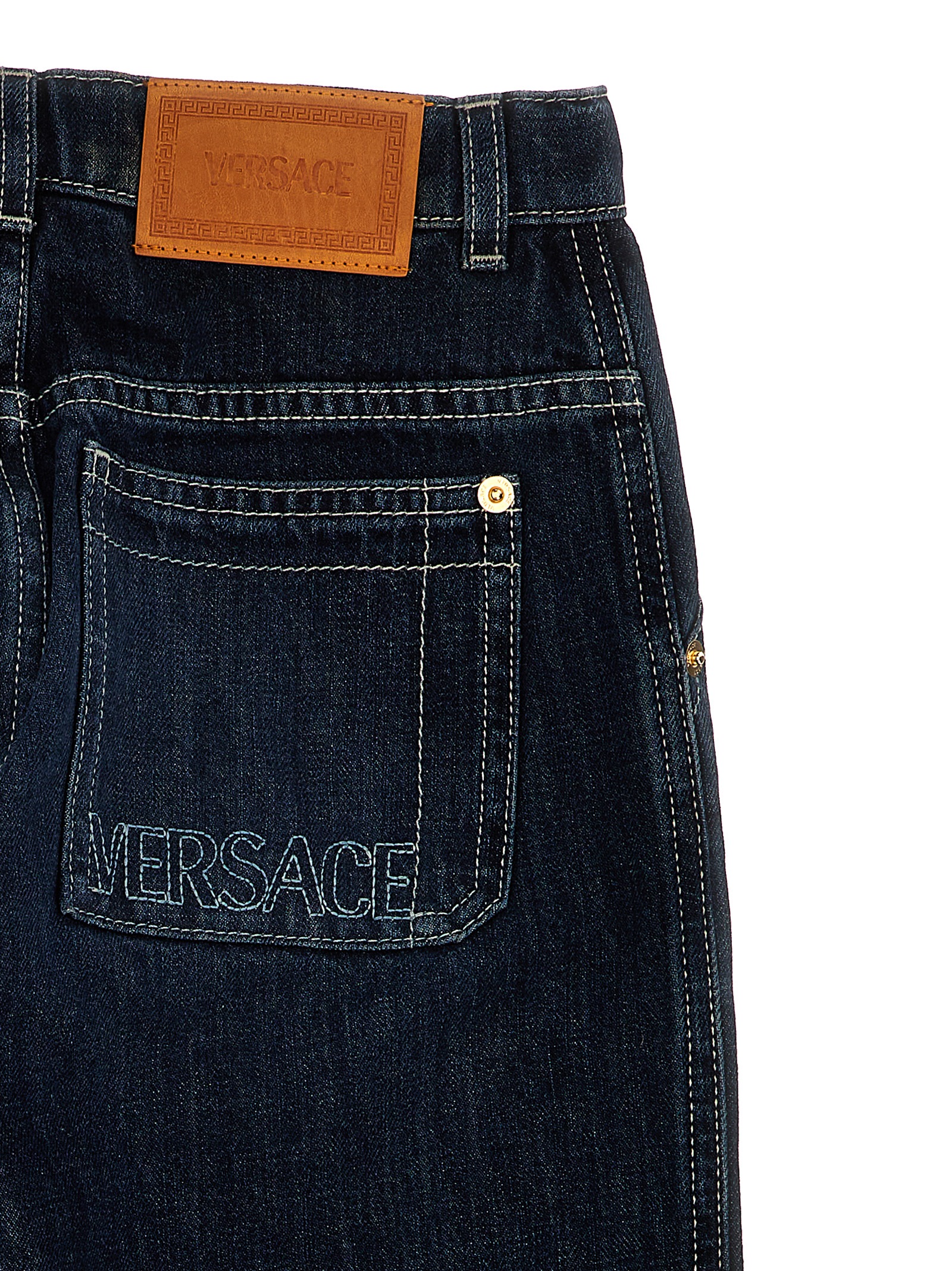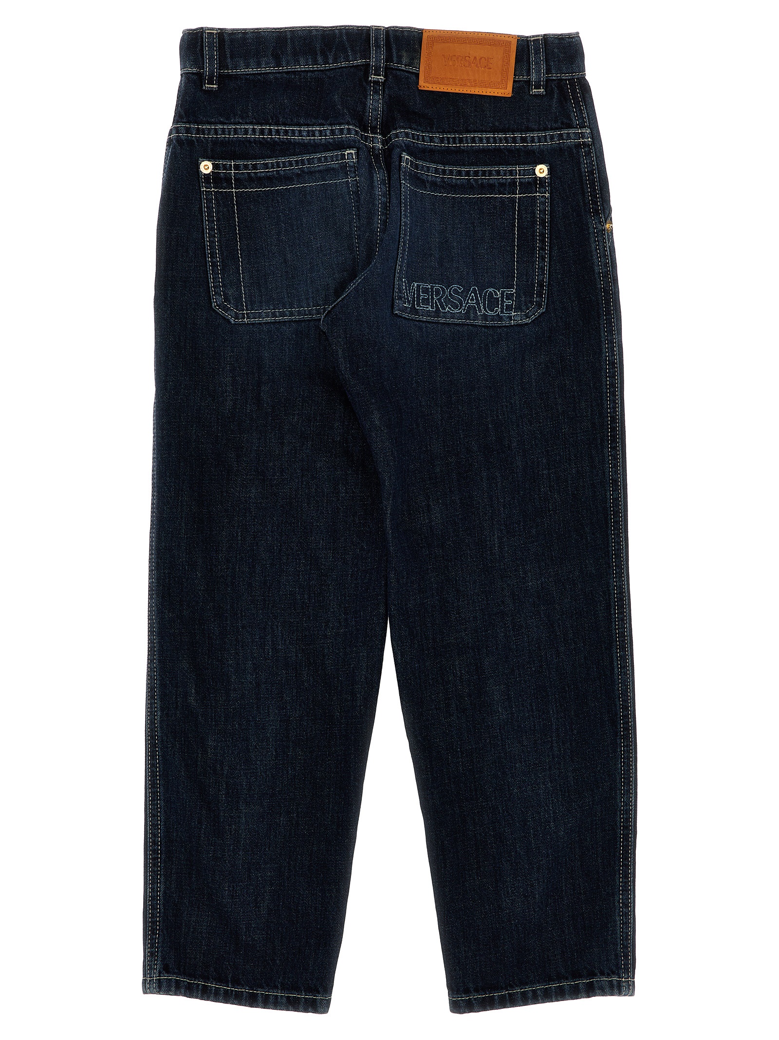 Cotton denim jeans with zip and ‘Medusa’ button closure, pockets, leather logo tag, and embroidered logo on the back.e back.