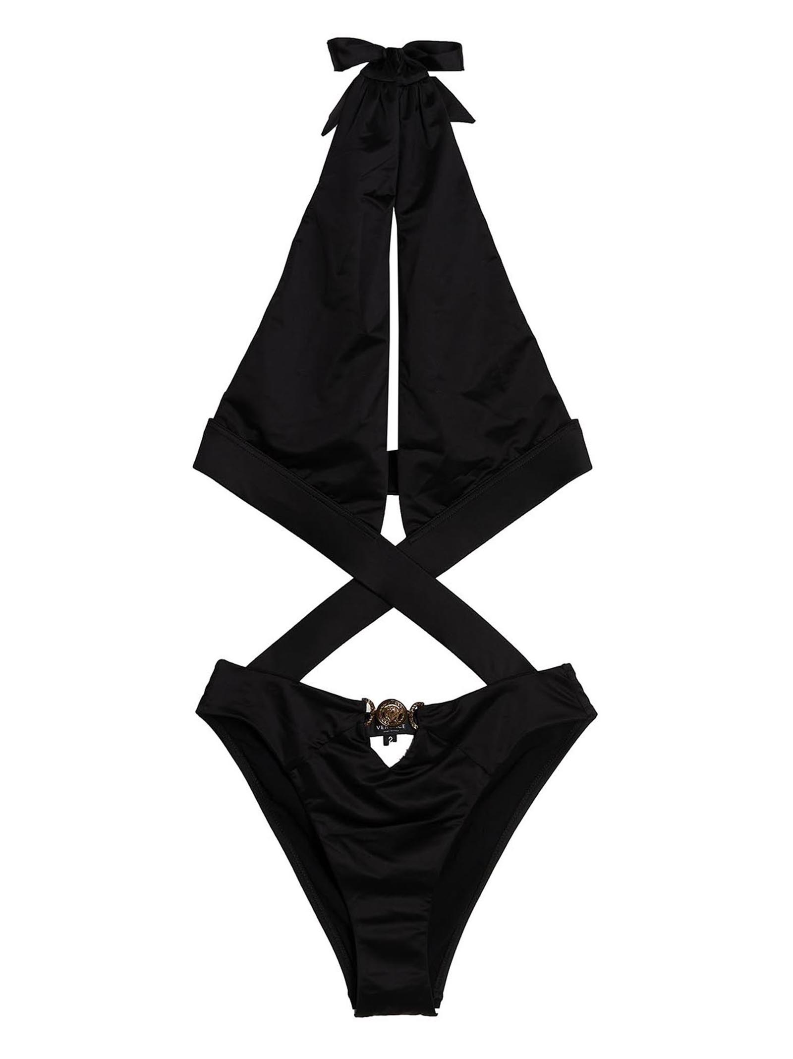 Belize fabric one piece swimsuit featuring a front weave, fastening at the neck and a ‘Medusa’ gold metal detail.