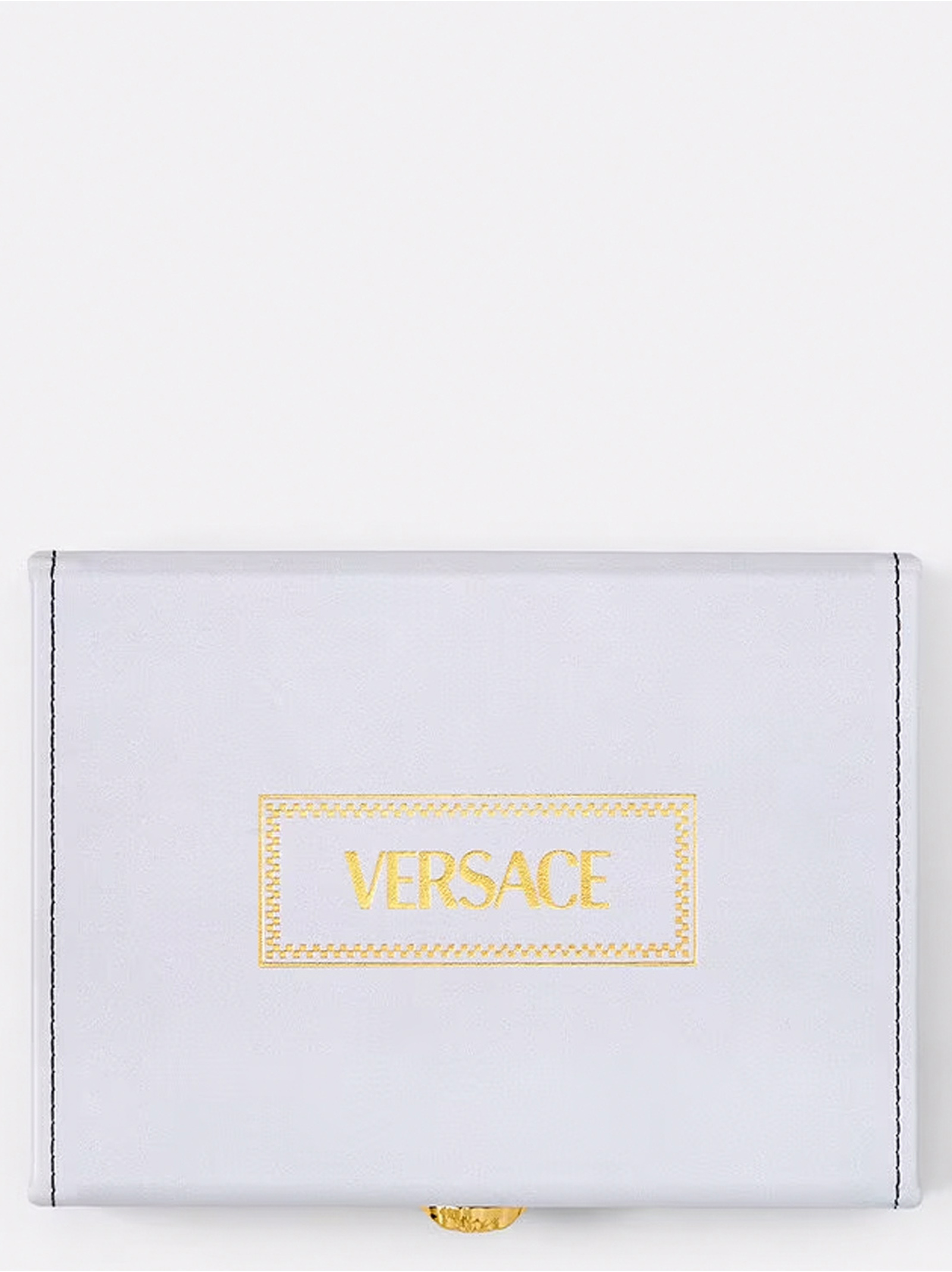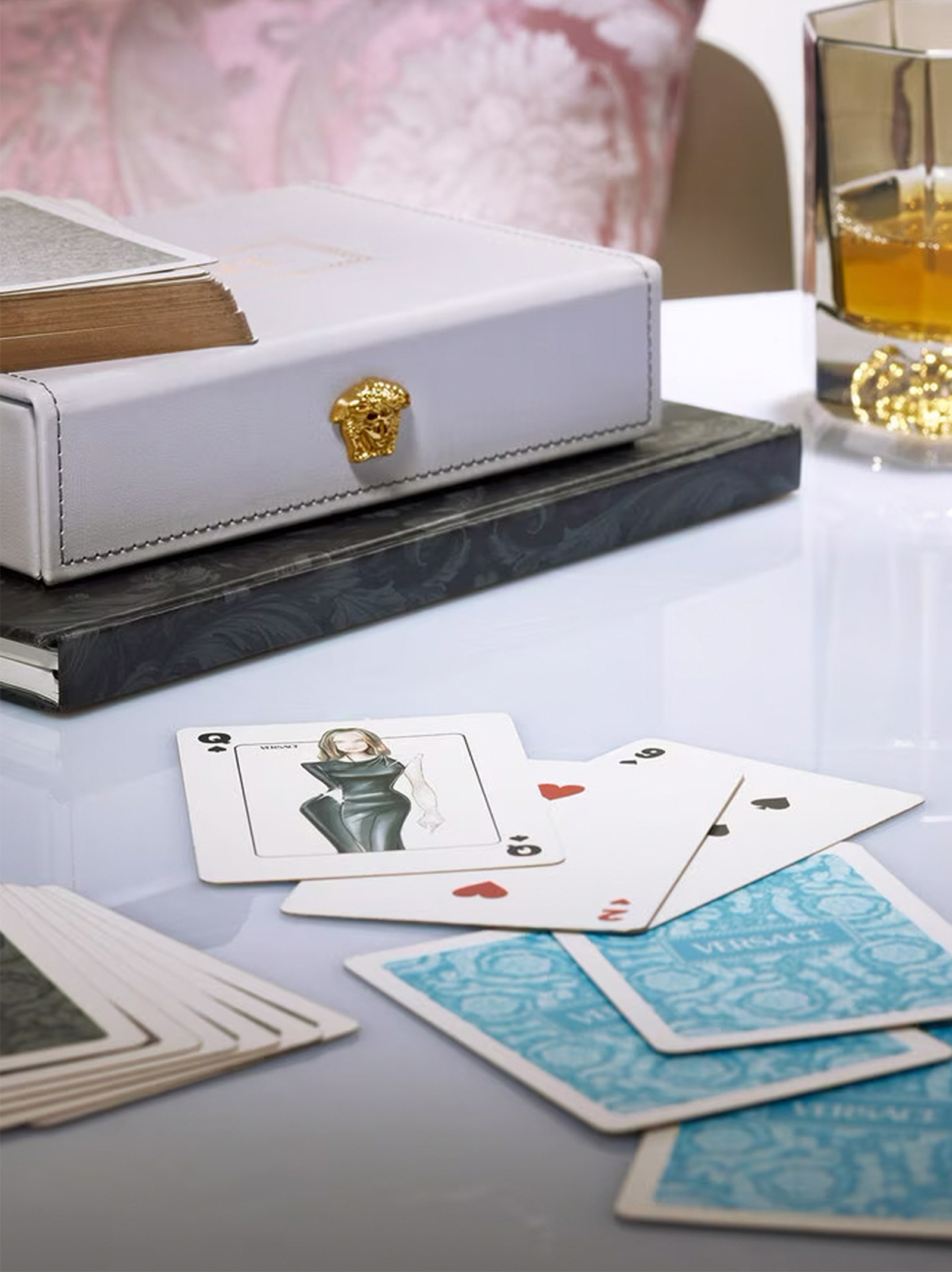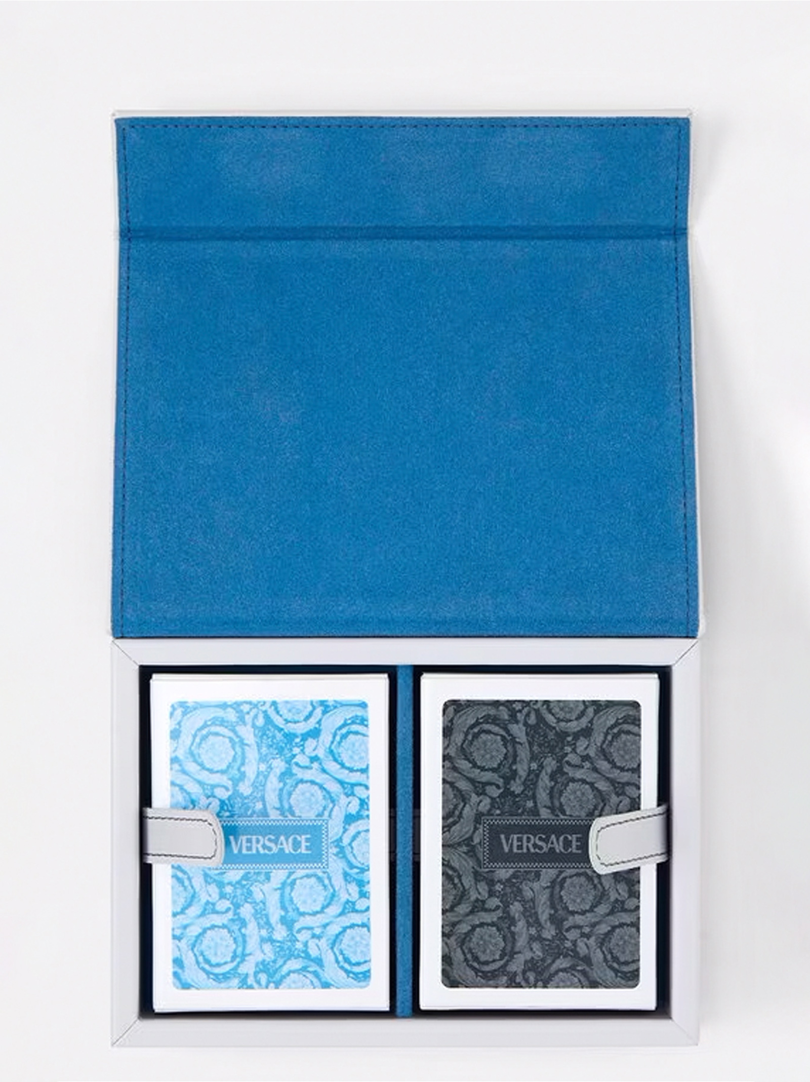 The playing card set contains two decks of 54 cards in paper boxes with Barocco print and a leather case with suede interior and a Medusa stud detail on the folding magnetic closure. The figures on the cards wear iconic Versace models.