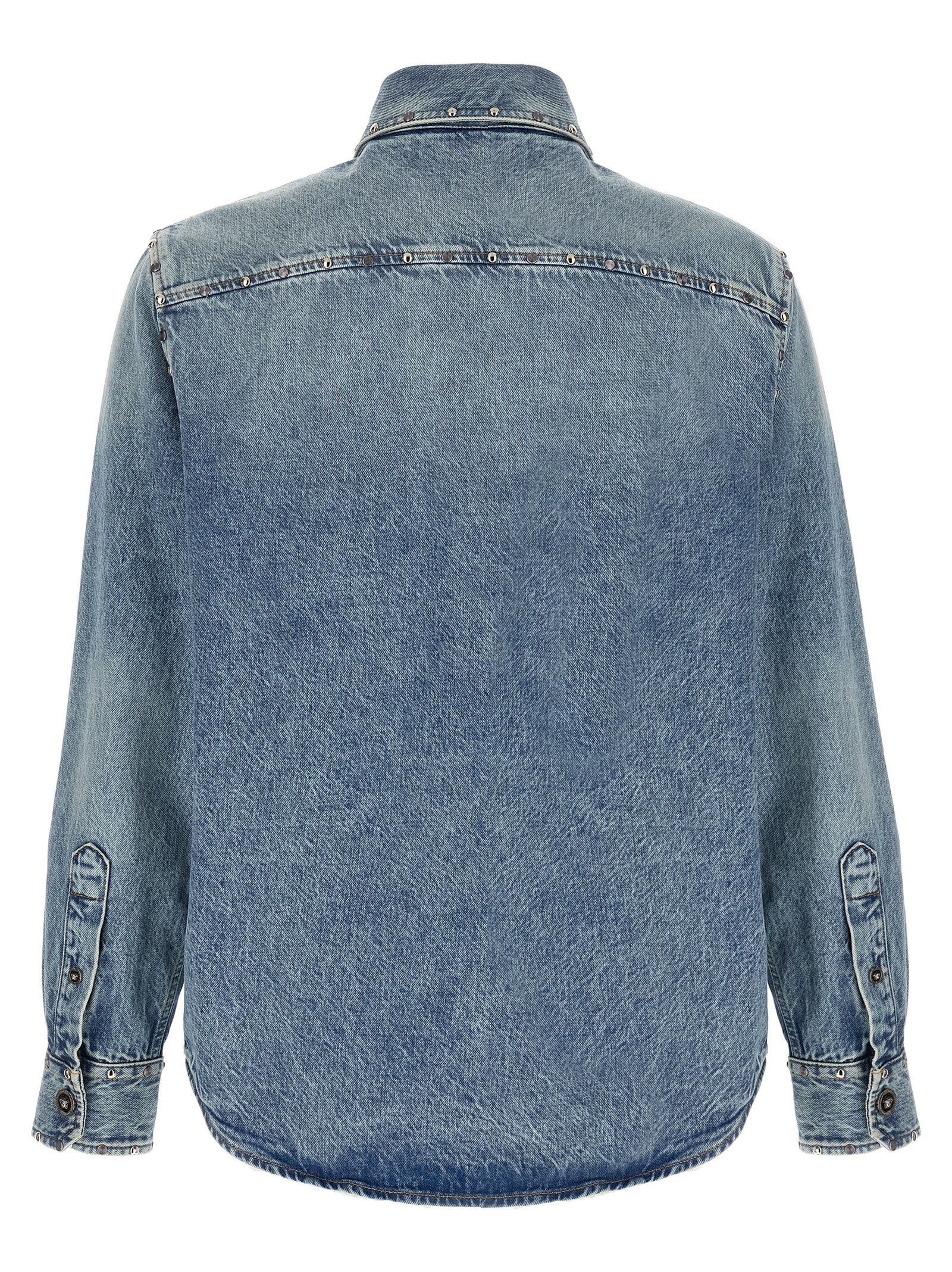 Stonewashed cotton denim shirt with metal stud appliqué, front enameled ‘Medusa’ snap button closure, pockets, long cuffed sleeves.