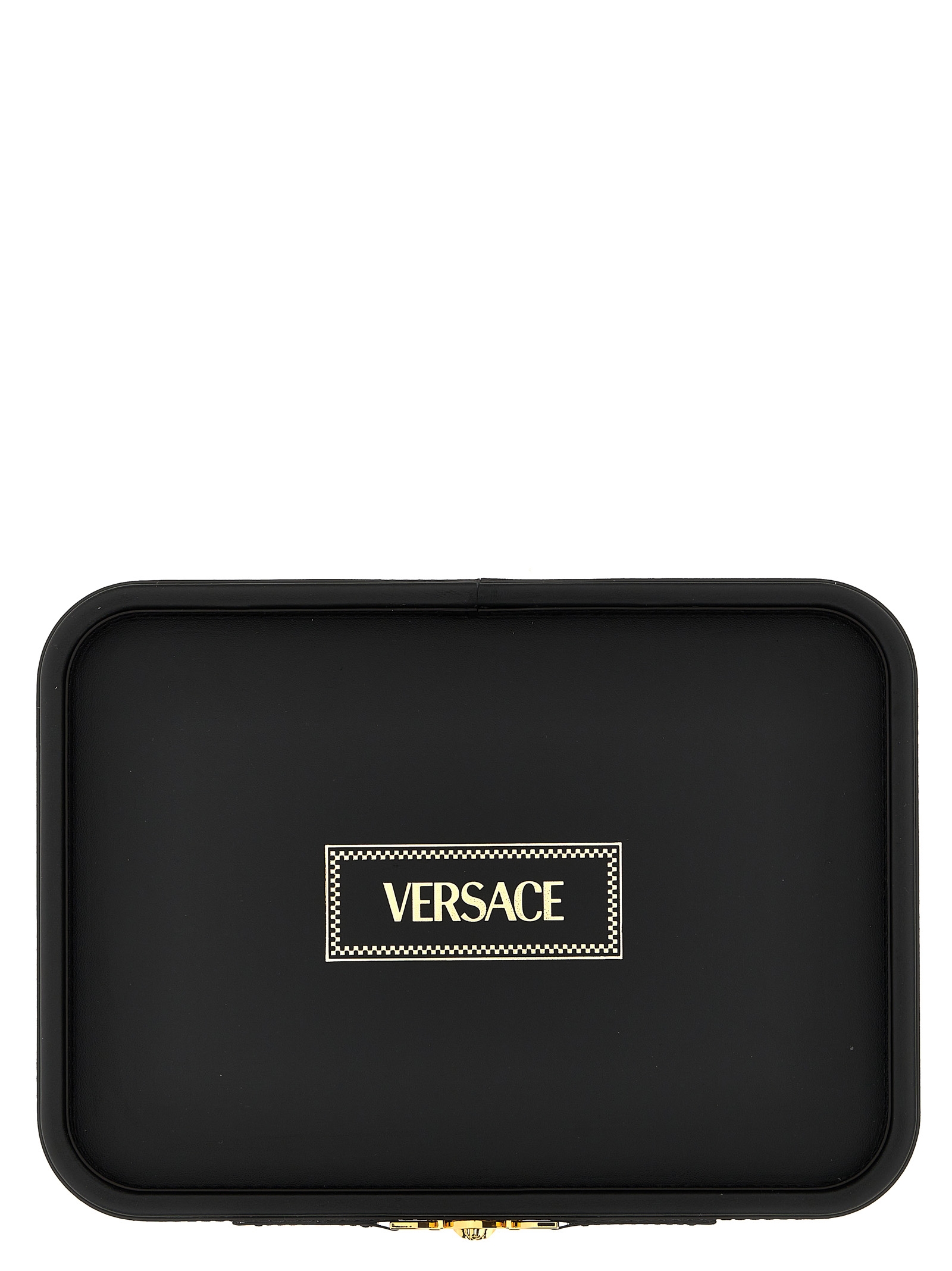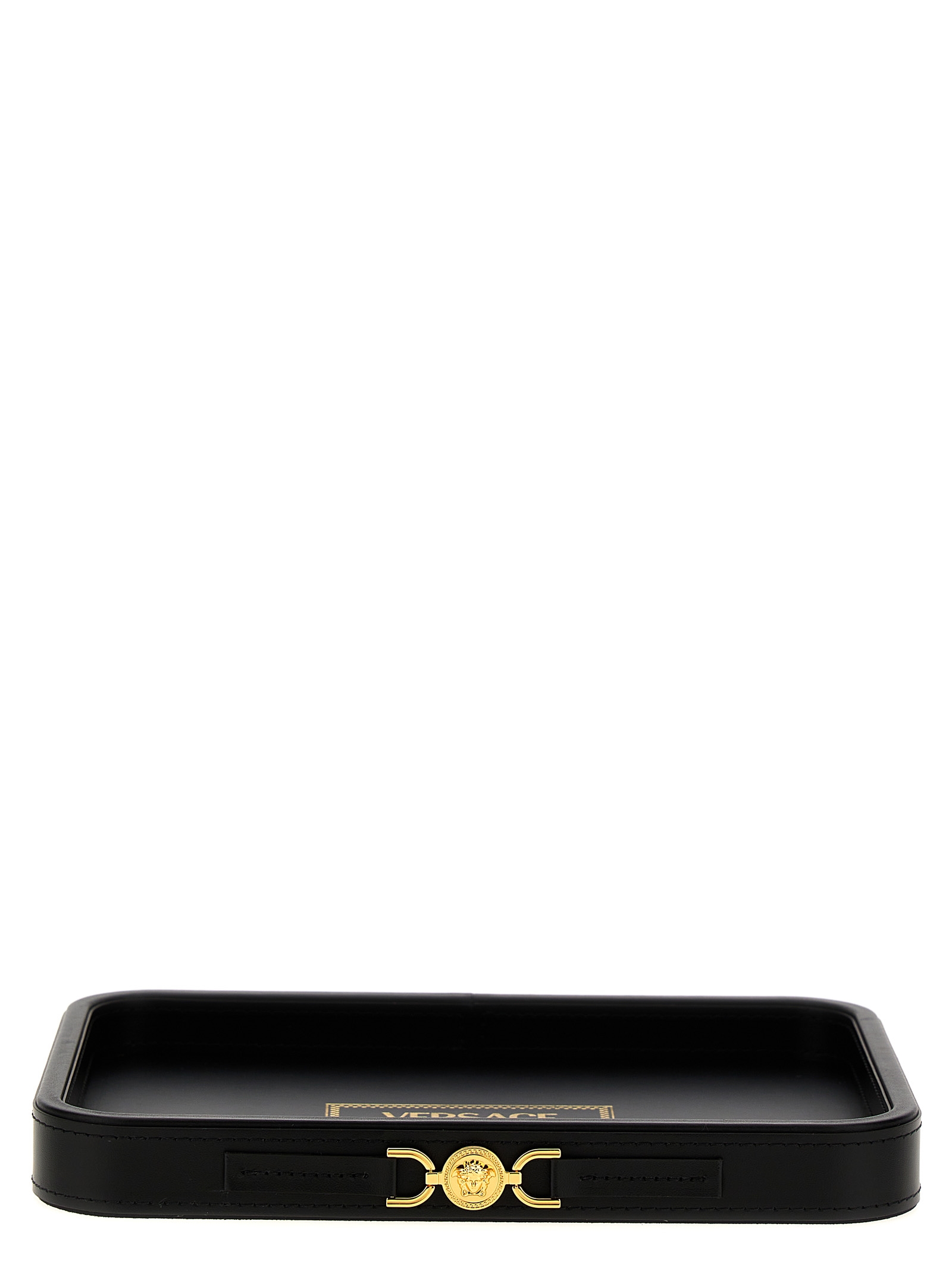 Leather covered valet tray with logo print and metal ‘Medusa’ detail.
