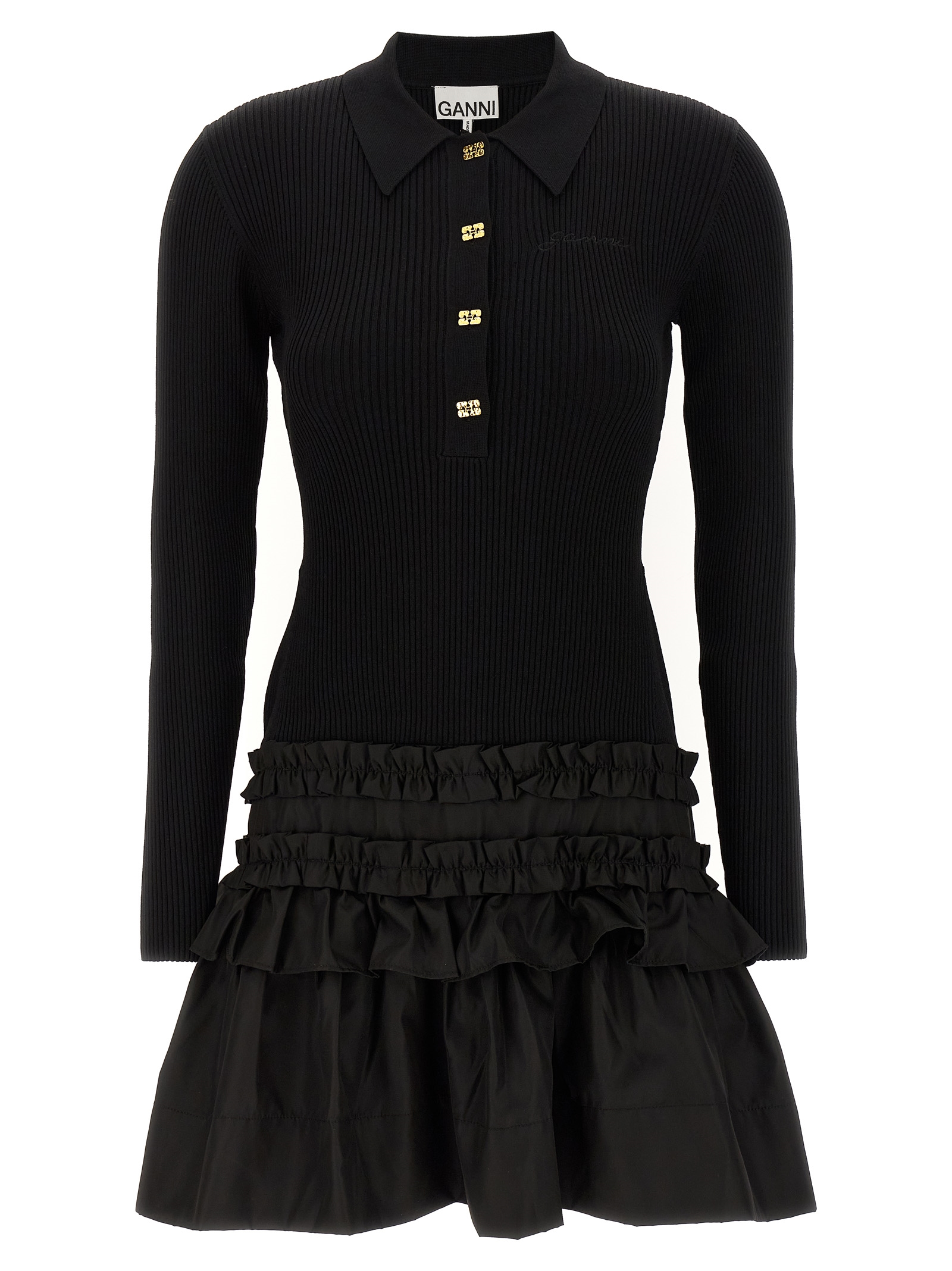 ‘Melange Rib Knit Mini’ dress consisting of a ribbed stretch viscose top, polo style, tone-on-tone logo embroidery on the front, collar and buttons, long sleeves and a flounced mini skirt in technical fabric.