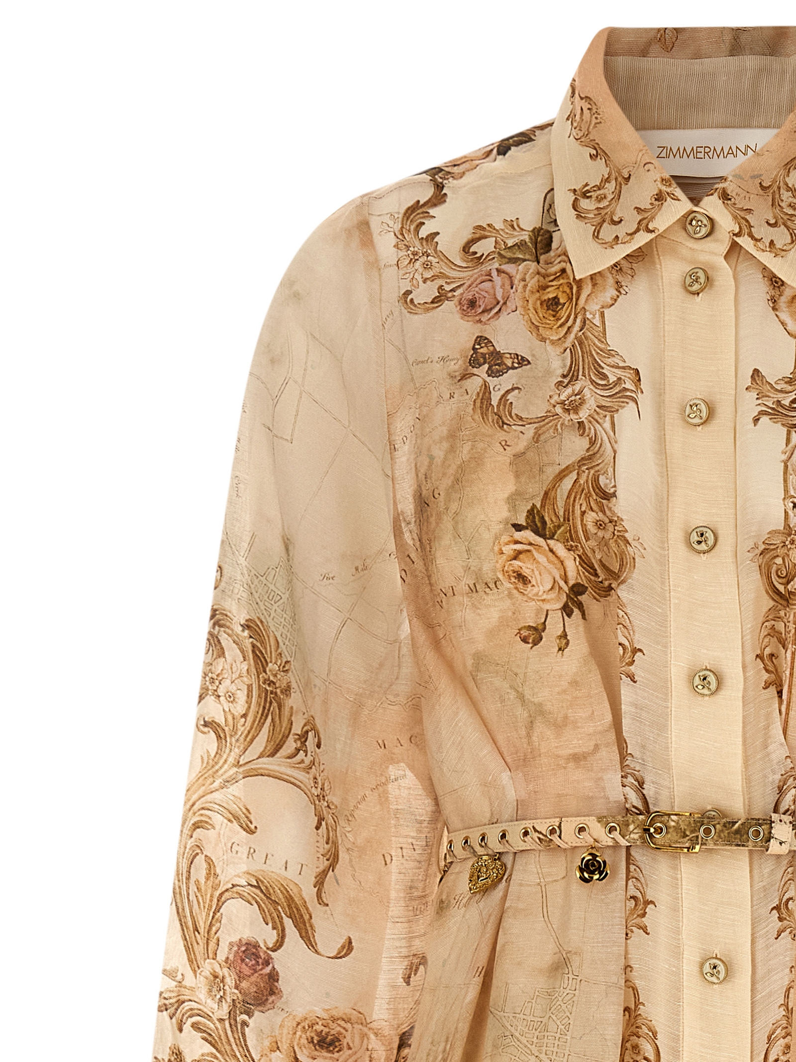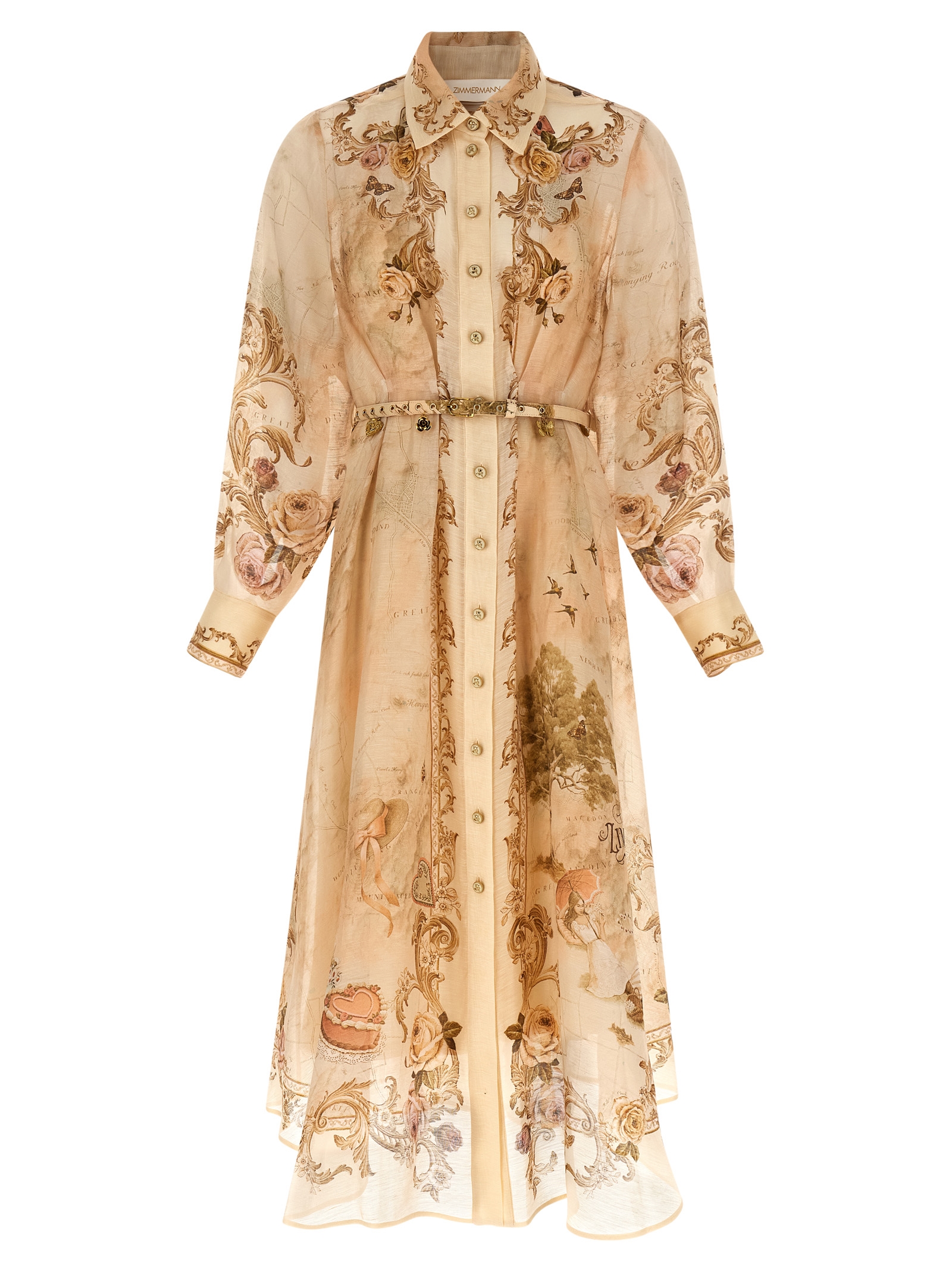 ‘Memento Buttoned Midi’ all-over patterned silk organza and linen dress, chemisier model, front metal button closure, pin tucks at the waist, long cuffed sleeves, asymmetrical hem, removable petticoat with adjustable straps, removable belt with charms.