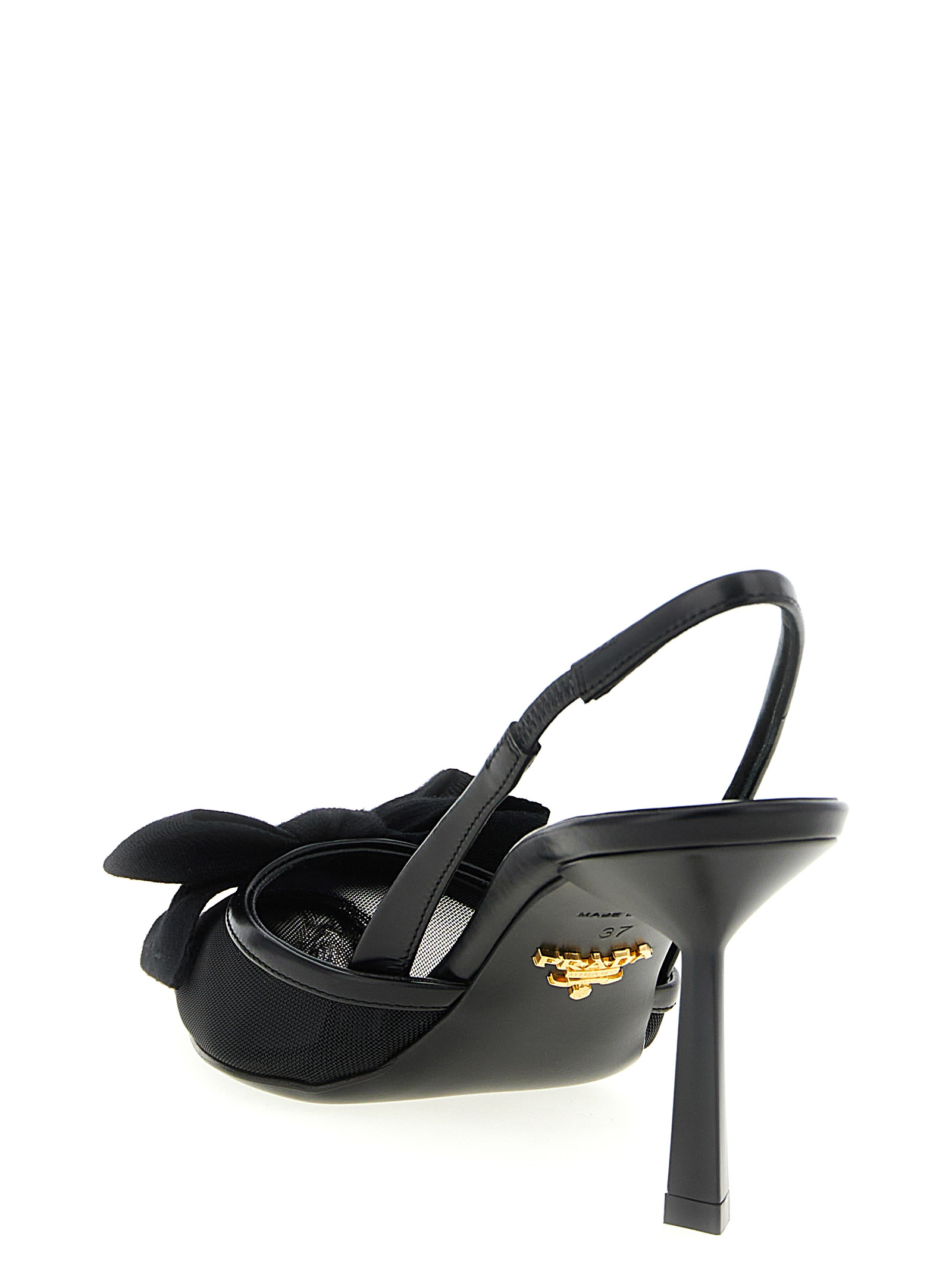 Mesh slingback shoes with front bow, metal logo lettering detail, leather details.