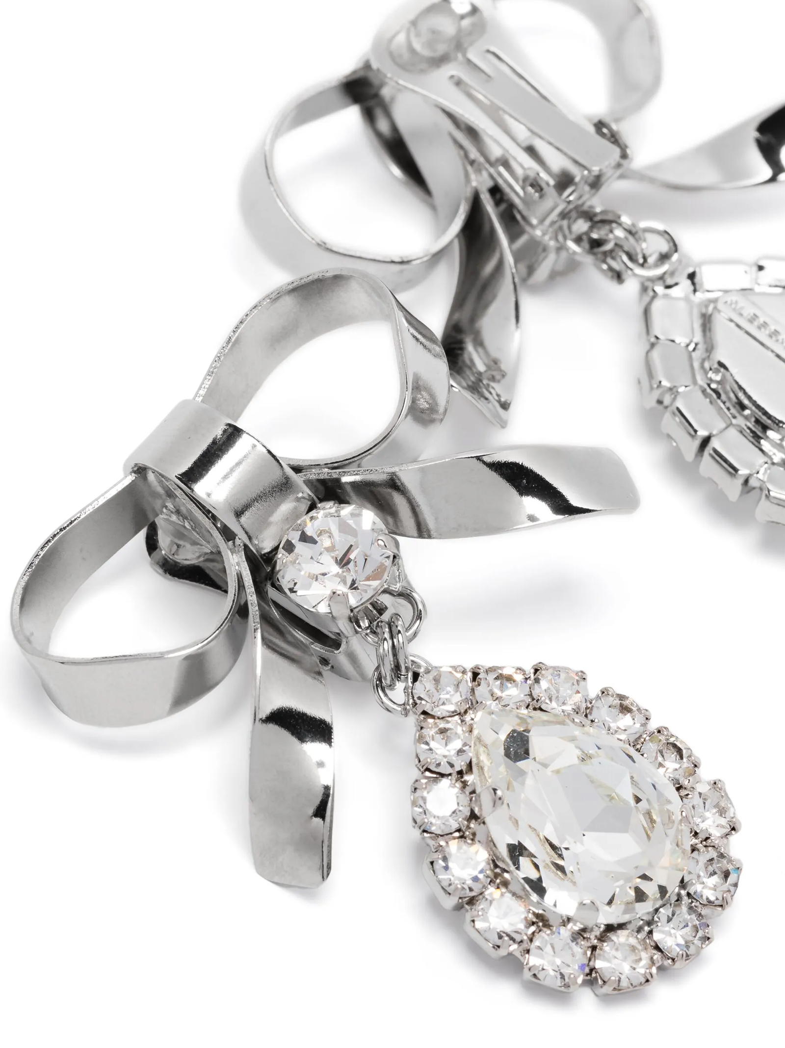 Metal bow earrings with crystal drop pendant. Clip-on closure.
