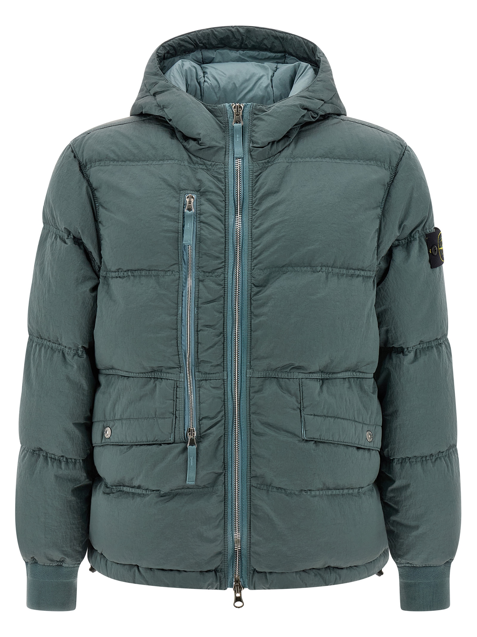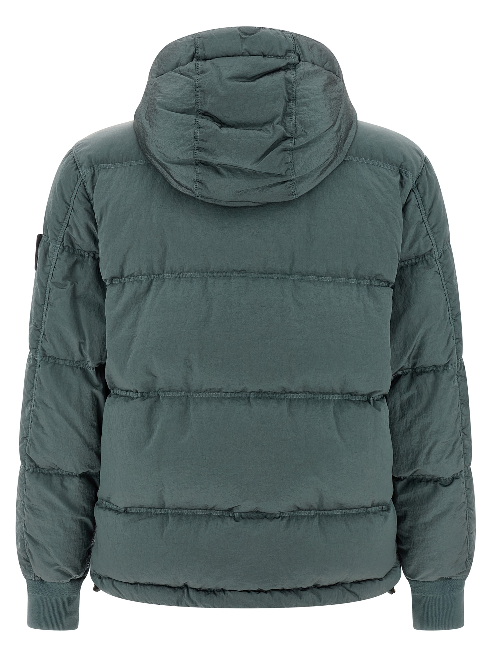Quilted iridescent Nylon Metal quilted down jacket with goose feather padding, adjustable hood, front zip closure, pockets, long sleeves with knitted cuffs and logo badge appliqué, drawstring on the hem.