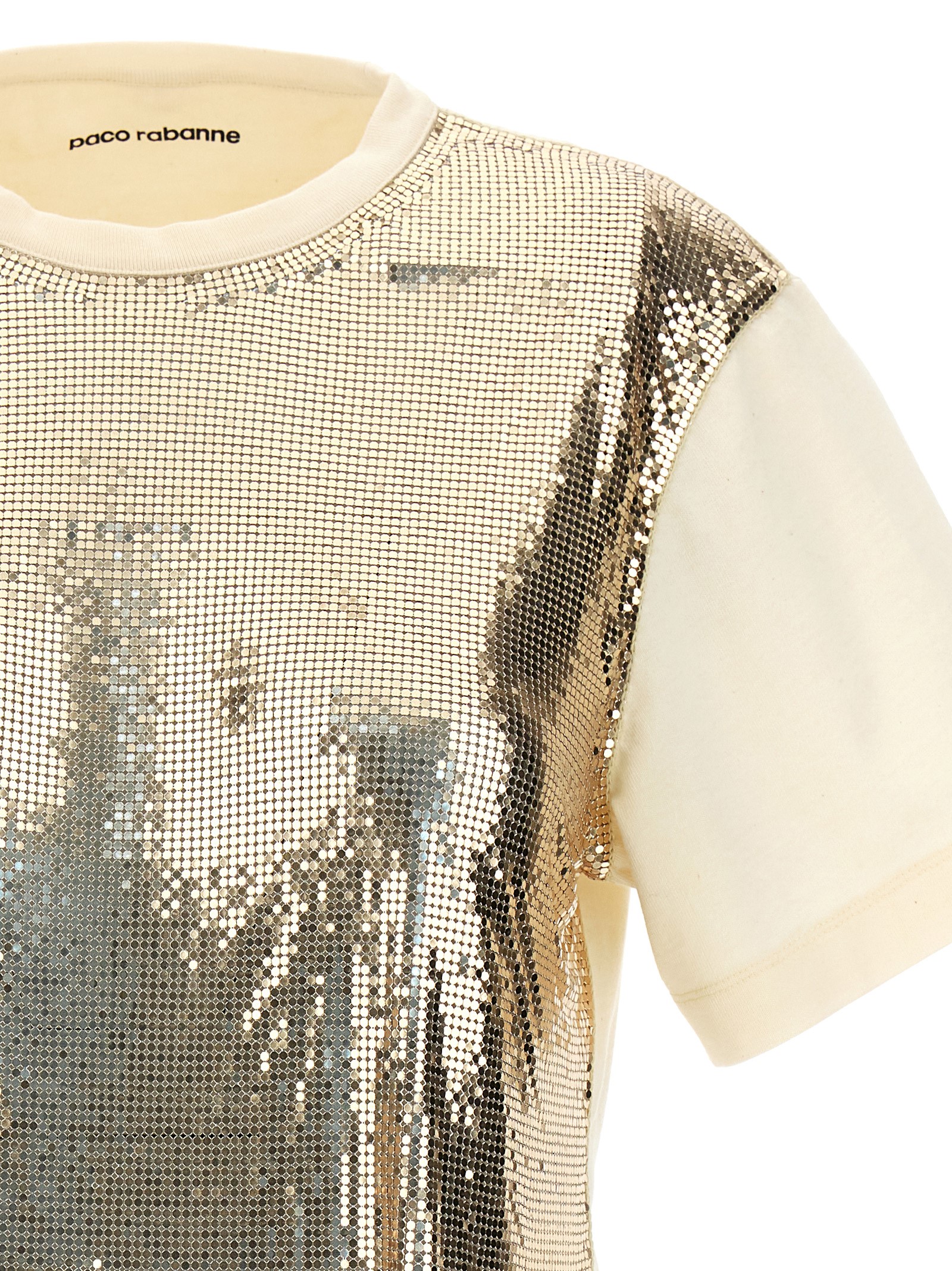 Cotton top with metal sequins on the front, cropped, crewneck.