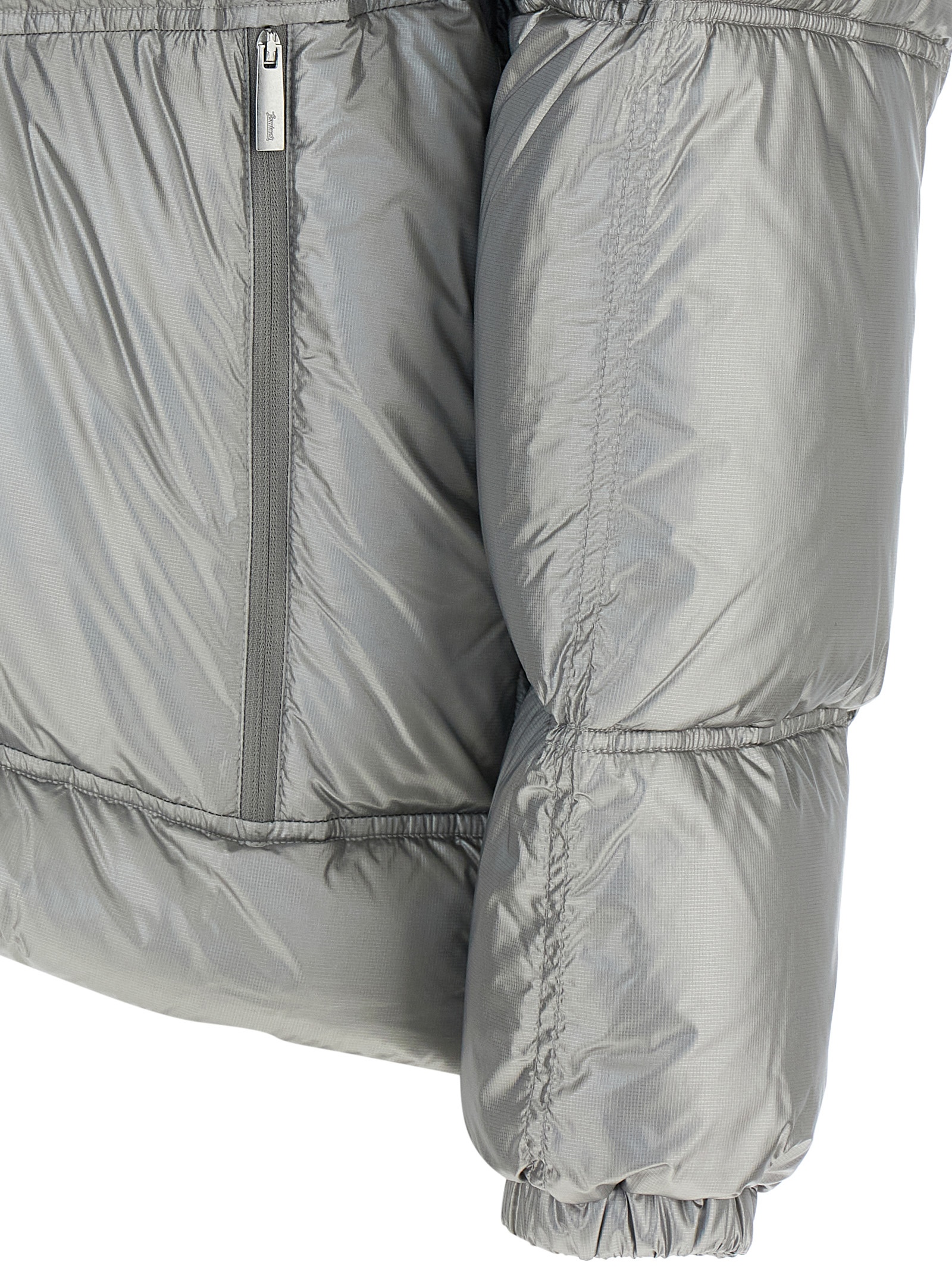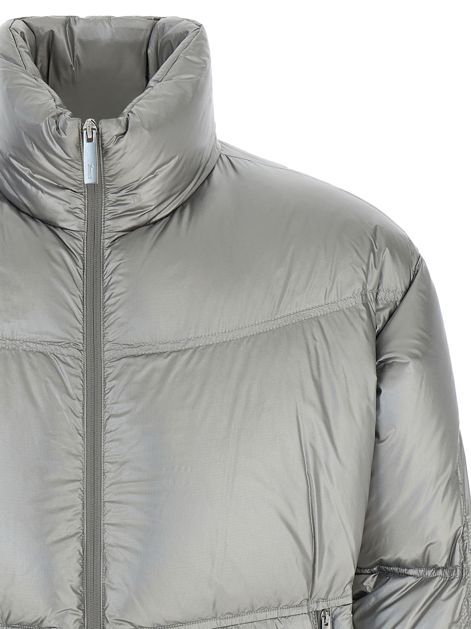 Metallic shield nylon down jacket with quilted titanium coating and goose feather padding, standing collar, front zip closure, pockets, long sleeves with elastic cuffs and dropped shoulder, drawstring on the hem.