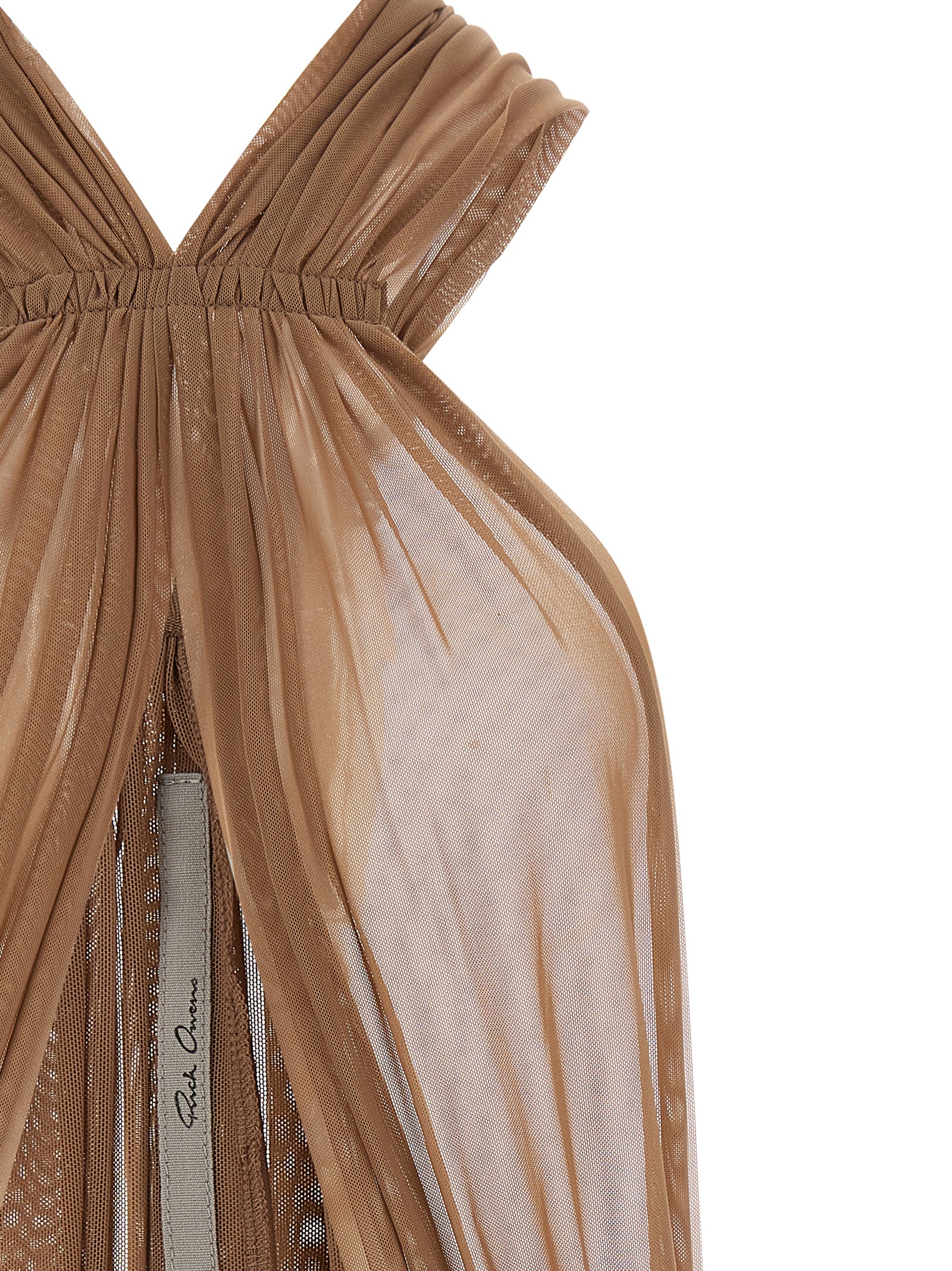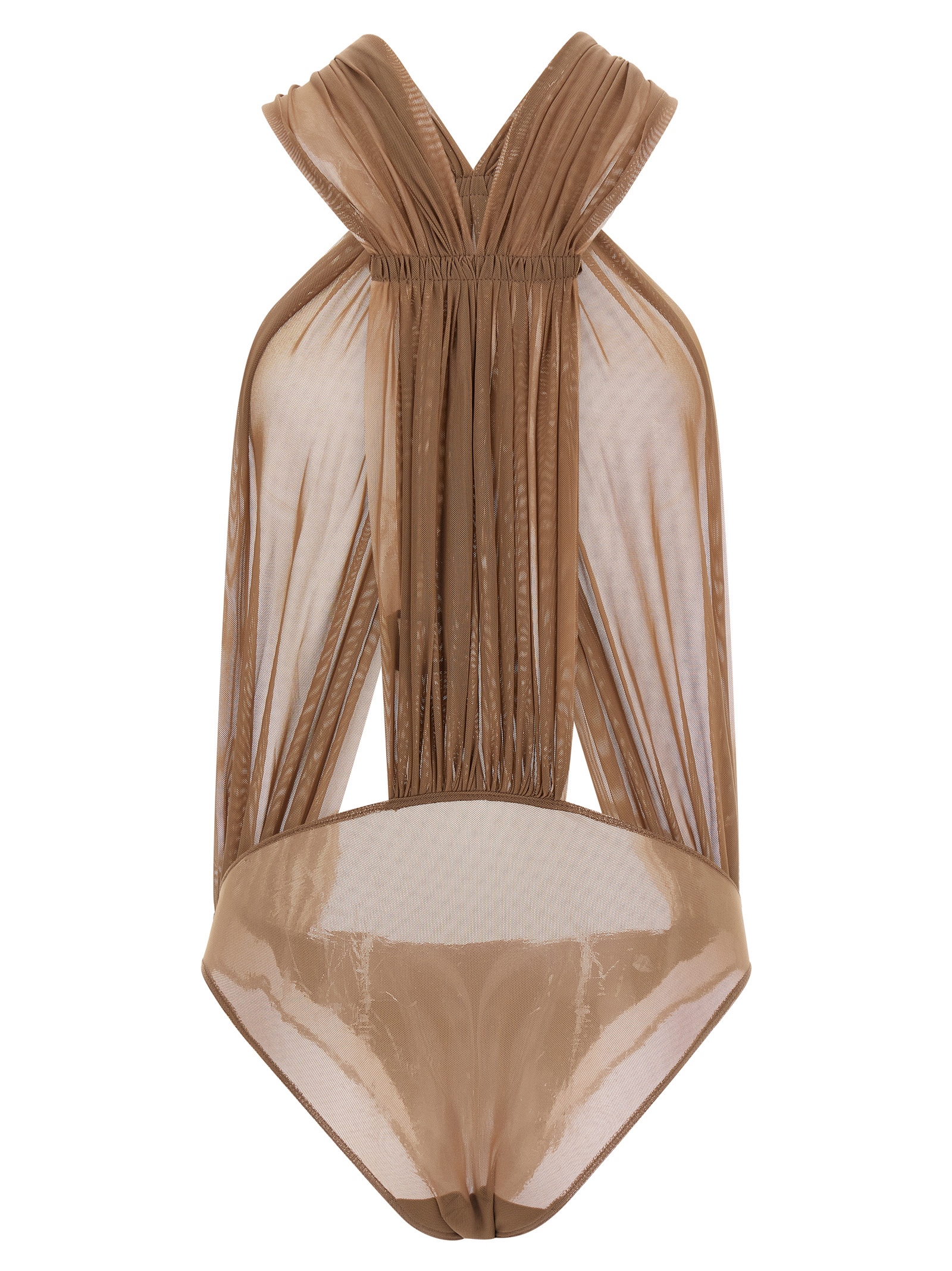 ‘Miami’ bodysuit in stretch tulle of light and semi-transparent nylon composed of two front ribbons to cover the breast that come together under the neck and behind the back in one piece, classic cover bottoms.