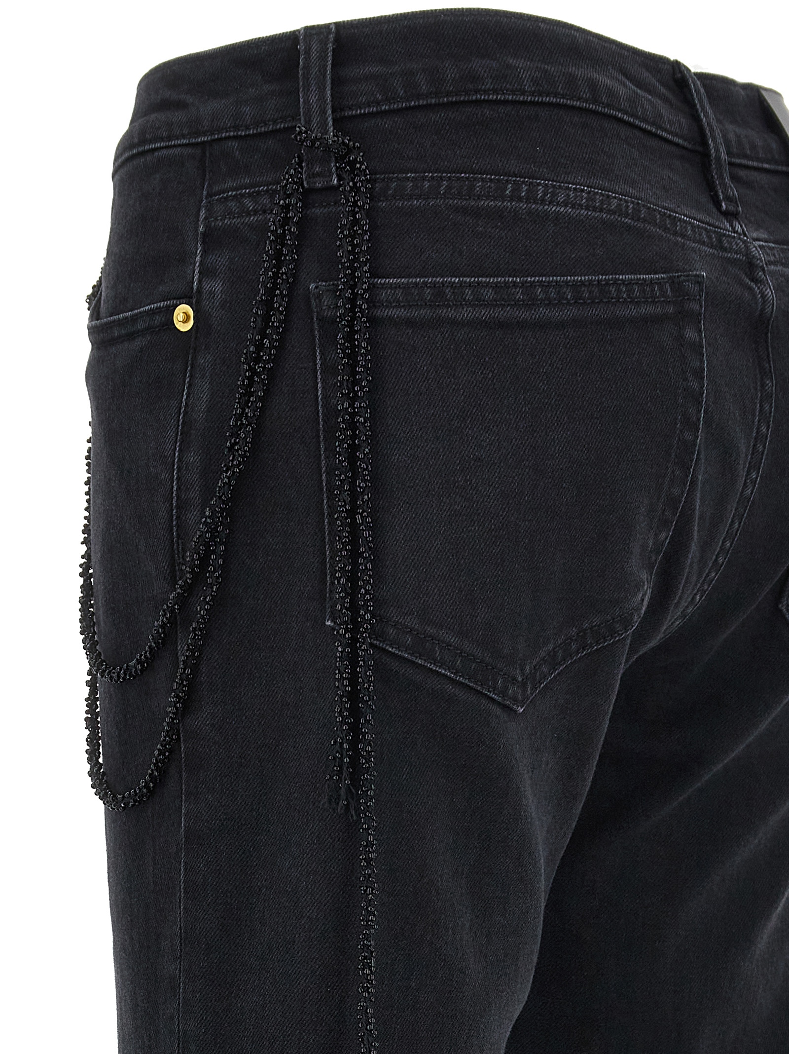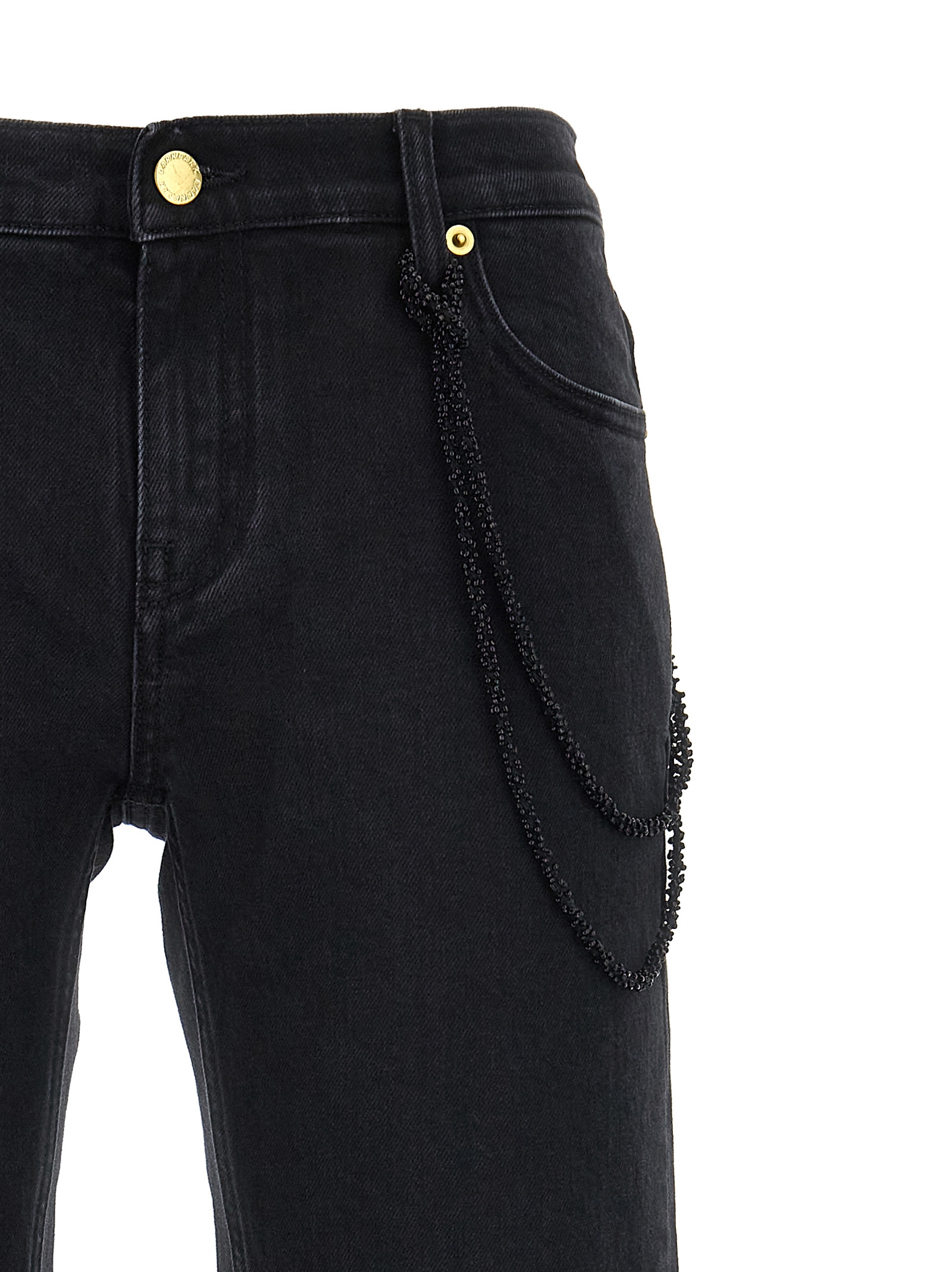 ‘Michelle’ cotton denim jeans with zip and button closure, five pockets, laced detail with beads.