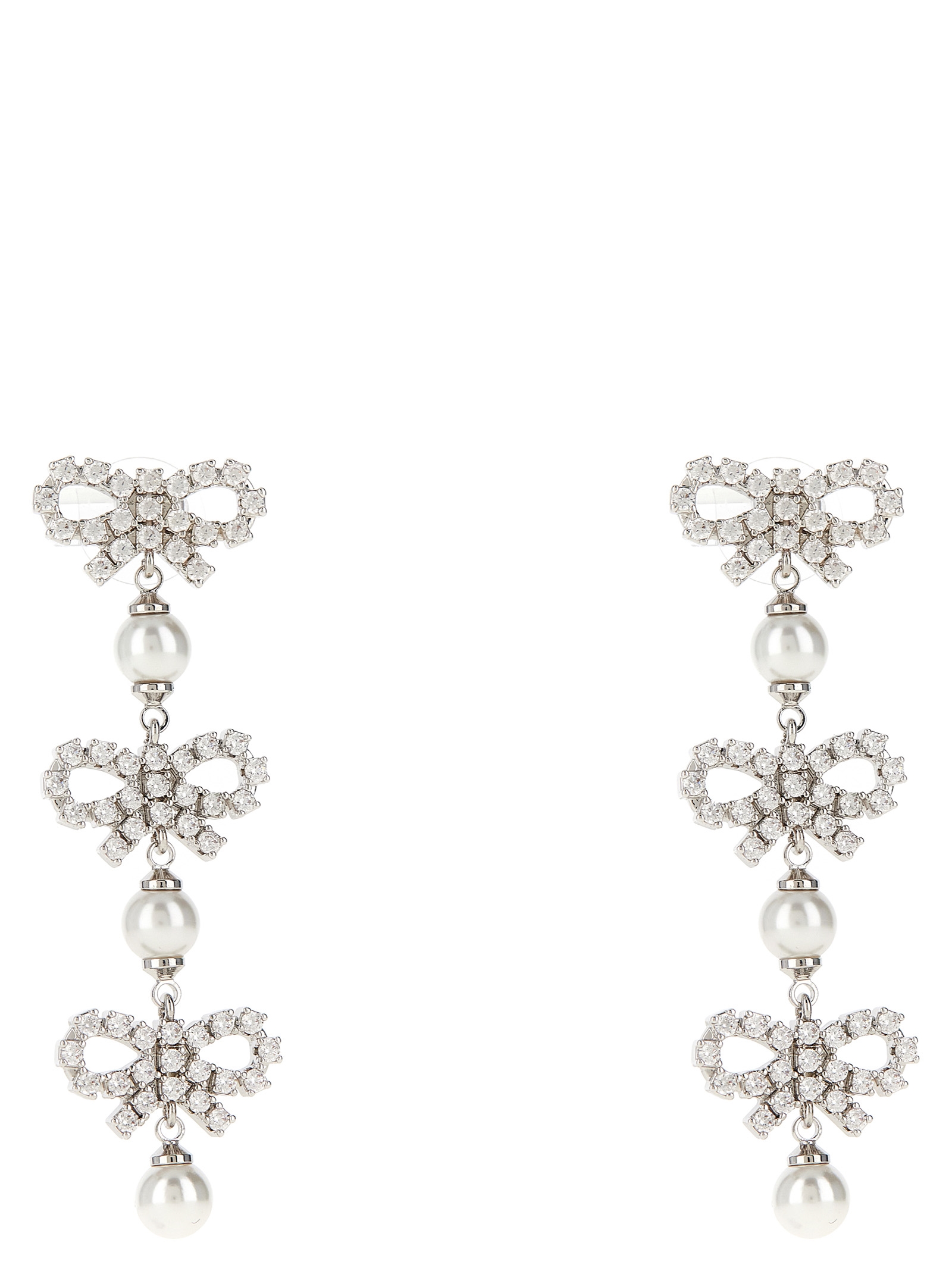 ‘Micro Bow Pearl Tiered’ earrings in silver-plated brass with micro crystals interspersed with fake pearls, butterfly closure.
