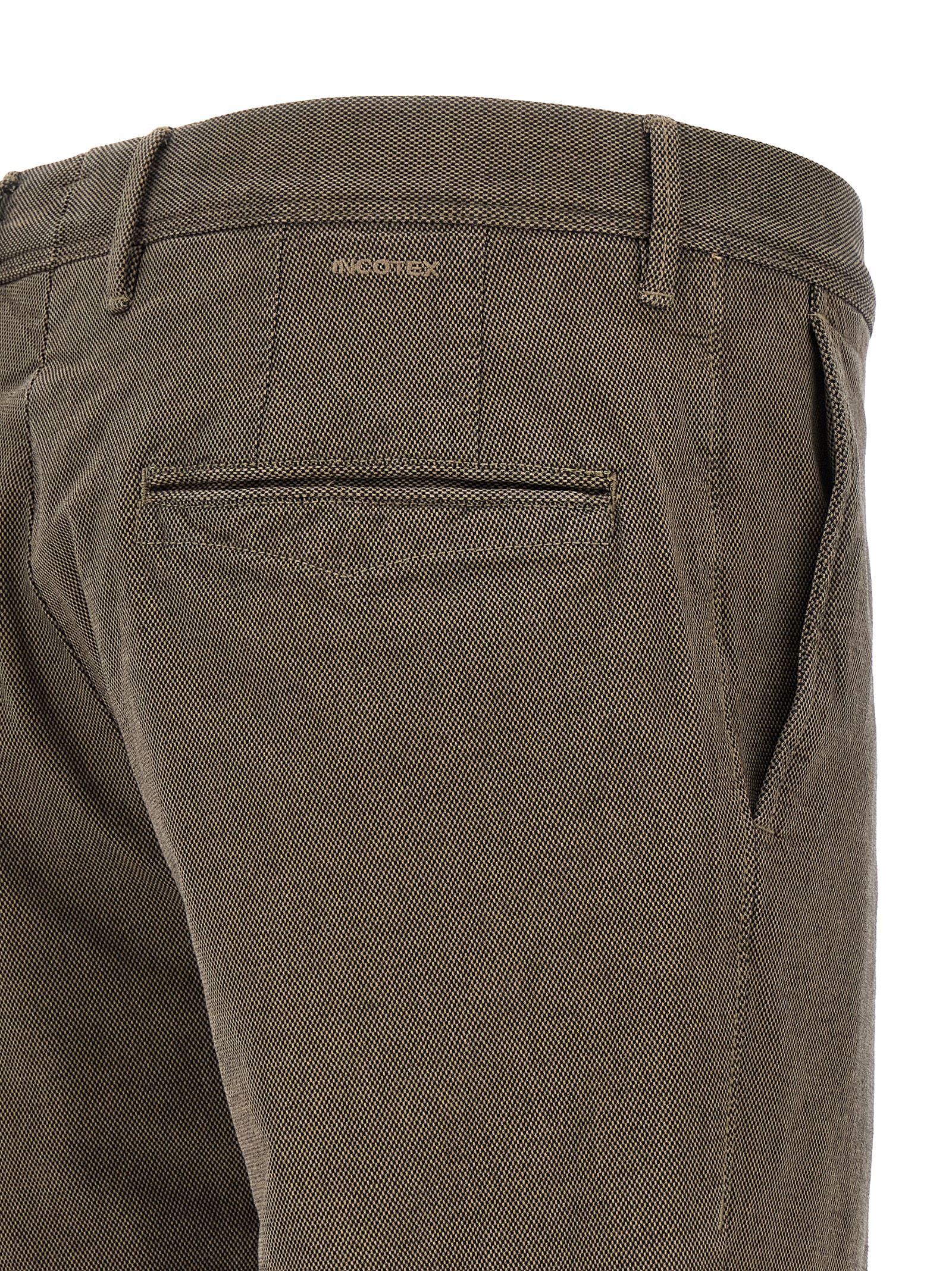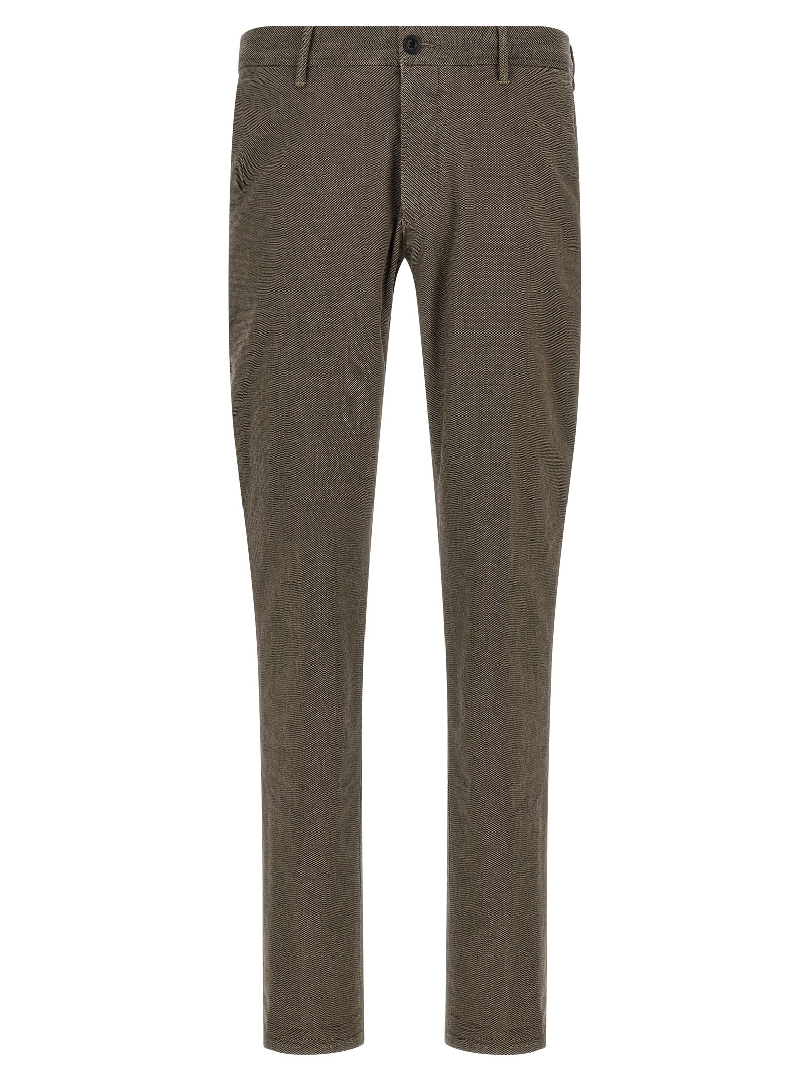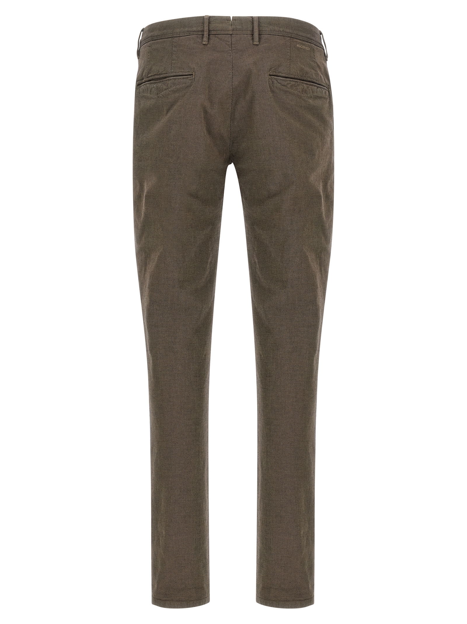 Micro check patterned cotton trousers, straight leg, stretched pleat, zip and front button closure, pockets.