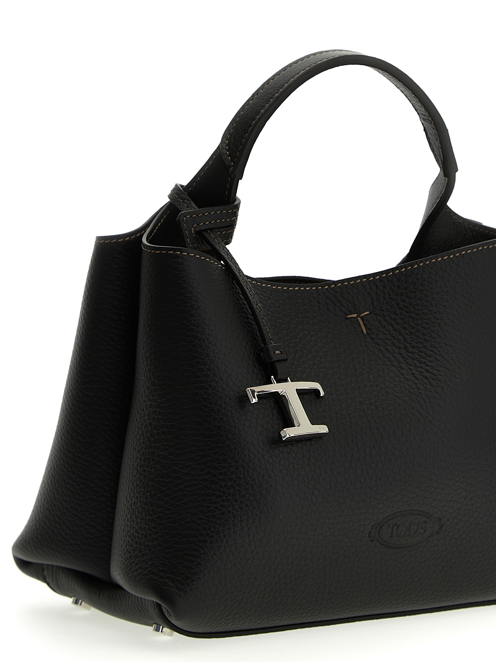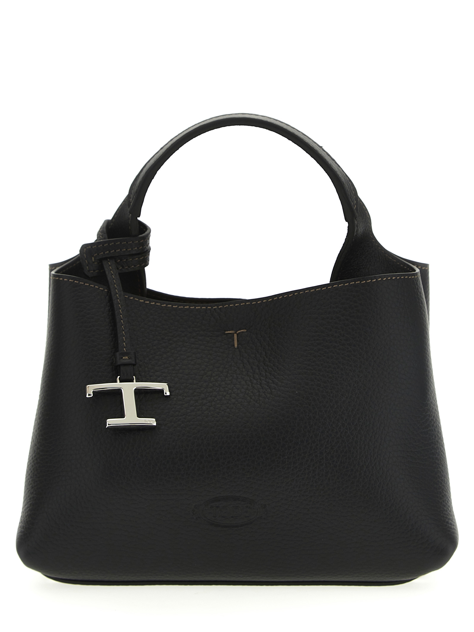 Micro grainy leather handbag with front embossed logo, contrast T-stitching, fixed handle, snap hook closure, metal details, adjustable and removable shoulder strap, removable metal ‘T Timless’ pendant.