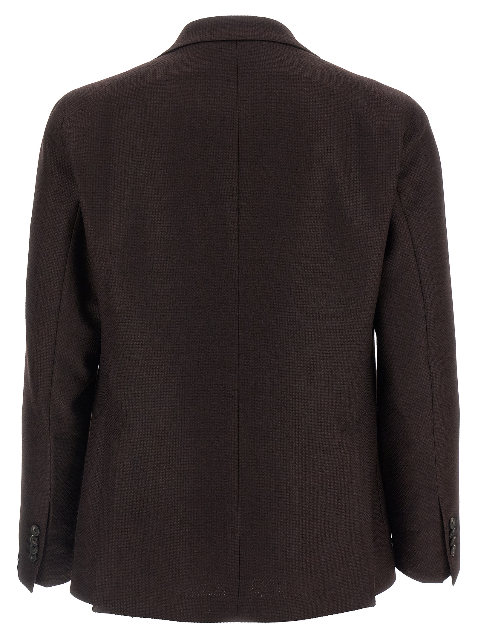 Super 100’s virgin wool blazer micro checkered weave, single-breasted unstructured model with front button closure, unlined, peak lapels with removable metal brooch, breast pocket, patch pockets, cuffs with open buttonholes, back vents.