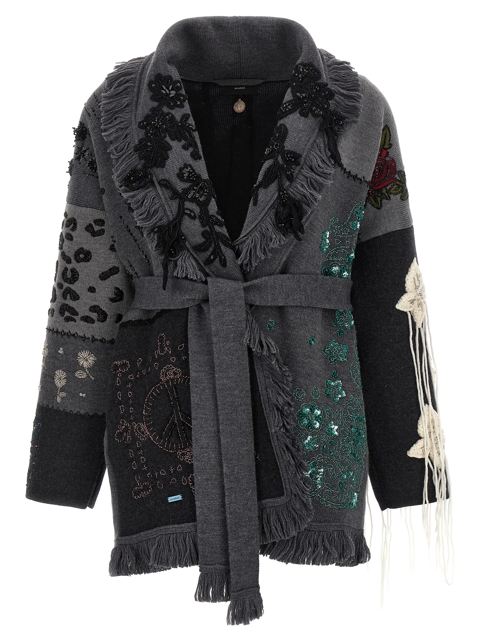 ‘Midnight in Manhattan’ wool blend cardigan embroidered with all-over beads, fringes, side pockets, adjustable and removable waist belt, long sleeves.
