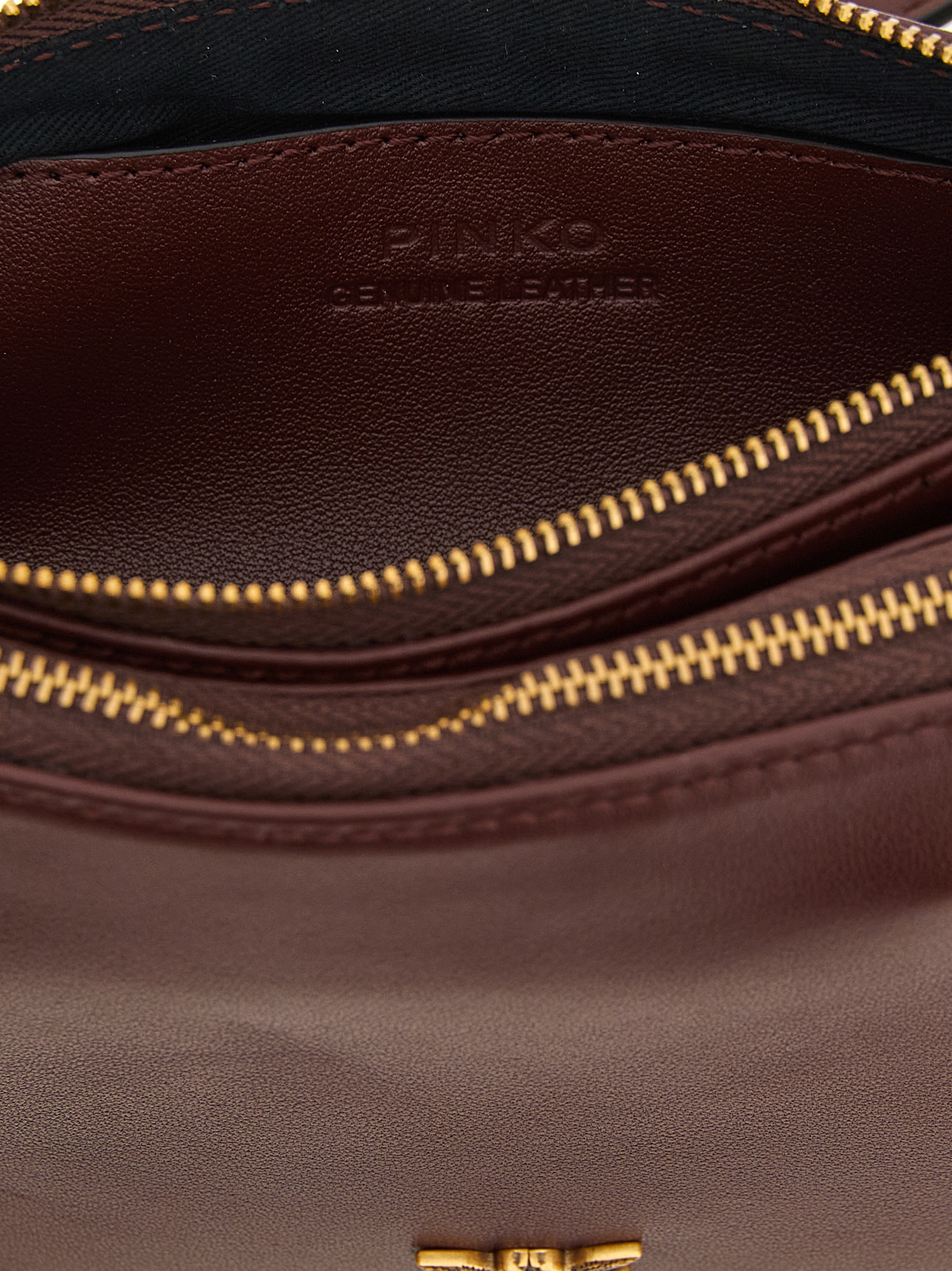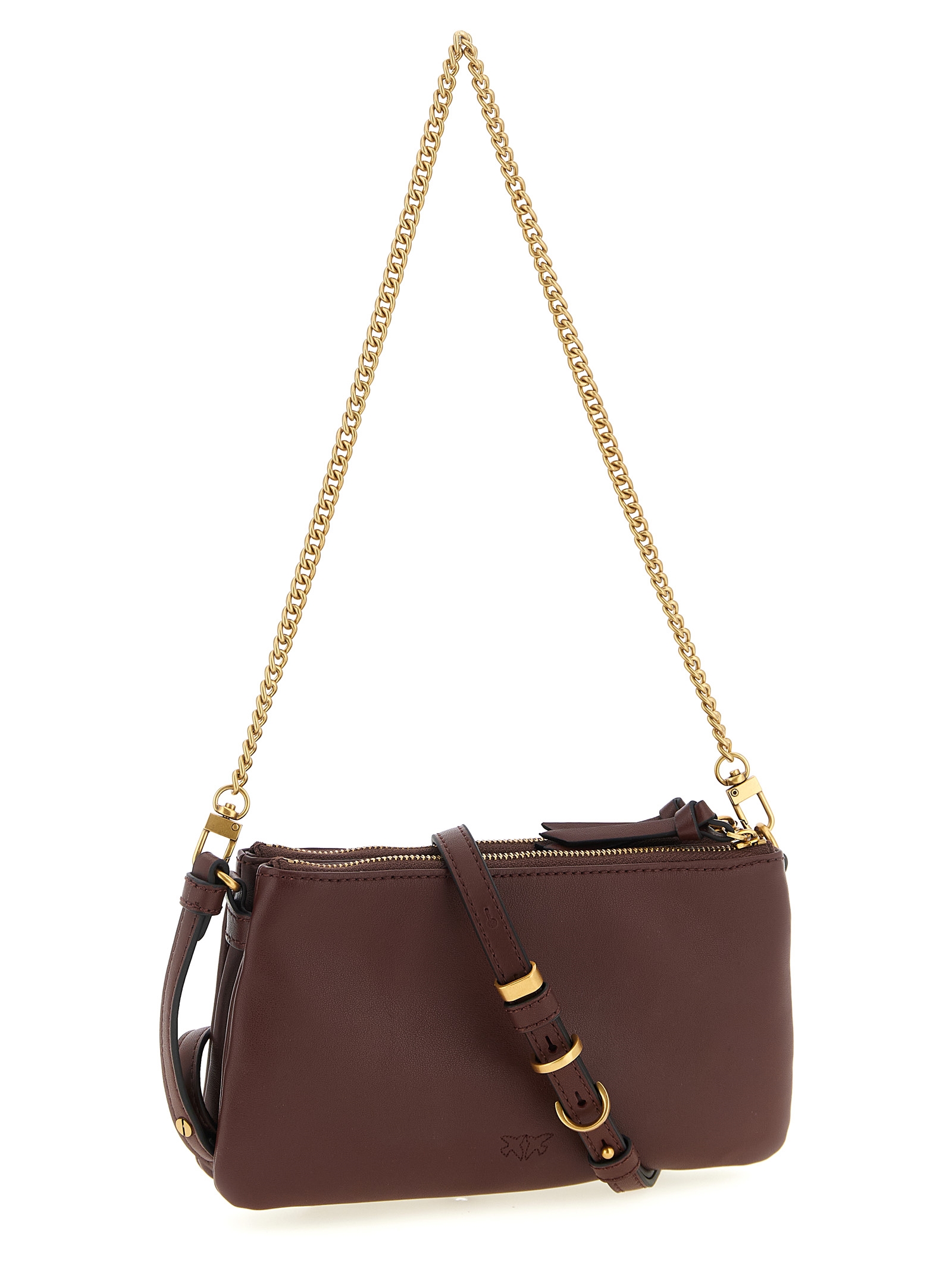 Small leather ‘Mini Double’ crossbody bag, rectangular construction with two bellows, front metal ‘Love Birds’ logo, top zip closure, cotton lining, removable chain handle, adjustable and removable leather shoulder strap.
