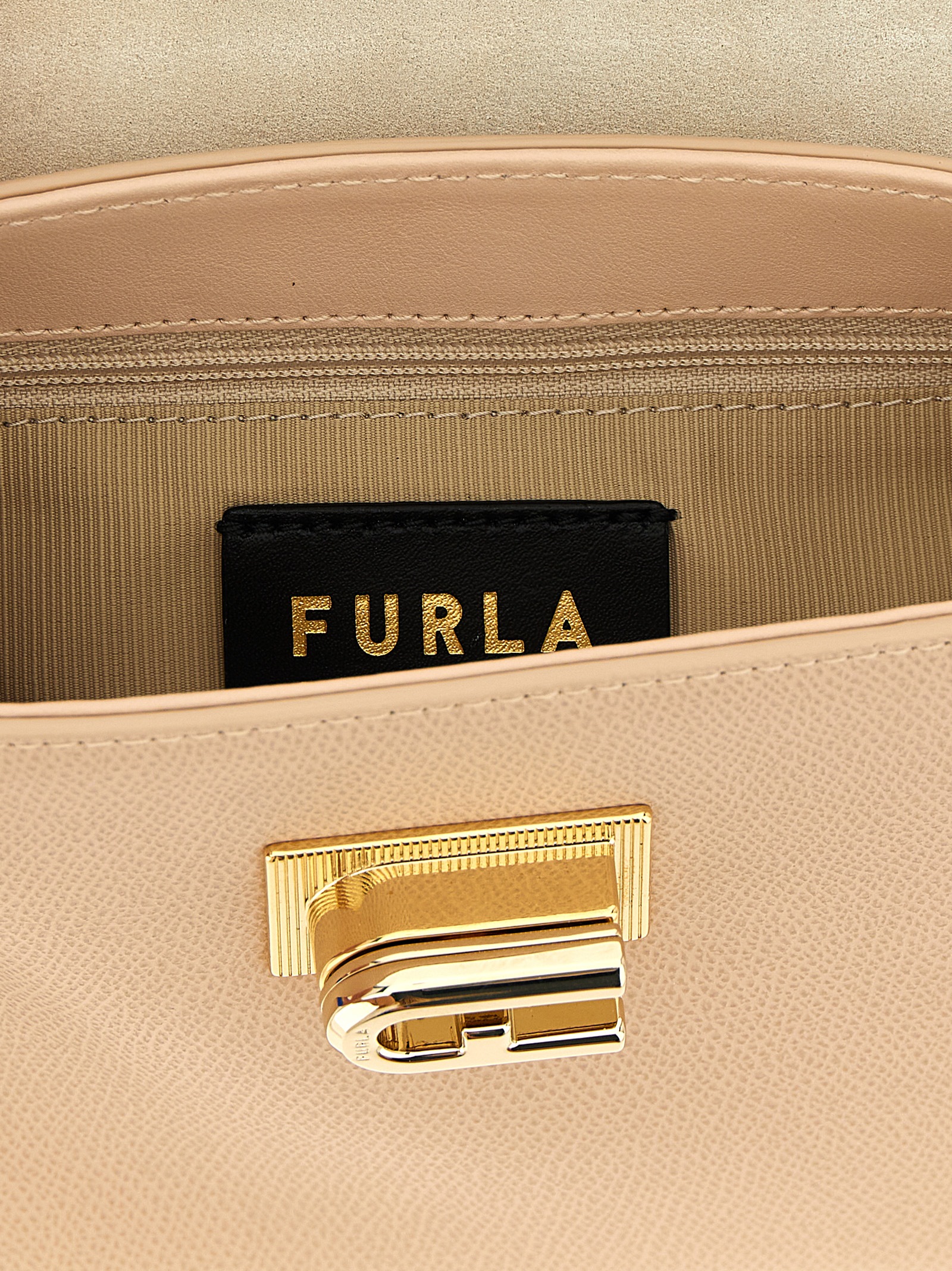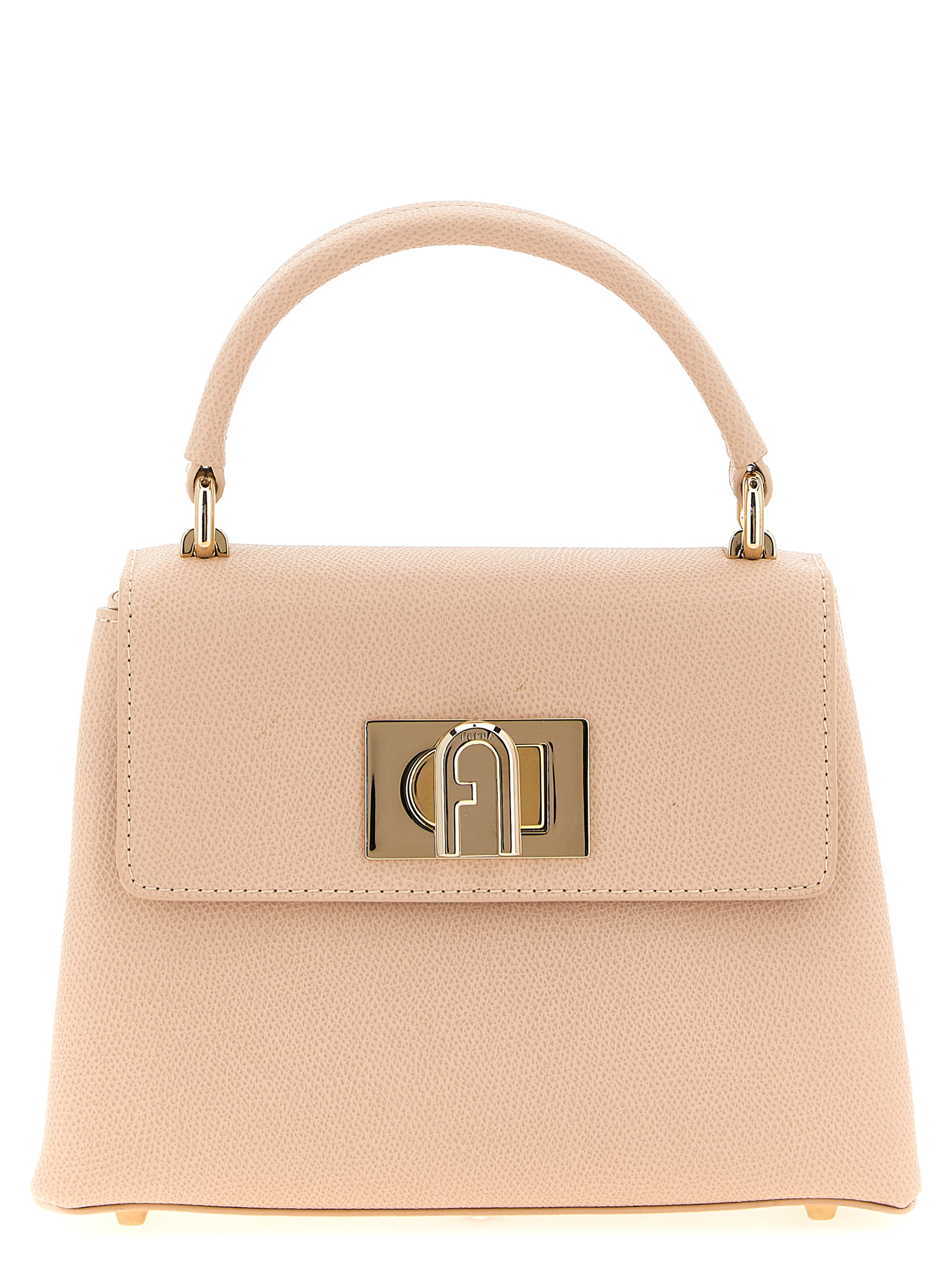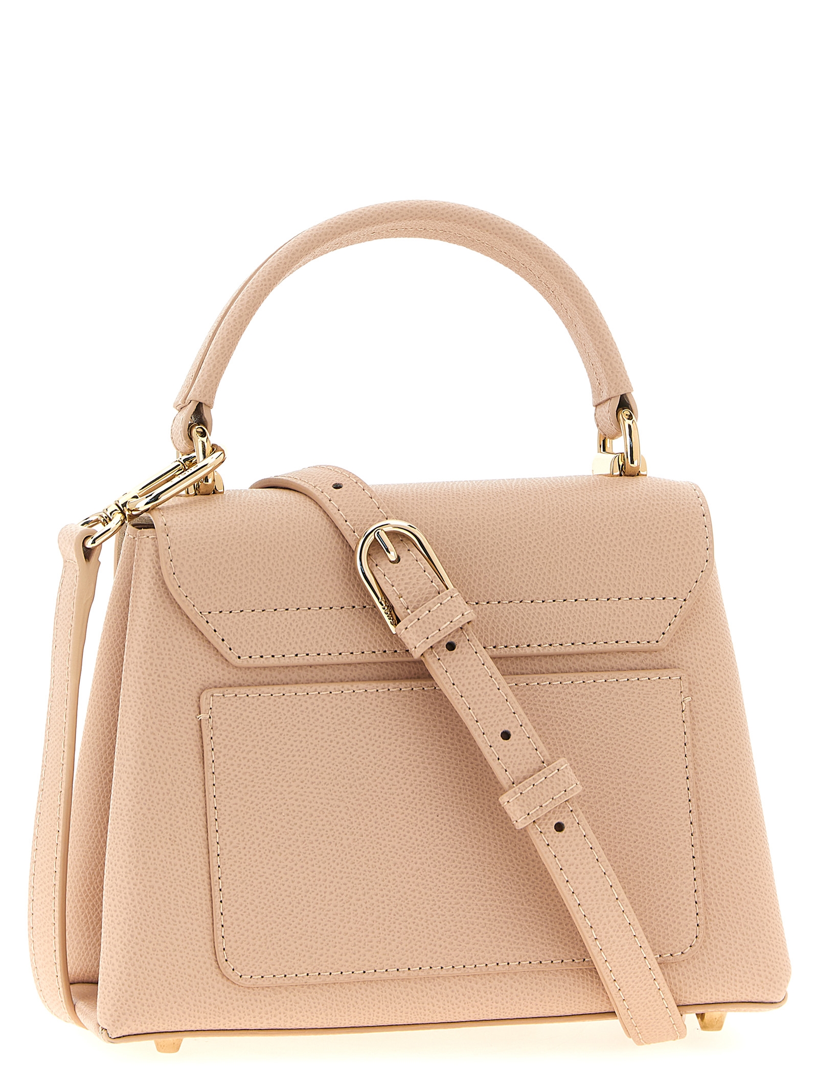 Printed leather bellows handbag with Arco logo turn lock, fixed handle and adjustable and removable shoulder strap.