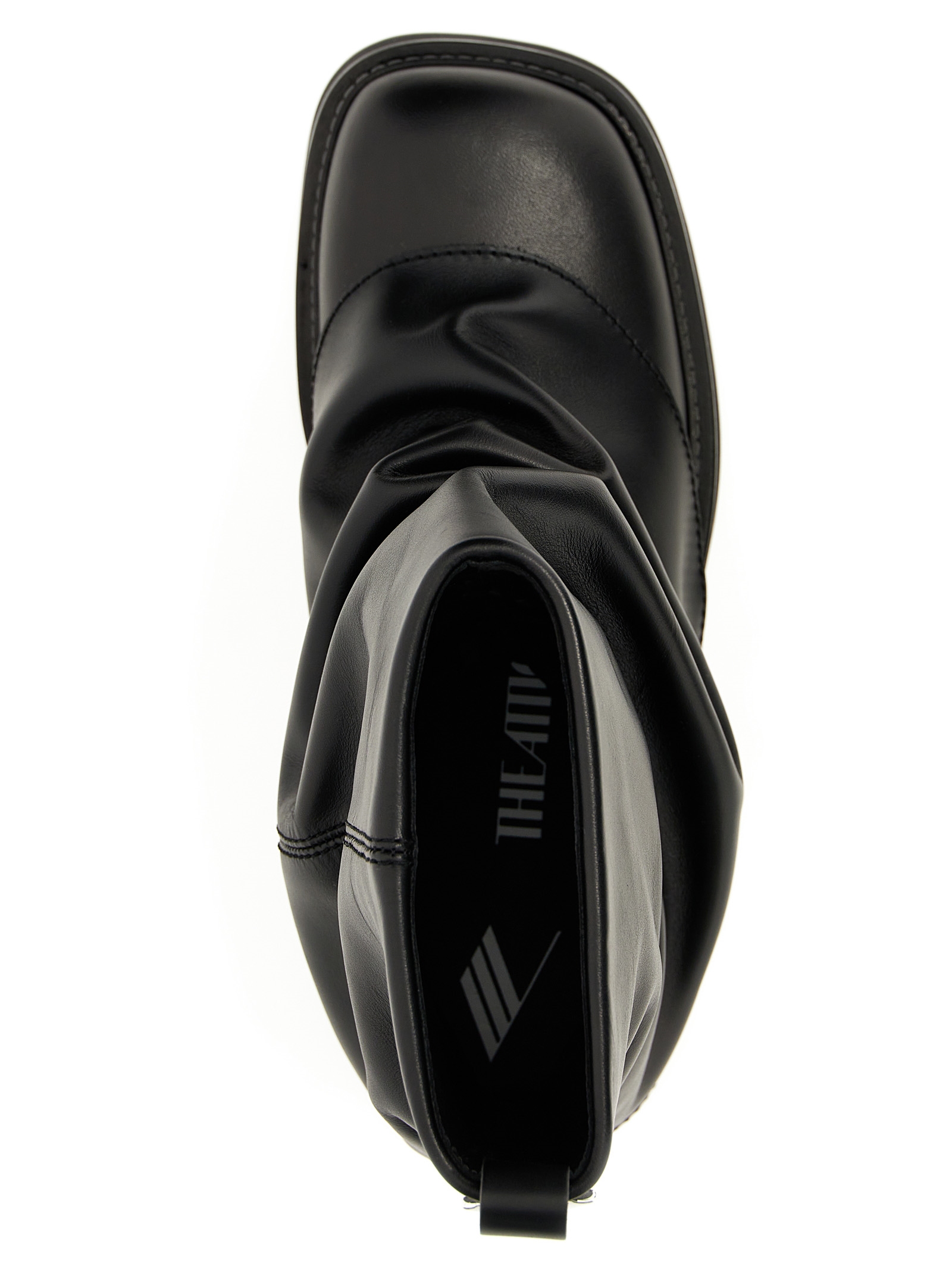 ‘Mini Robin Combat’ crinkled leather ankle boots with rounded toe, metal logo on the back tab, leather sole.