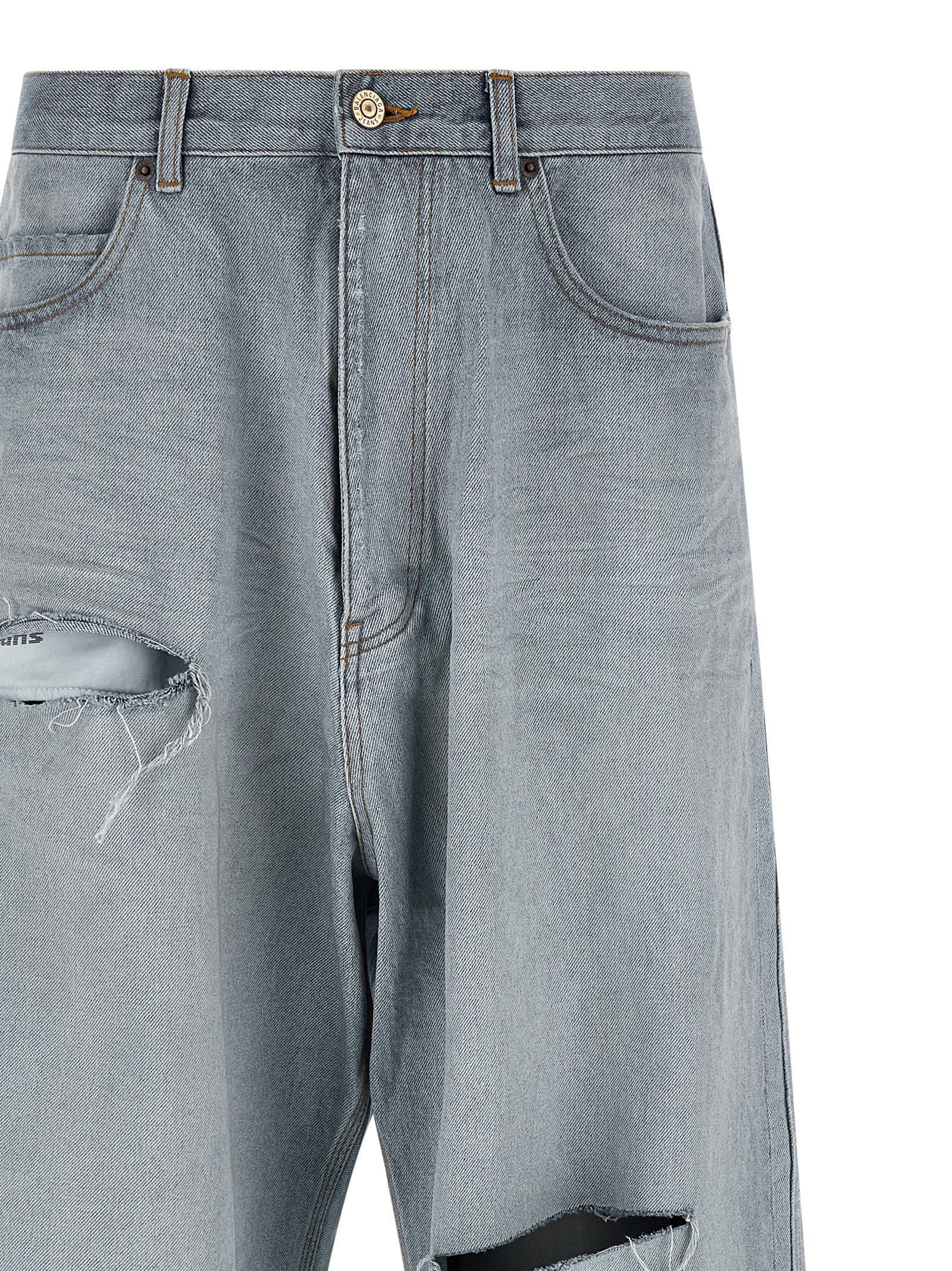 ‘Minimal Baggy’ washed and worn outback cotton denim jeans with rips, contrast stitching, extra wide leg, low crotch, zip and button closure, five pockets, back logo tag.