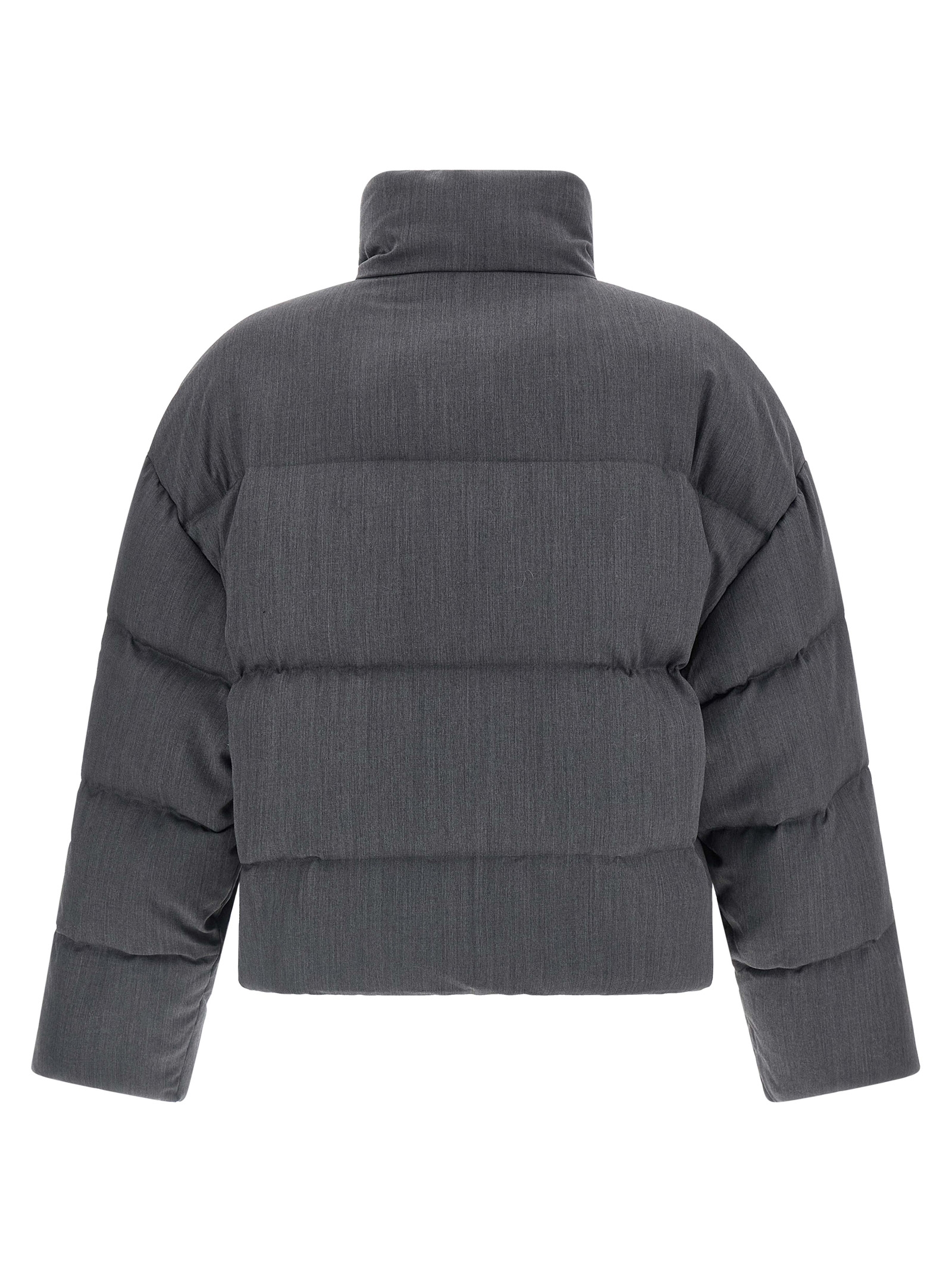 ‘MML Puffer’ quilted mélange wool down jacket with goose feather padding, standing collar, front zip and velcro closure, pockets, long sleeves with windproof cuffs and dropped shoulders, drawstring on the hem.
