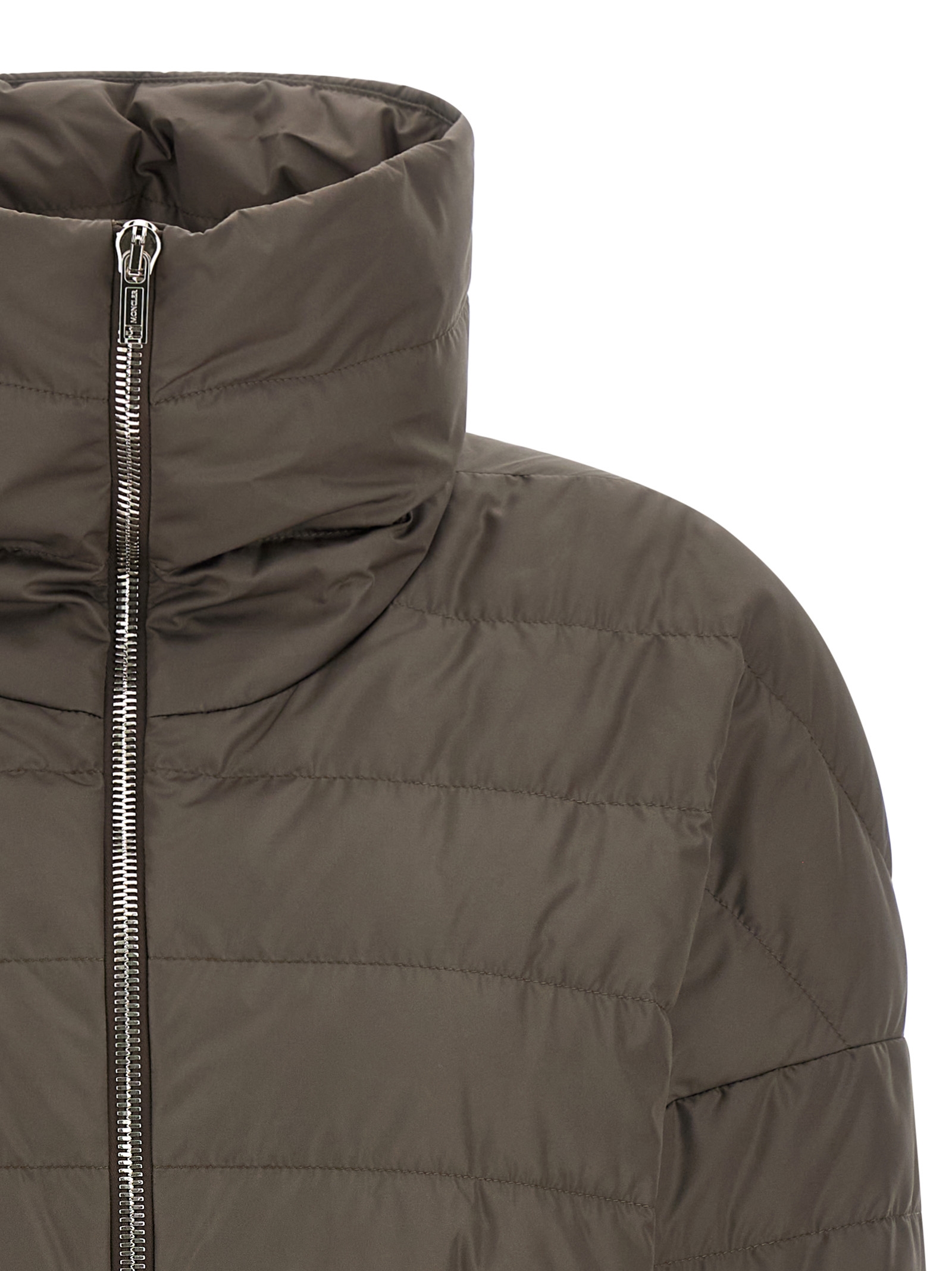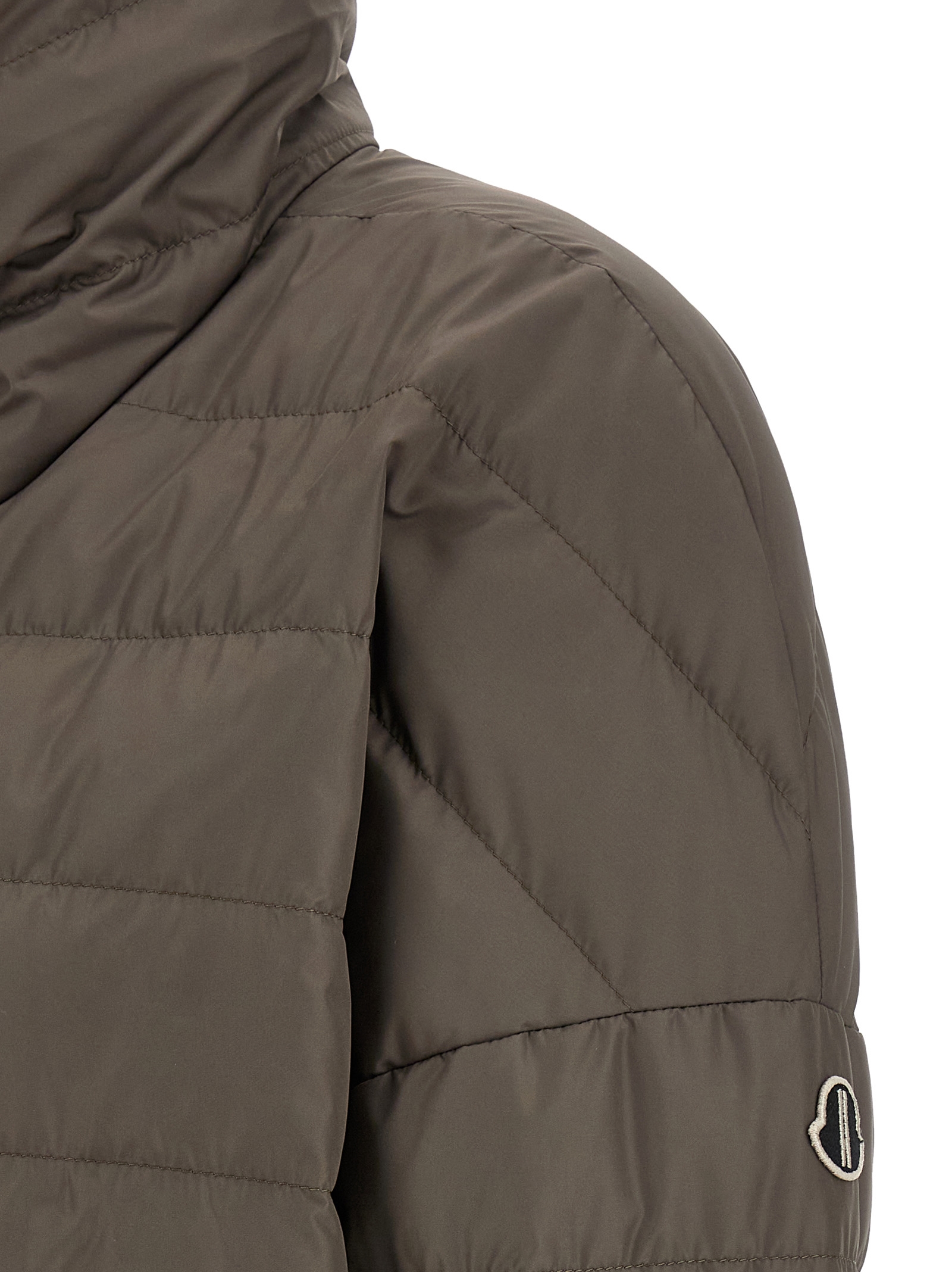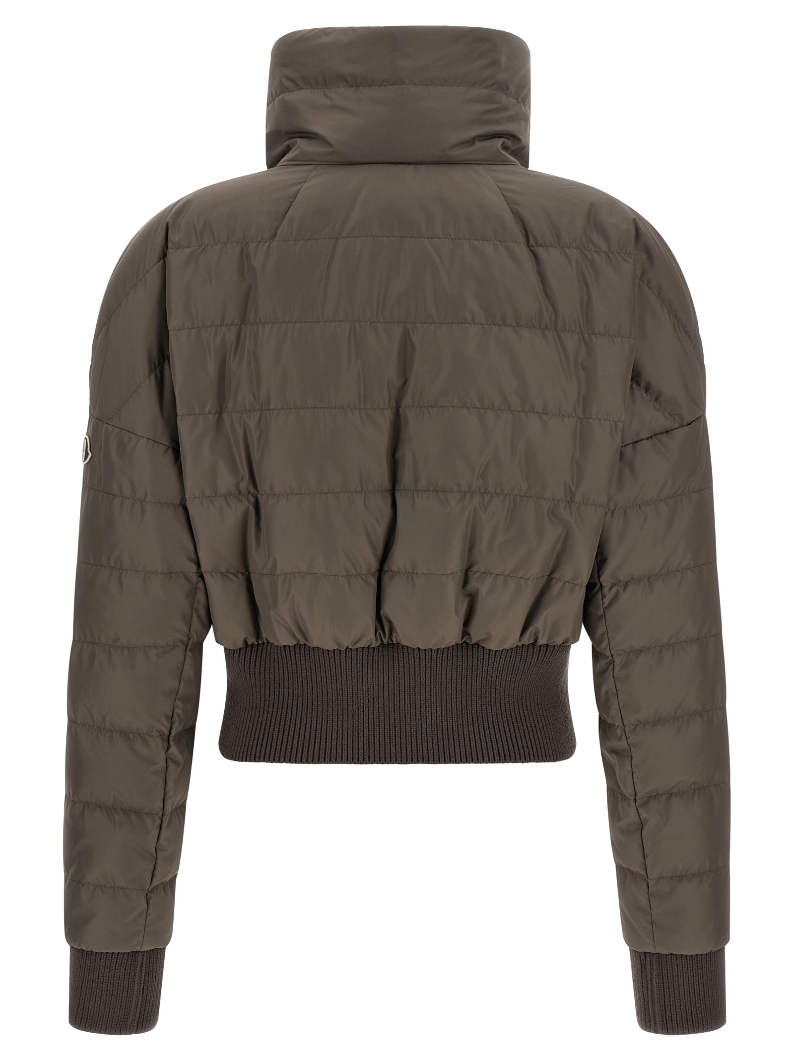 Moncler + Rick Owens ‘Cropped’ down jacket in quilted saison longue with goose down padding, tone-on-tone ribbed stretch knit details, crop style, crater neck, front zip closure, long cuffed sleeves, dropped shoulders and logo patch appliquรฉ, and headband.eadband.