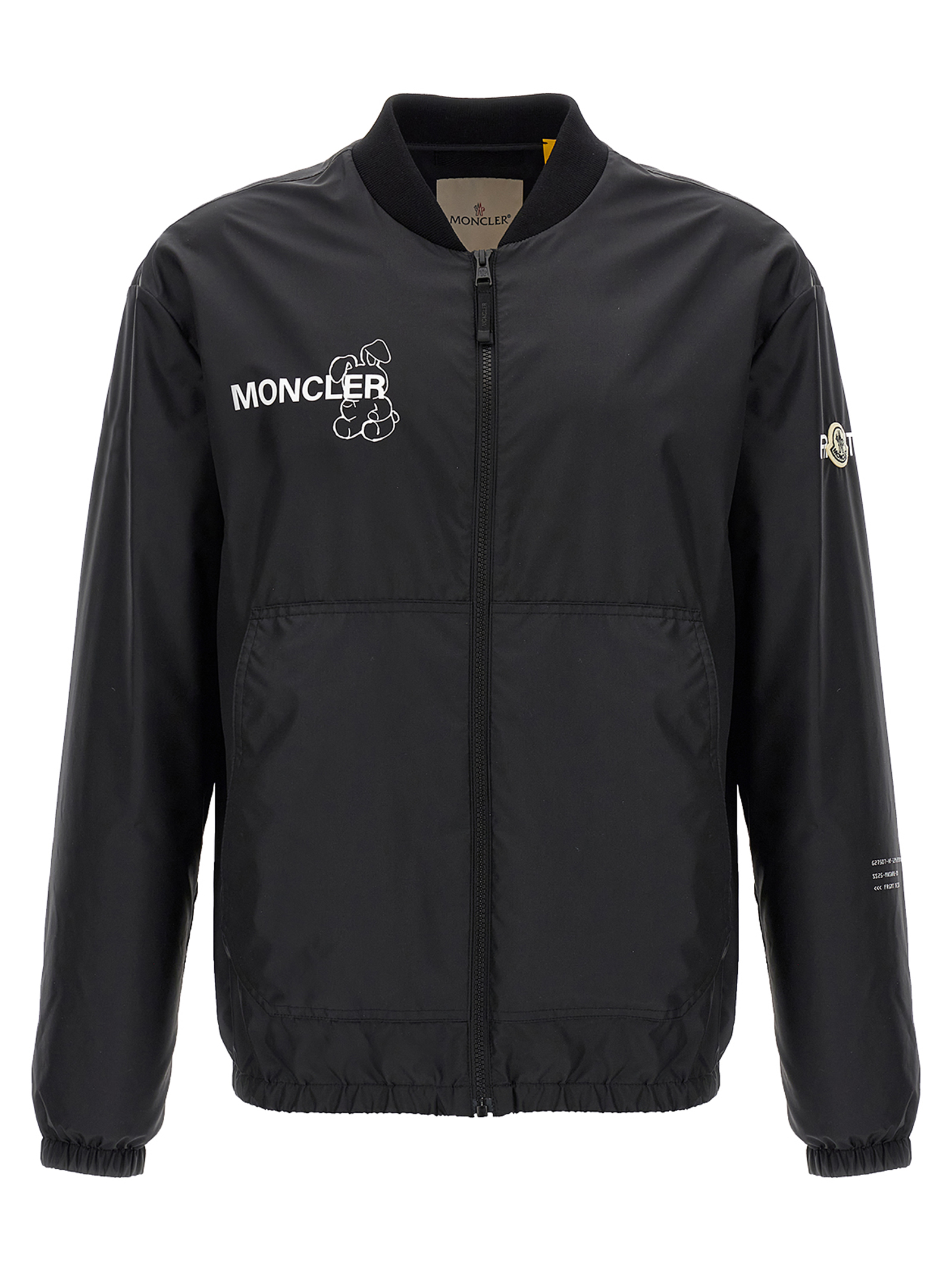 Moncler x FRGMT ‘Ostria’ bomber jacket in water-repellent coated nylon canvas with prints at the back and on the sleeves, ribbed cotton collar, zip closure, pockets, long sleeves with elastic cuffs, felt logo patch, and elastic hem.