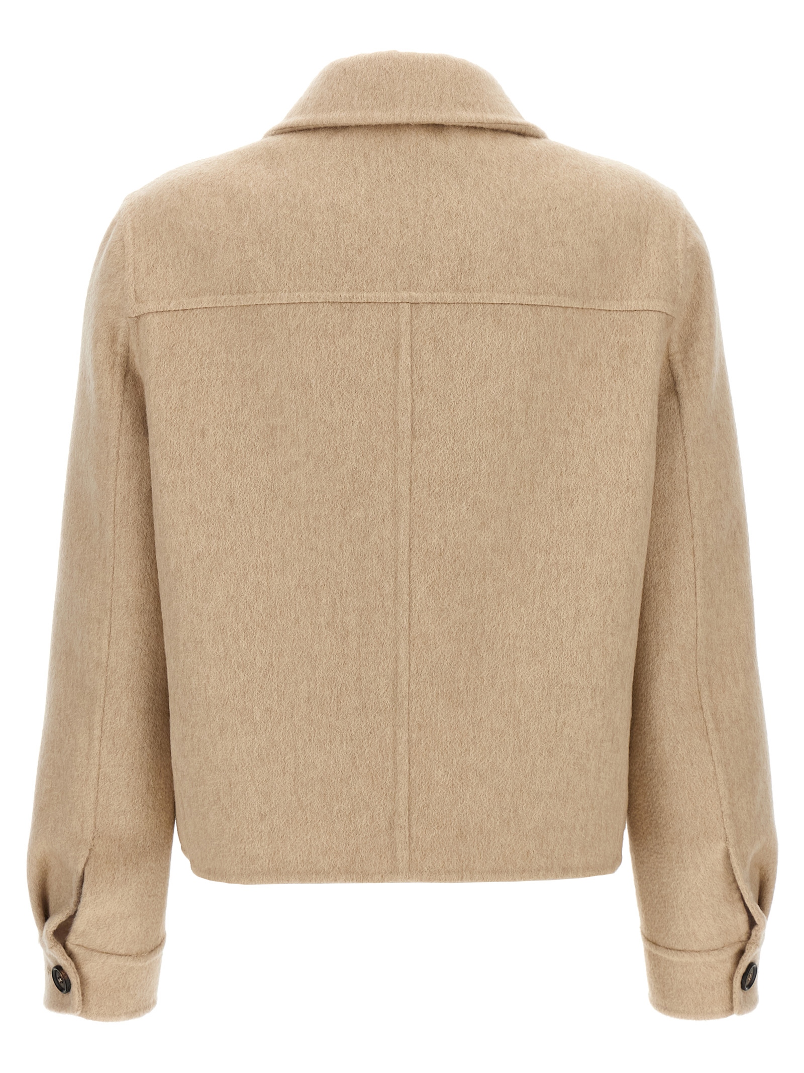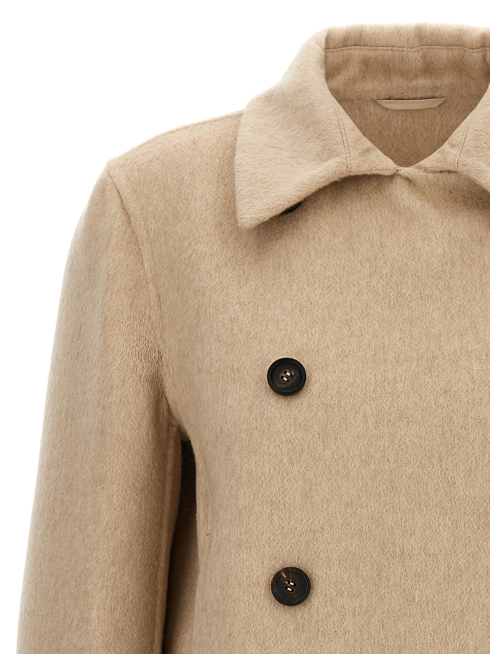 Double-breasted cashmere short coat with button closure, collar with Monile detail on the back, pockets, long sleeves with cuffs, unlined.