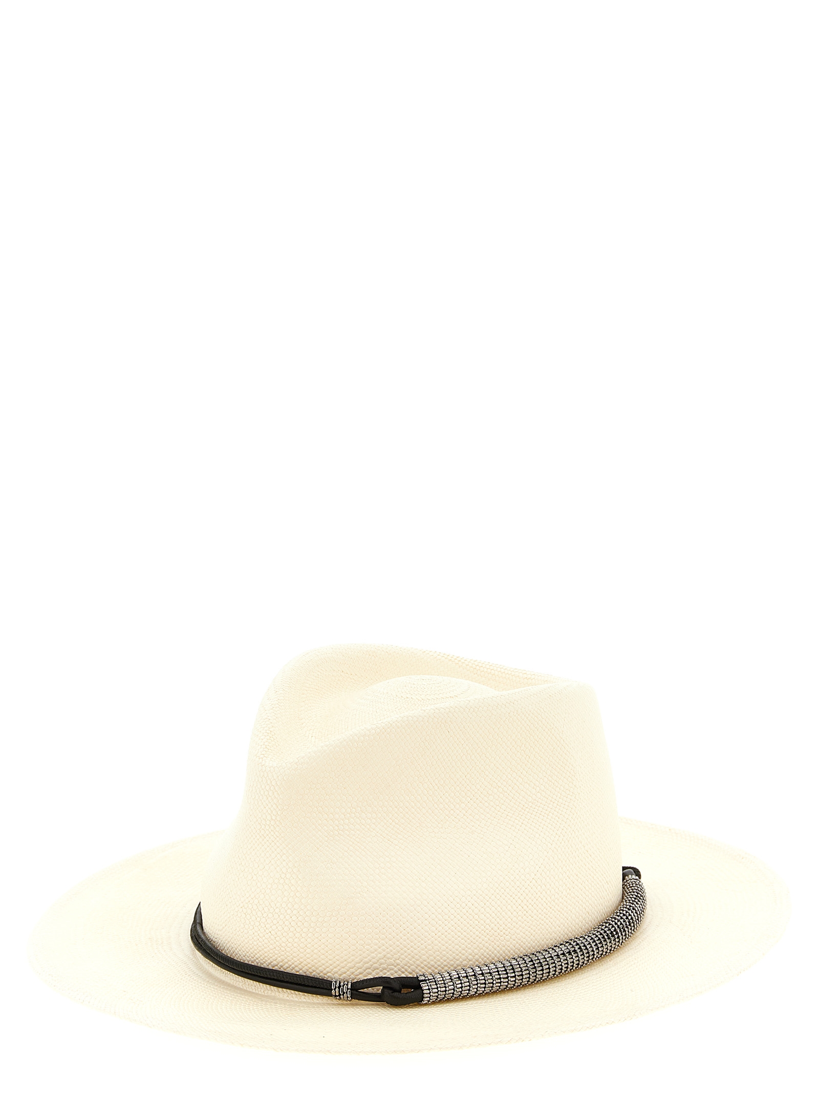 Woven raffia hat, fedora model, tubular leather band and Monile.