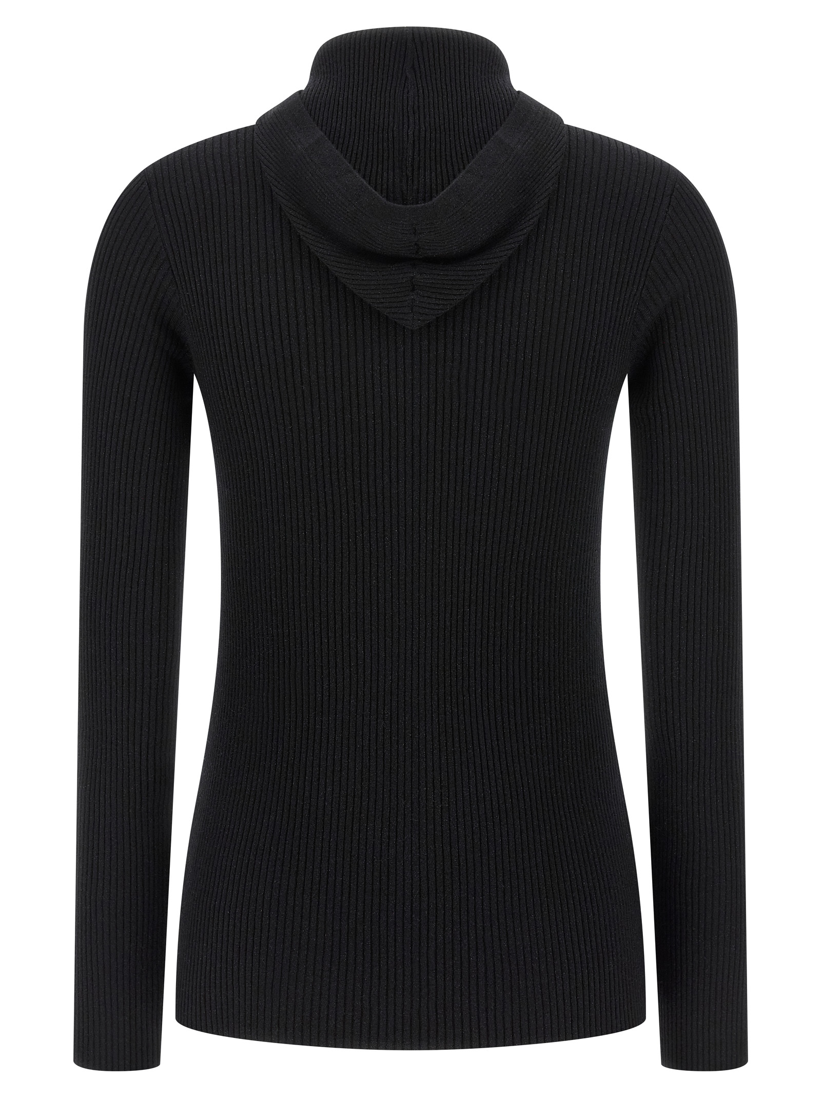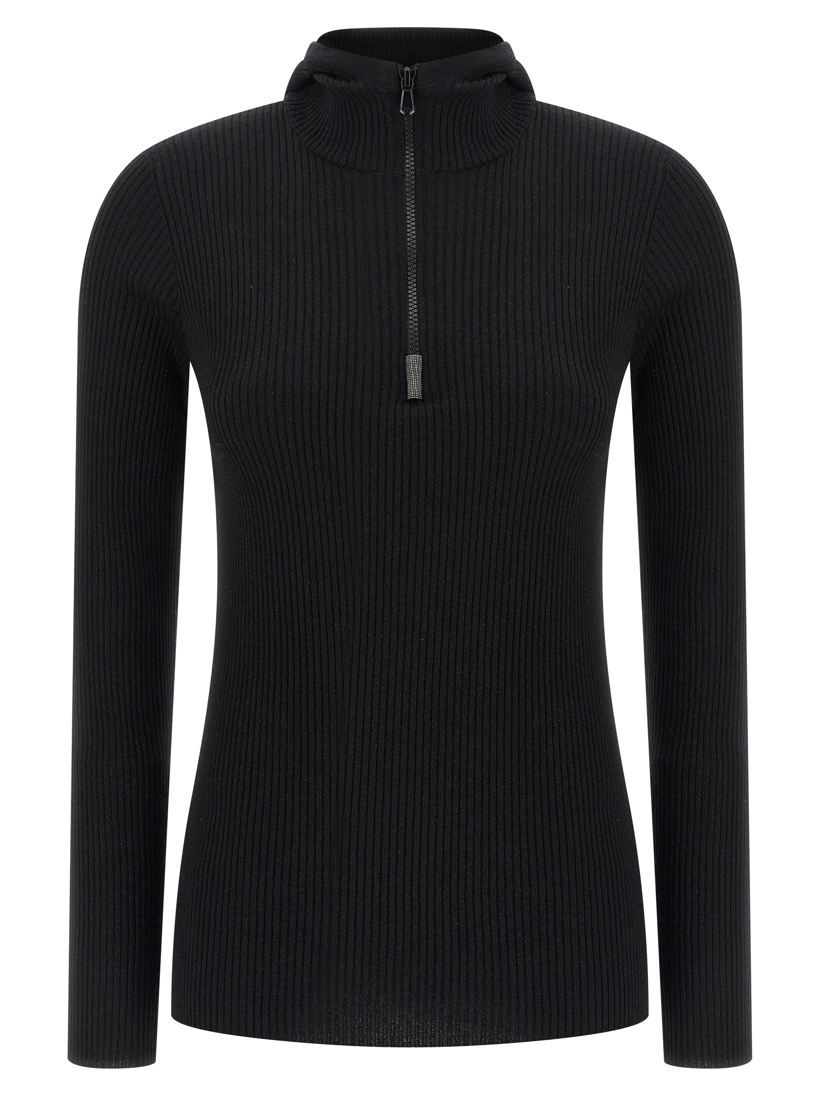 Ribbed cashmere and stretch silk blend hooded sweater with lamé thread, half zip with Monile detail, long sleeves and raw cut hem.