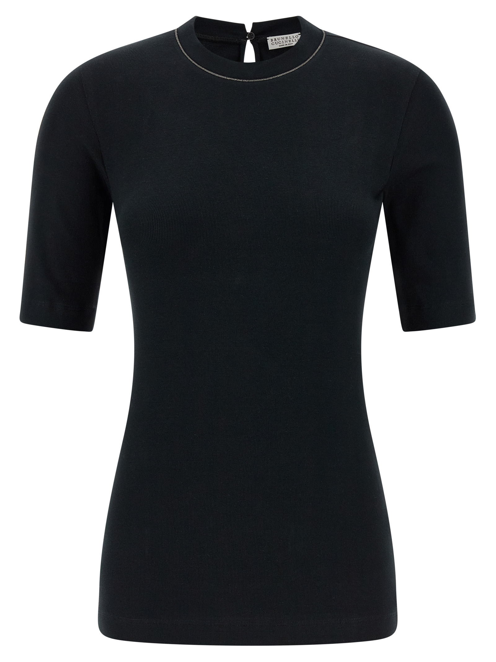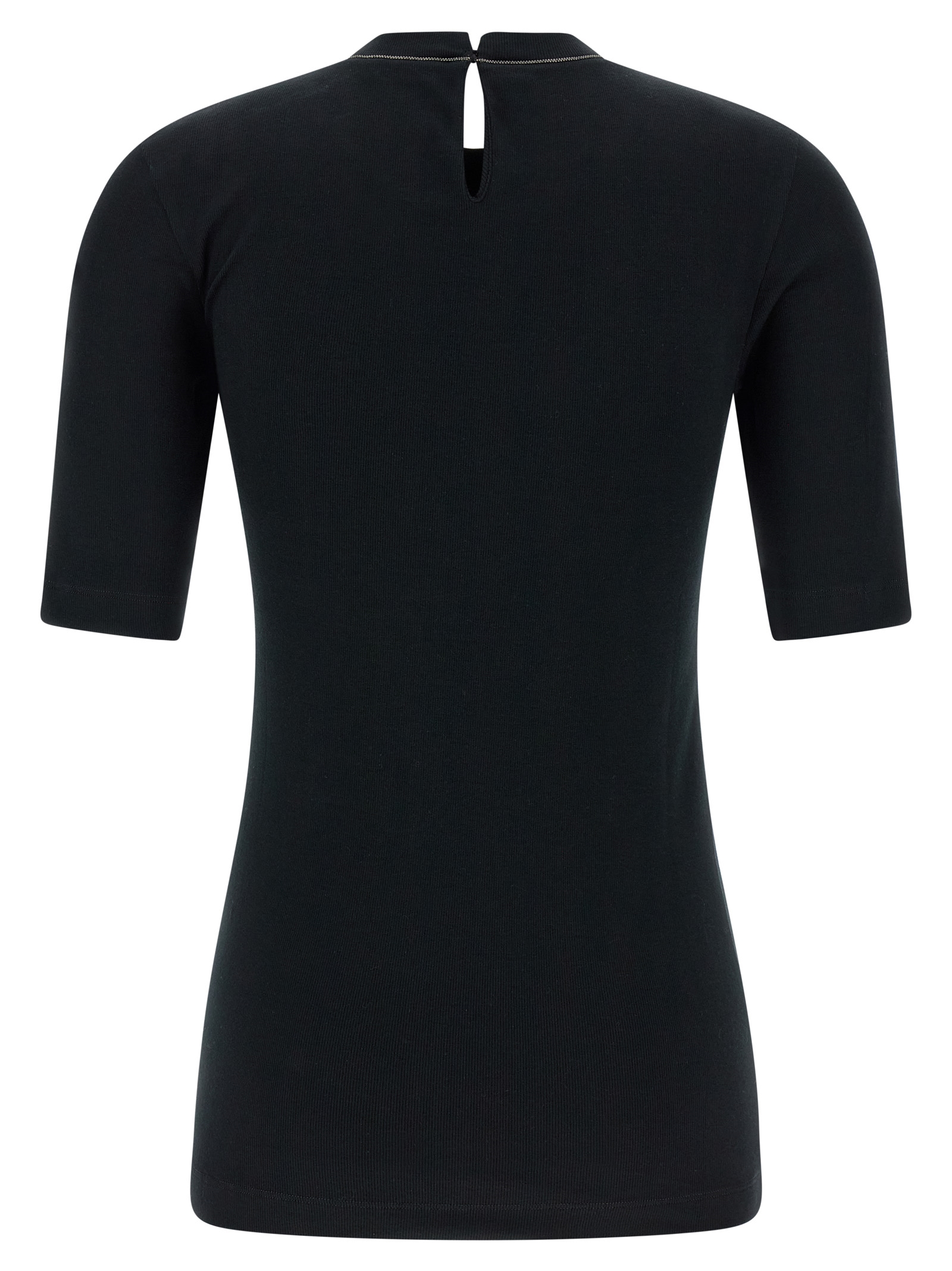 Ribbed stretch cotton jersey T-shirt with Monile detail, back button closure, and short sleeves.