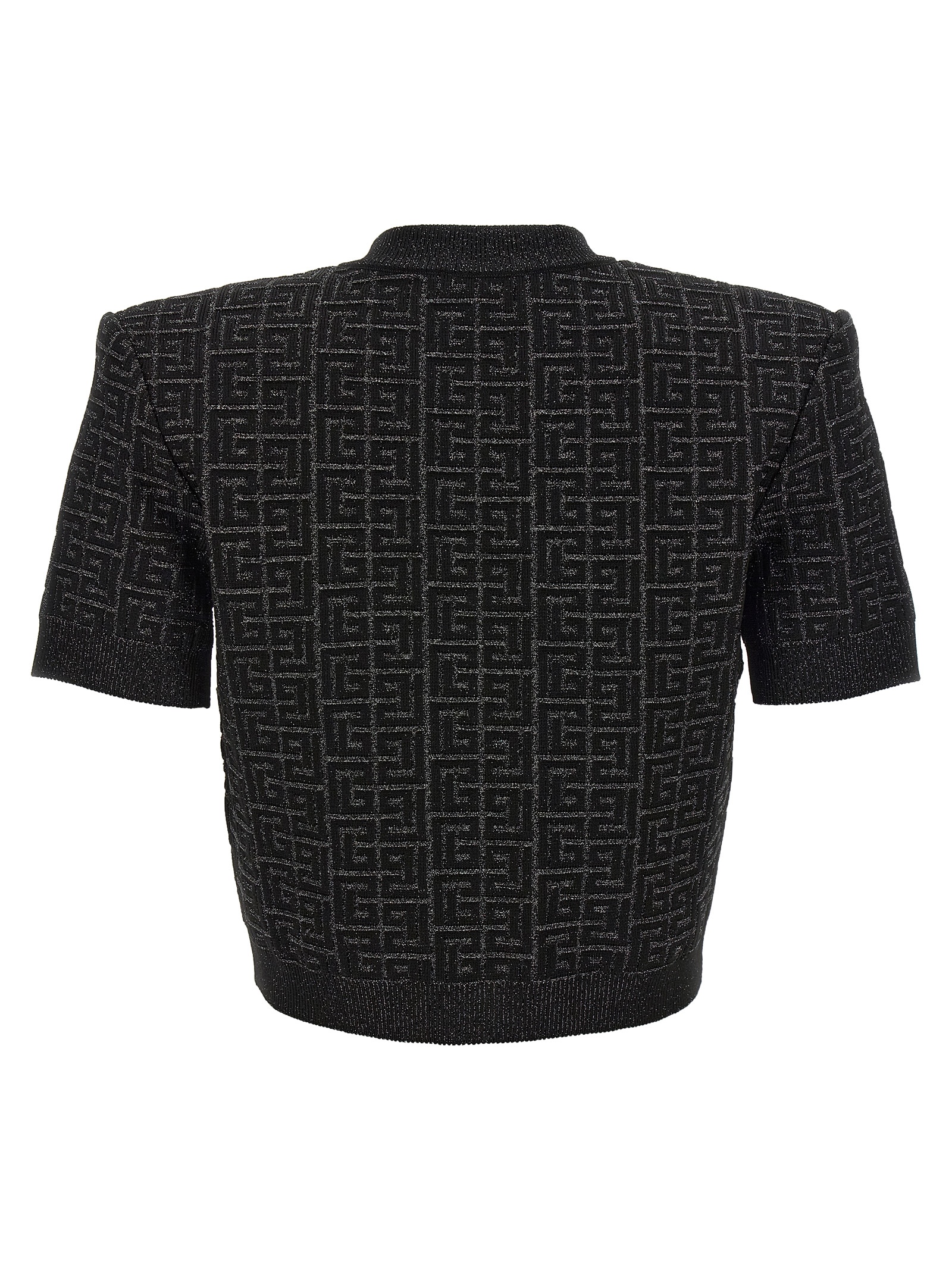 Cropped cardigan in lurex viscose blend, all-over ‘Monogram’ pattern, logo button closure, padded shoulders, short sleeves.