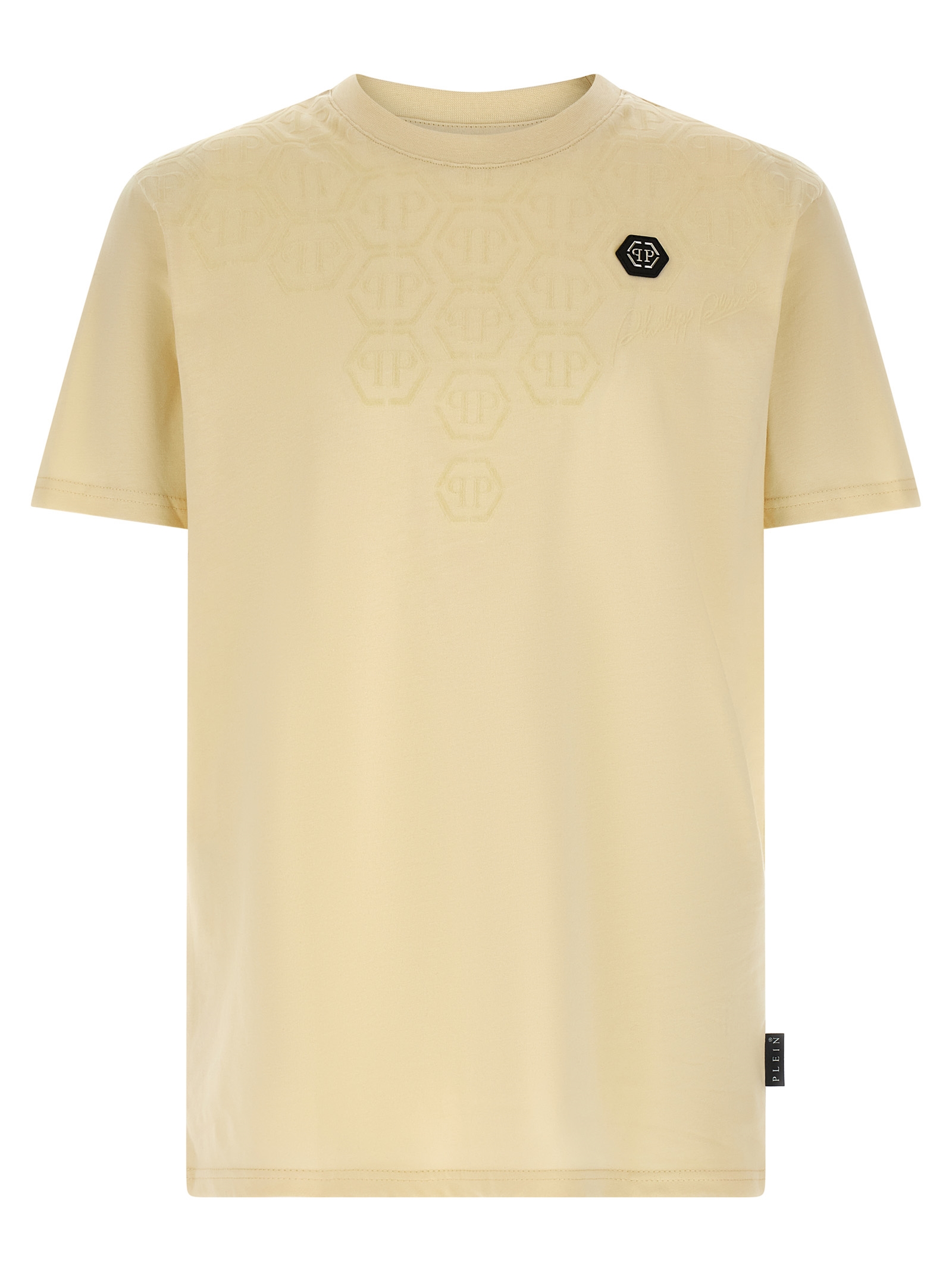 Cotton t-shirt with tone-on-tone flocked monogram logo and front ‘Hexagon’ patch, crew neck, and short sleeves.