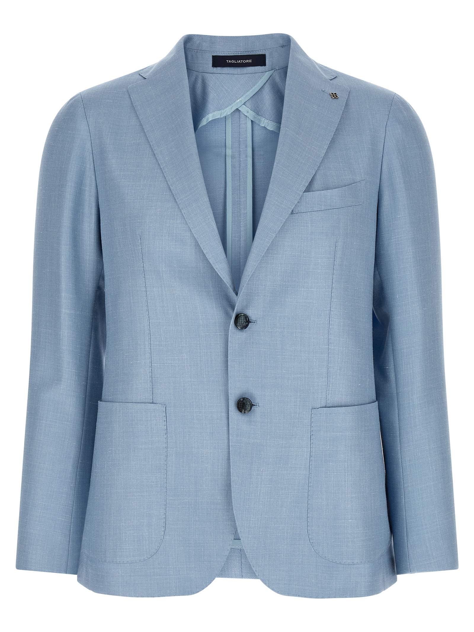 ‘Montecarlo’ single-breasted unstructured blazer in virgin wool, silk and linen blend with front button closure, mirror lapels with removable metal brooch, chest pocket, patch pockets, unlined, two inner pockets, cuffs with open buttonholes, back vents.