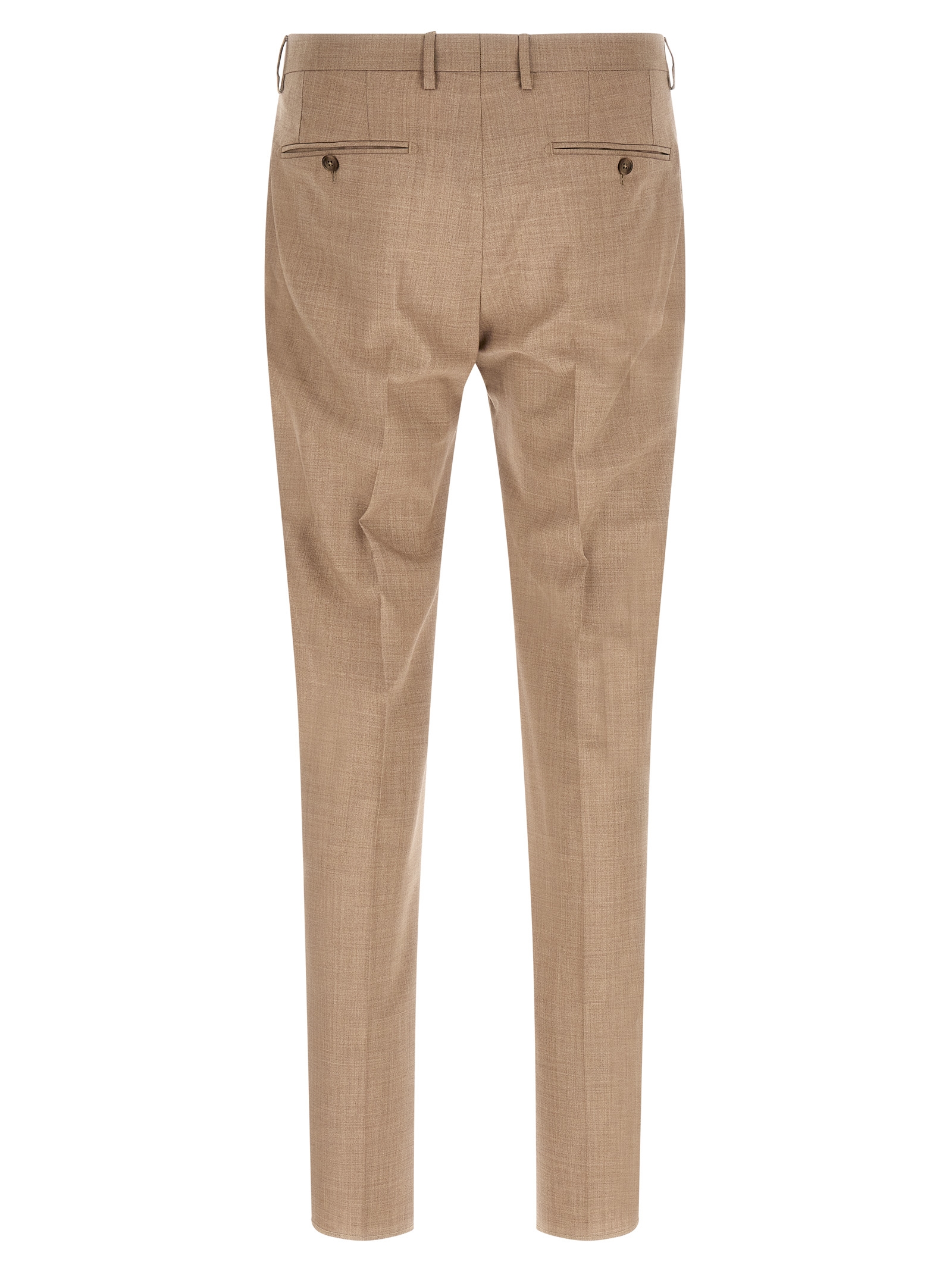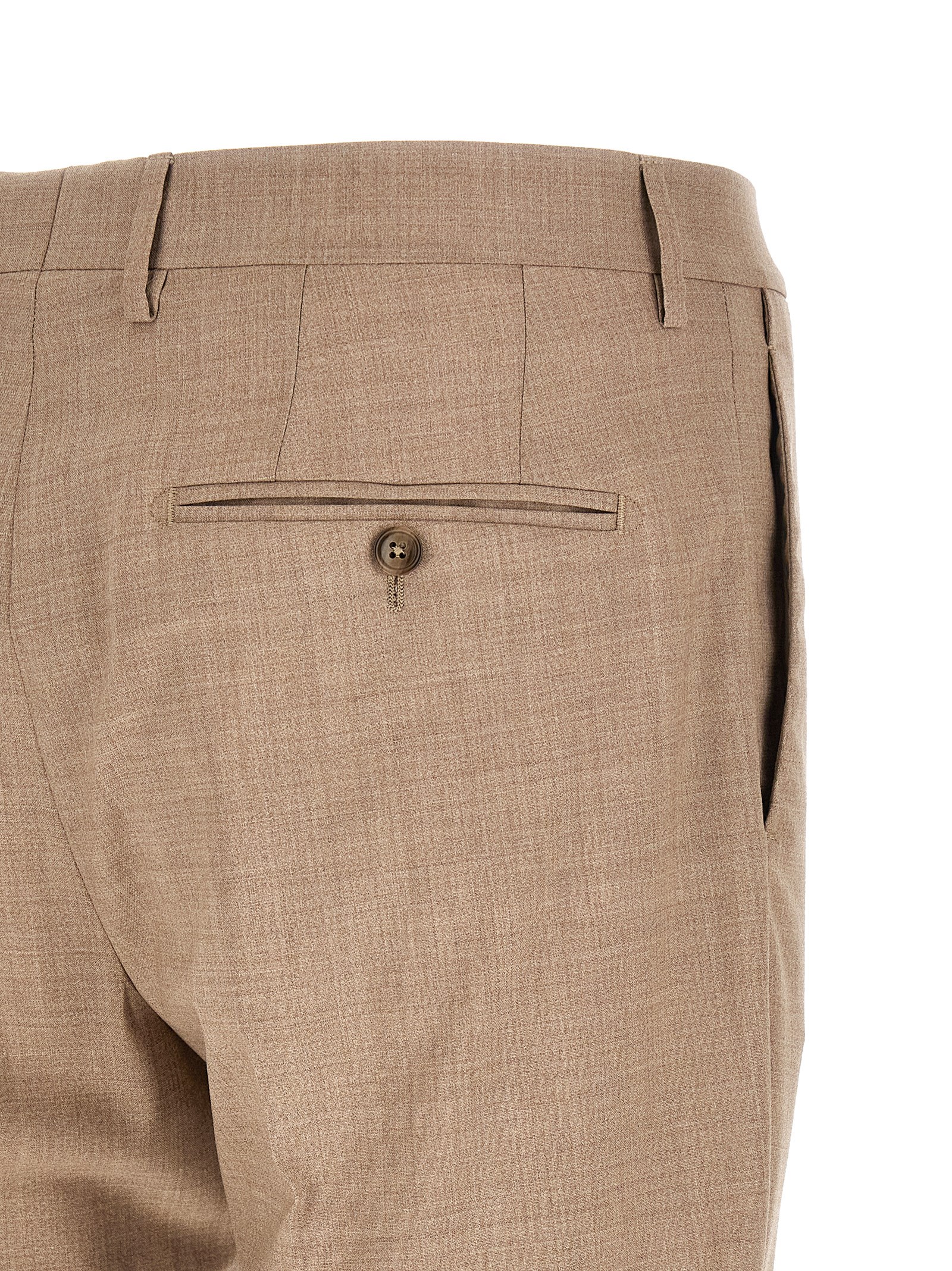 ‘Montecarlo’ dress in virgin wool and mélange silk blend, consisting of single-breasted blazer with front button closure, mirror lapels with removable metal brooch, breast pocket, flap pockets, cupro lining, four inner pockets, cuffs with open buttonholes, back slits and trousers with stretched pleat, front ‘americane pockets’, back welt pockets, front zip and button closure, cotton lining.