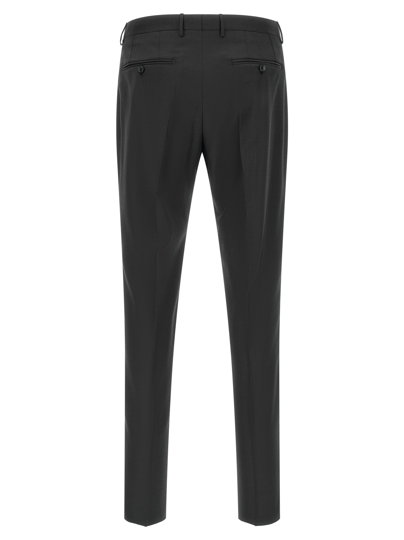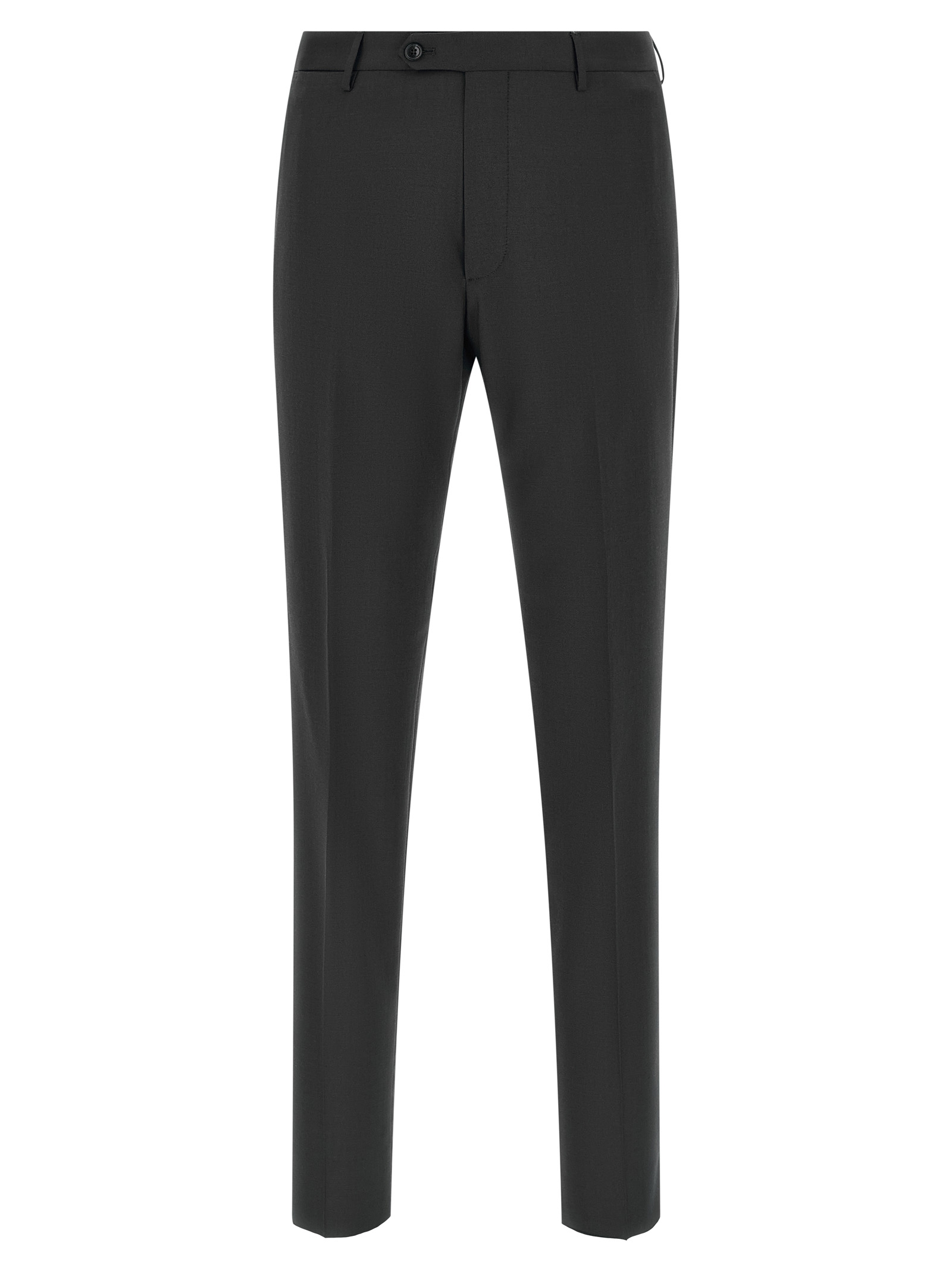 Super 110’s mélange virgin wool ‘Montecarlo’ dress, consisting of a single-breasted deconstructed blazer with front horn button closure, tooth lapels with removable metal brooch, breast pocket, flap pockets, cupro half-lining, three inner pockets, buttonhole cuffs, back slits and trousers with ironed crease, front ‘americane pockets’, back welt pockets, front zip and button closure, cotton lining, leg bottoms with hem to be finished.