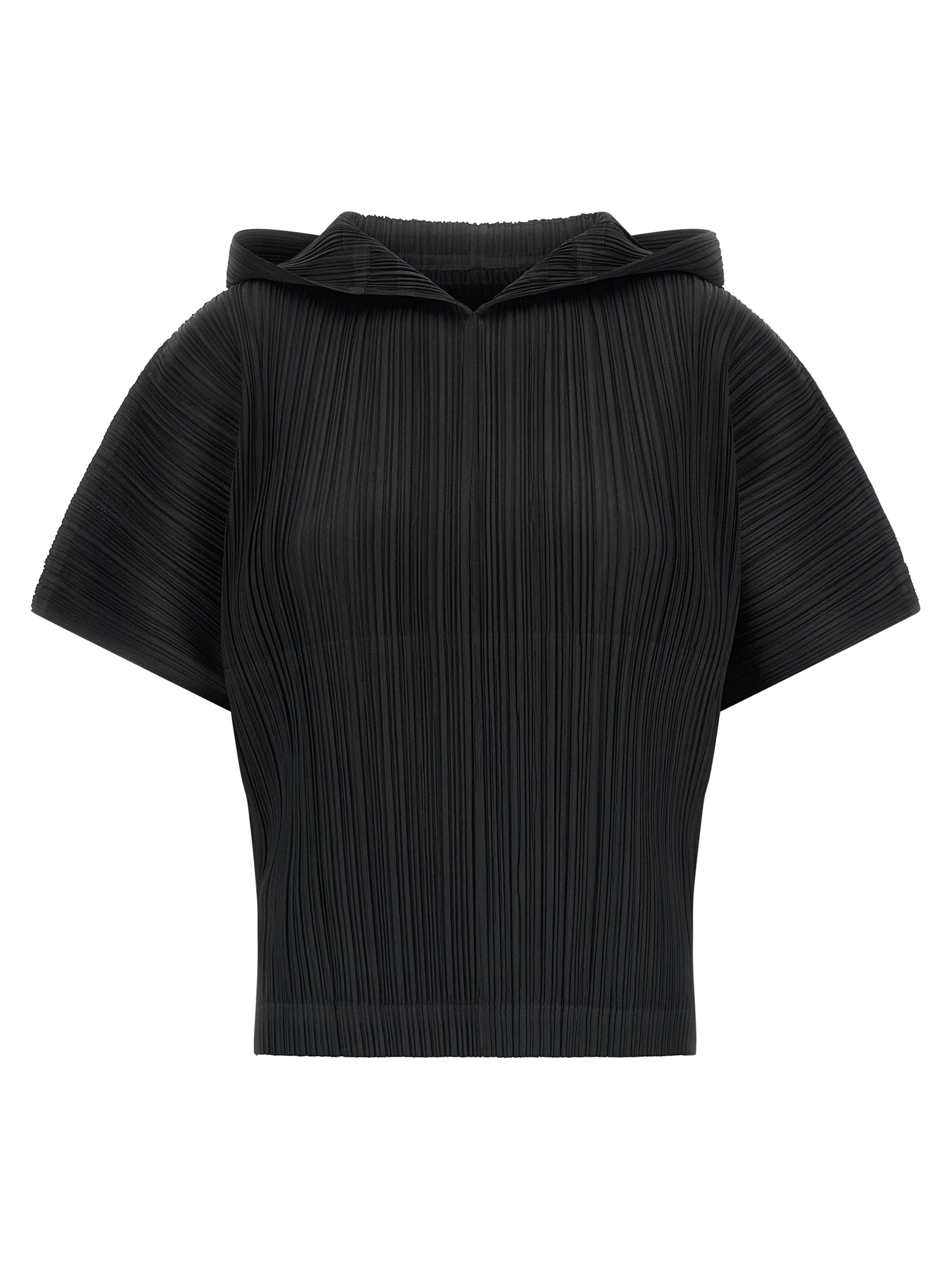 ‘Monthly Colors: August’ pleated fabric top, hood, pockets, short sleeves.