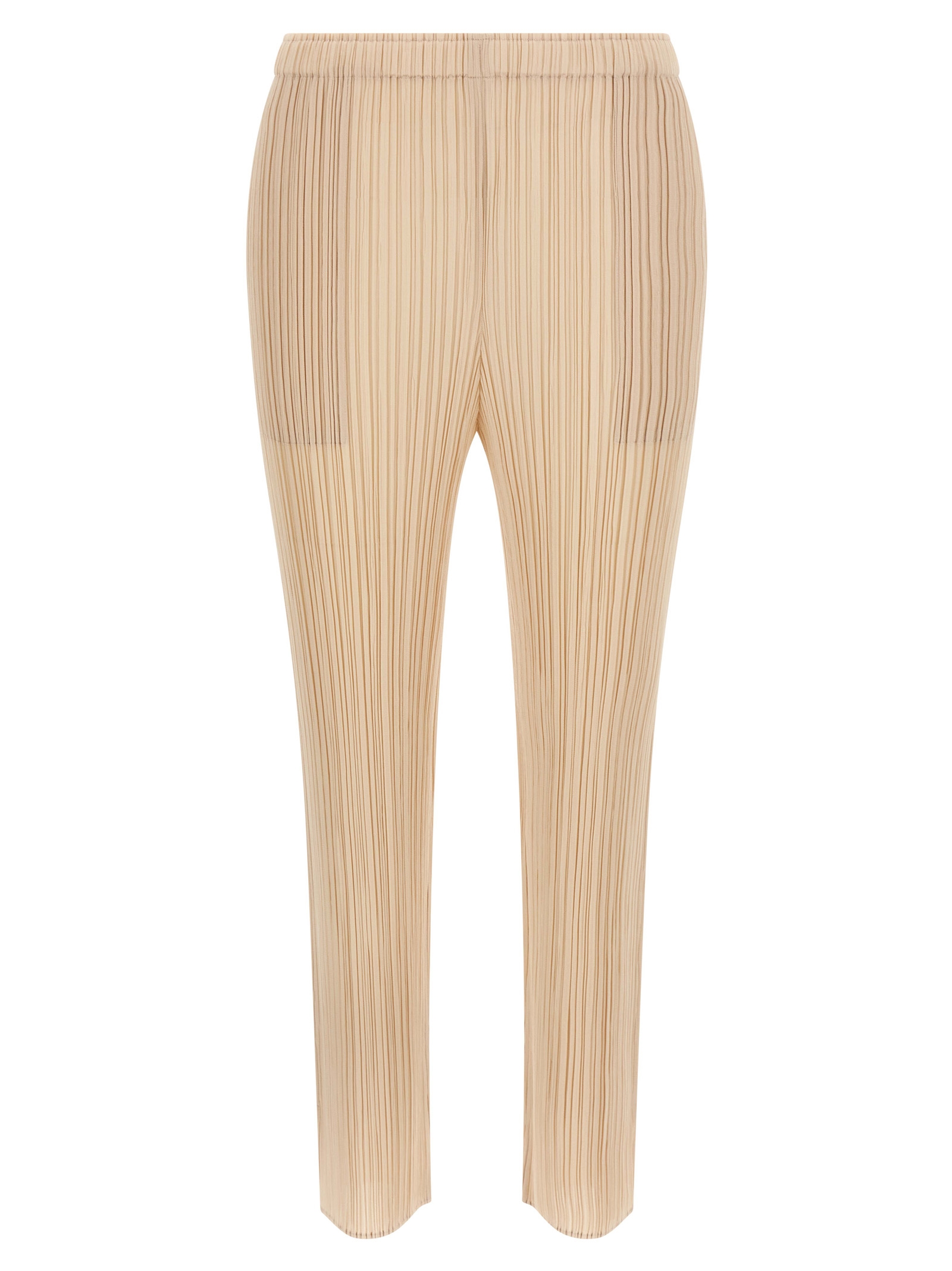 ‘Monthly Colors: July’ pleated pants, straight leg, slits at the bottom, side pockets, elastic waistband.