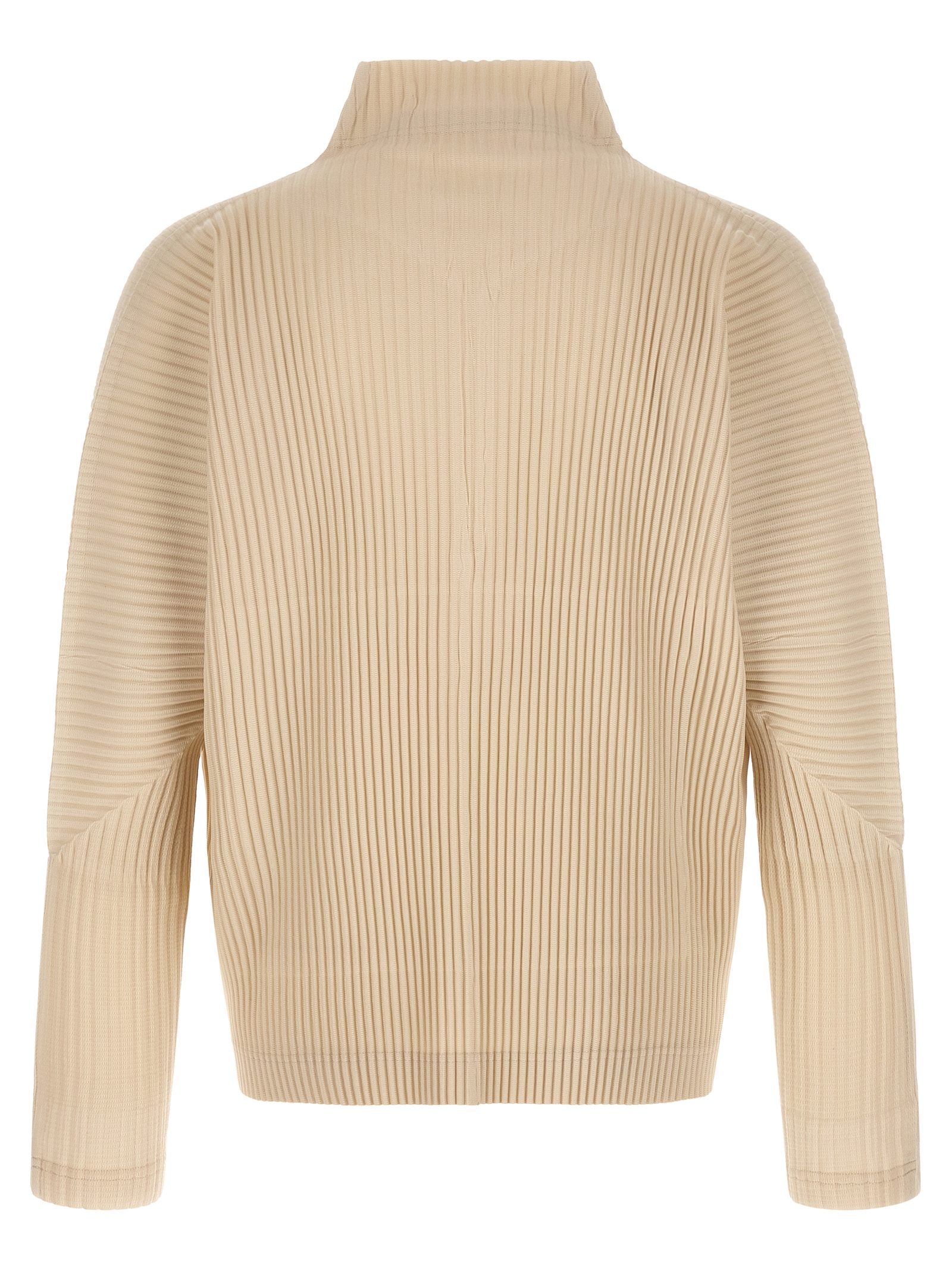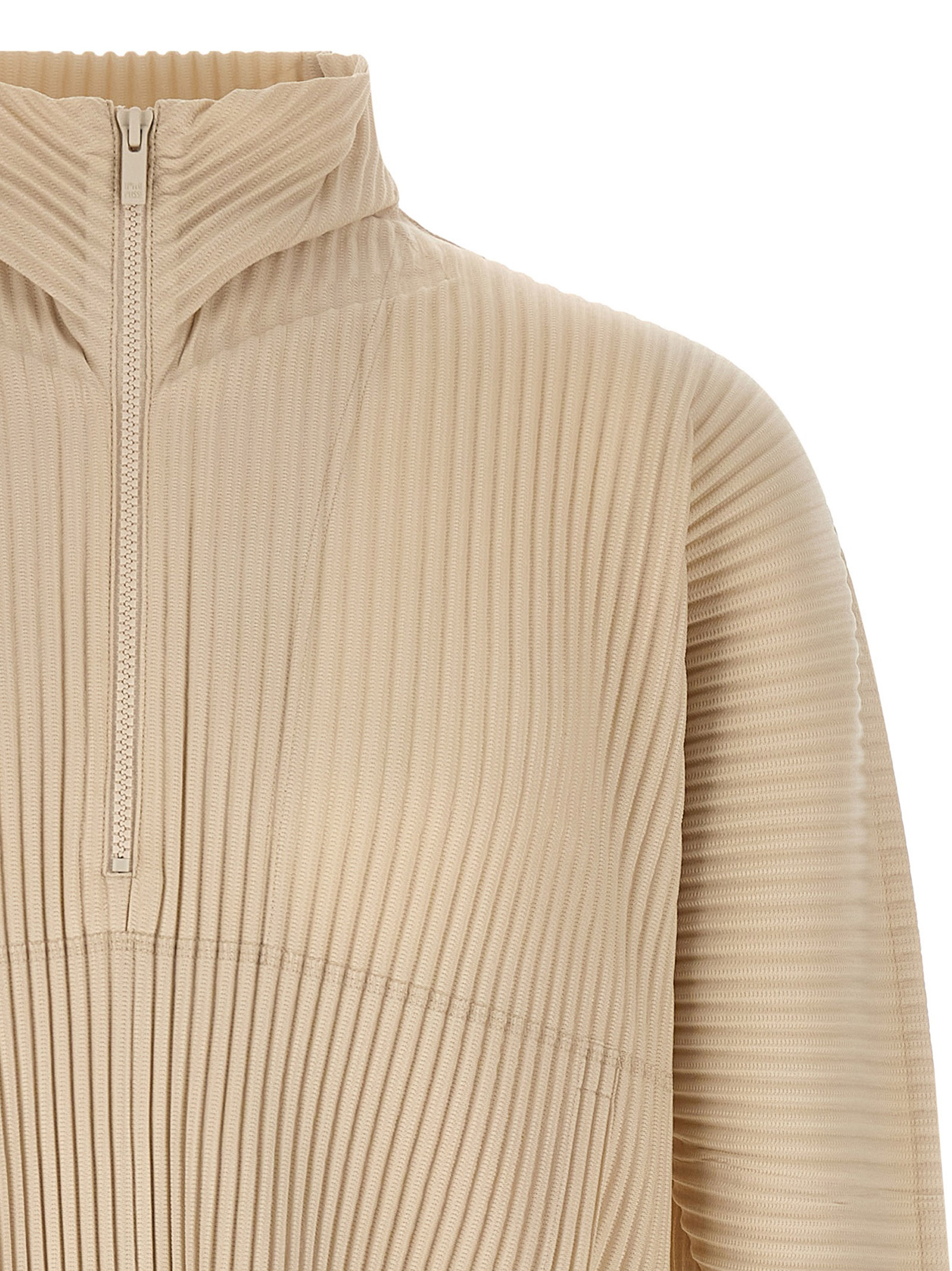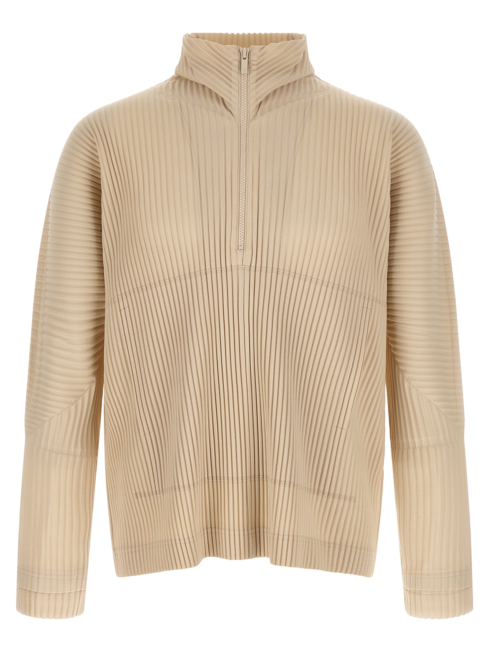 ‘Monthly Colors: March’ pleated fabric sweater, high neck, front half zip closure, front pockets, long sleeves.