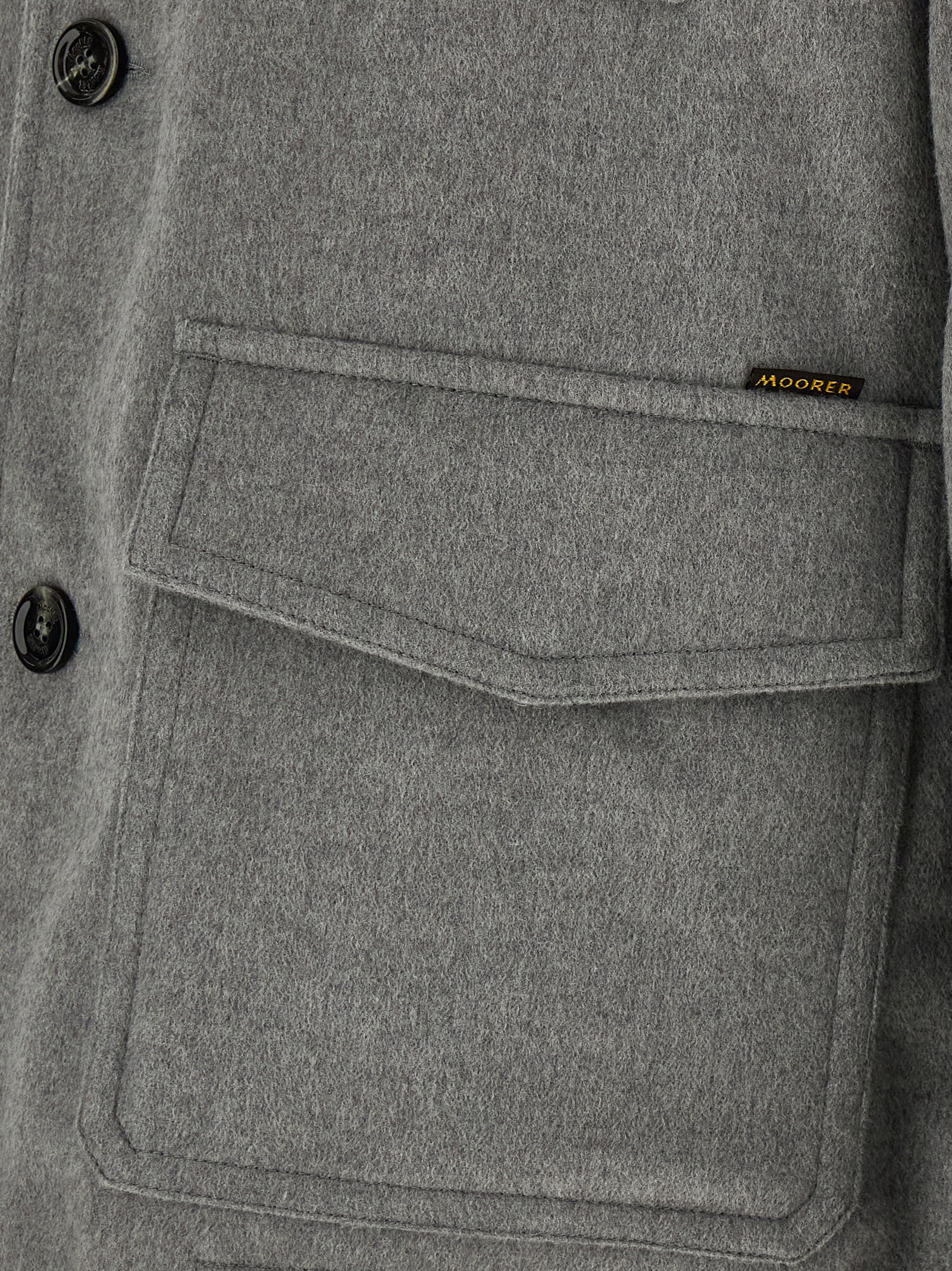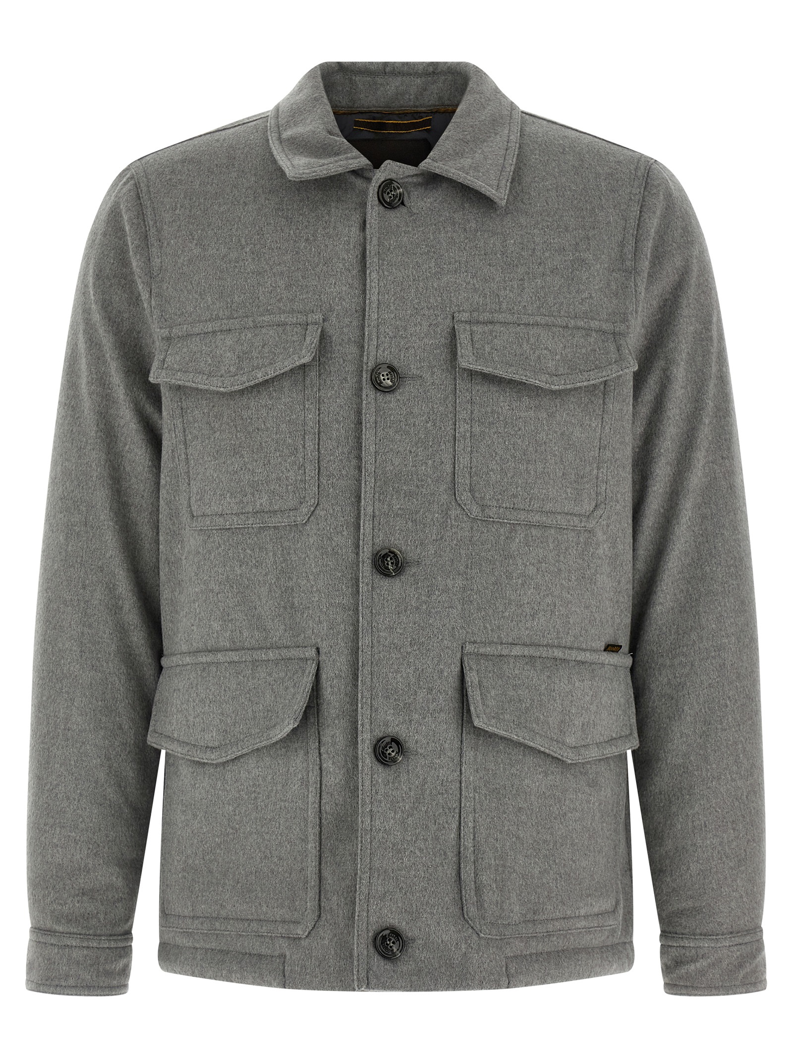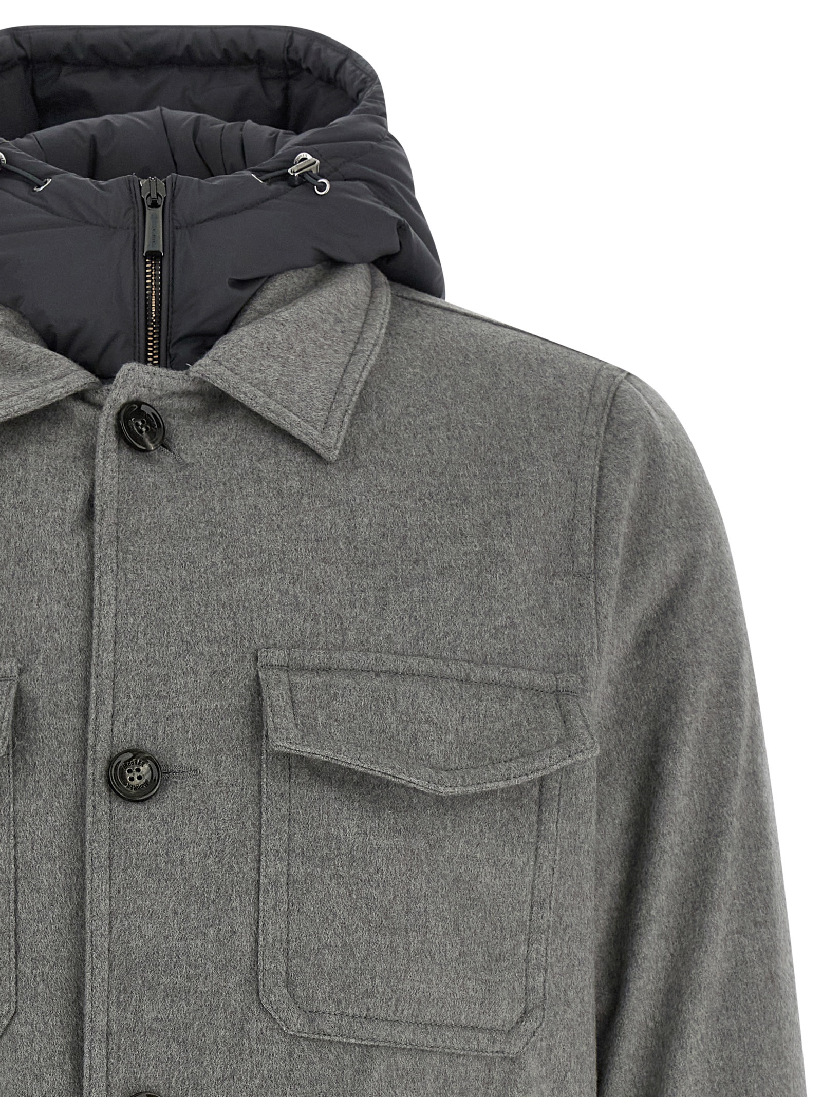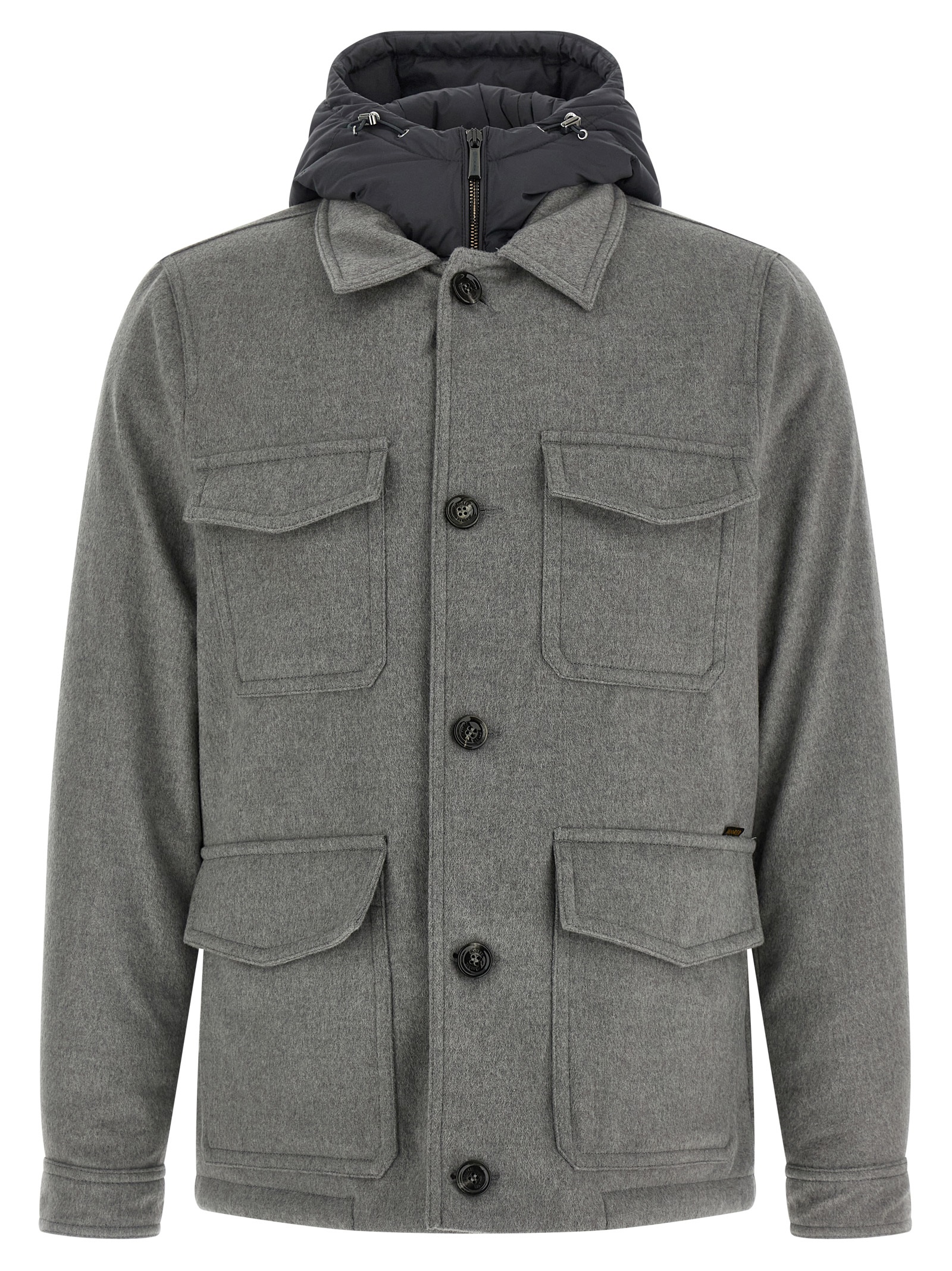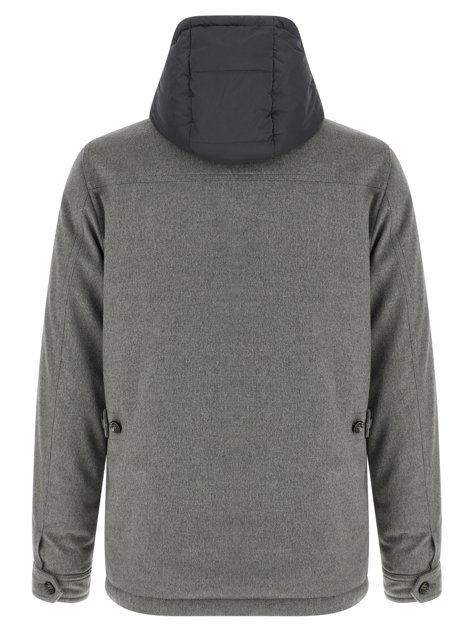 ‘Monti’ wool and cashmere jacket, nylon lining and removable front with adjustable quilted hood, goose down padding, shirt collar, front zip and button closure, pockets, long sleeves.