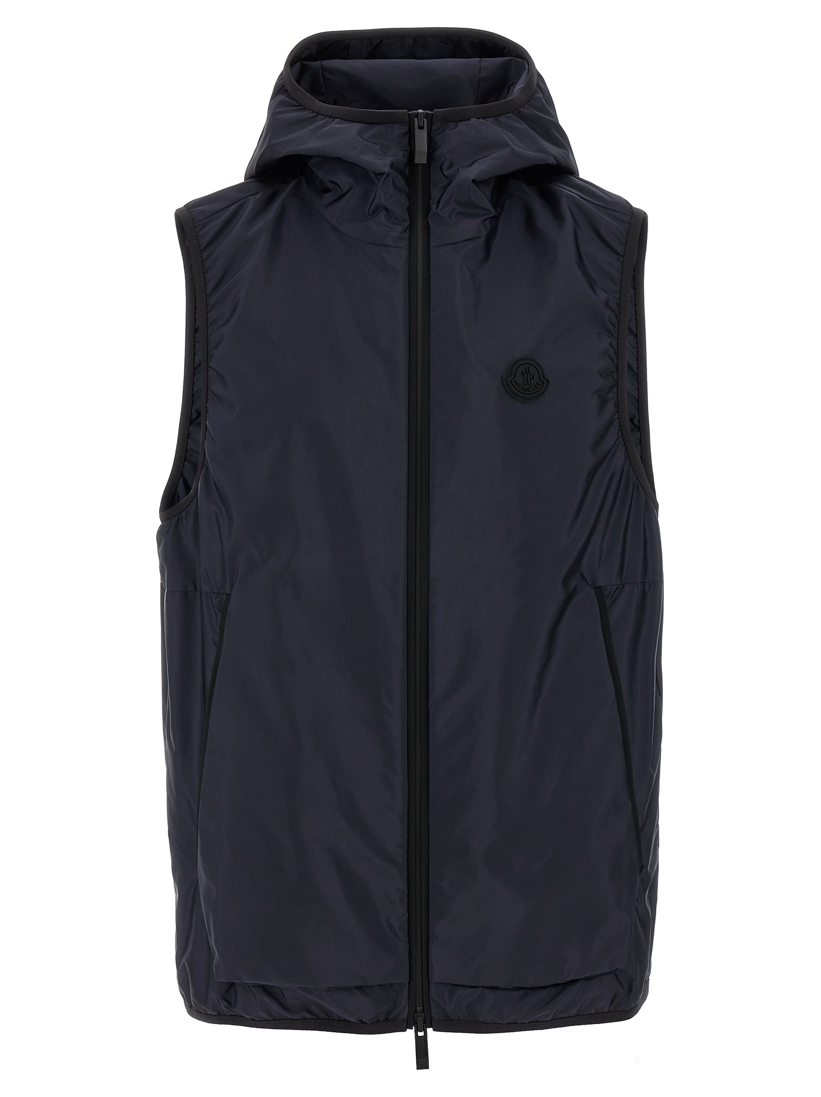 ‘Moretan’ waistcoat in technical nylon with front silicone logo patch, hood with back logo print, front zip closure, pockets.