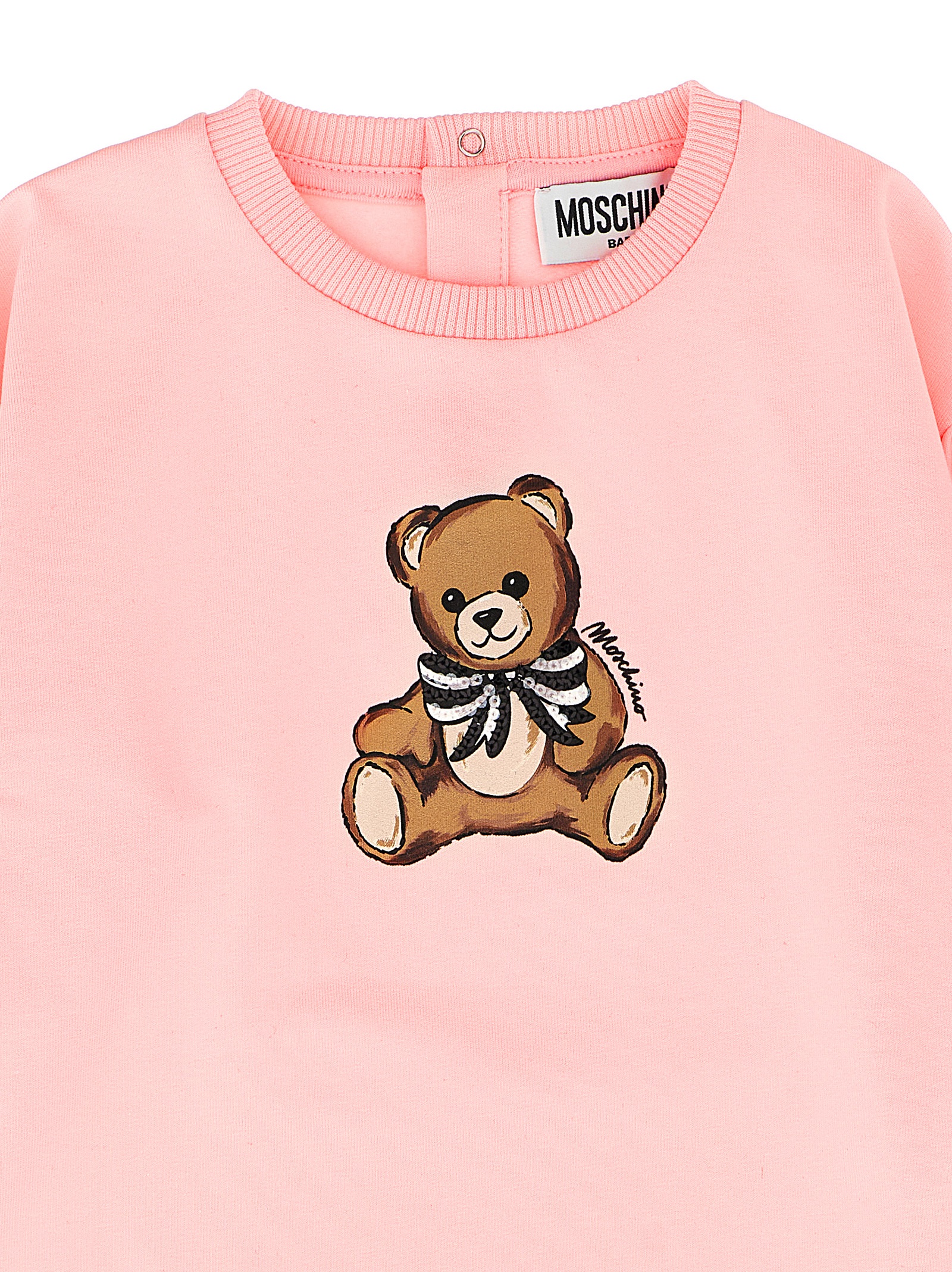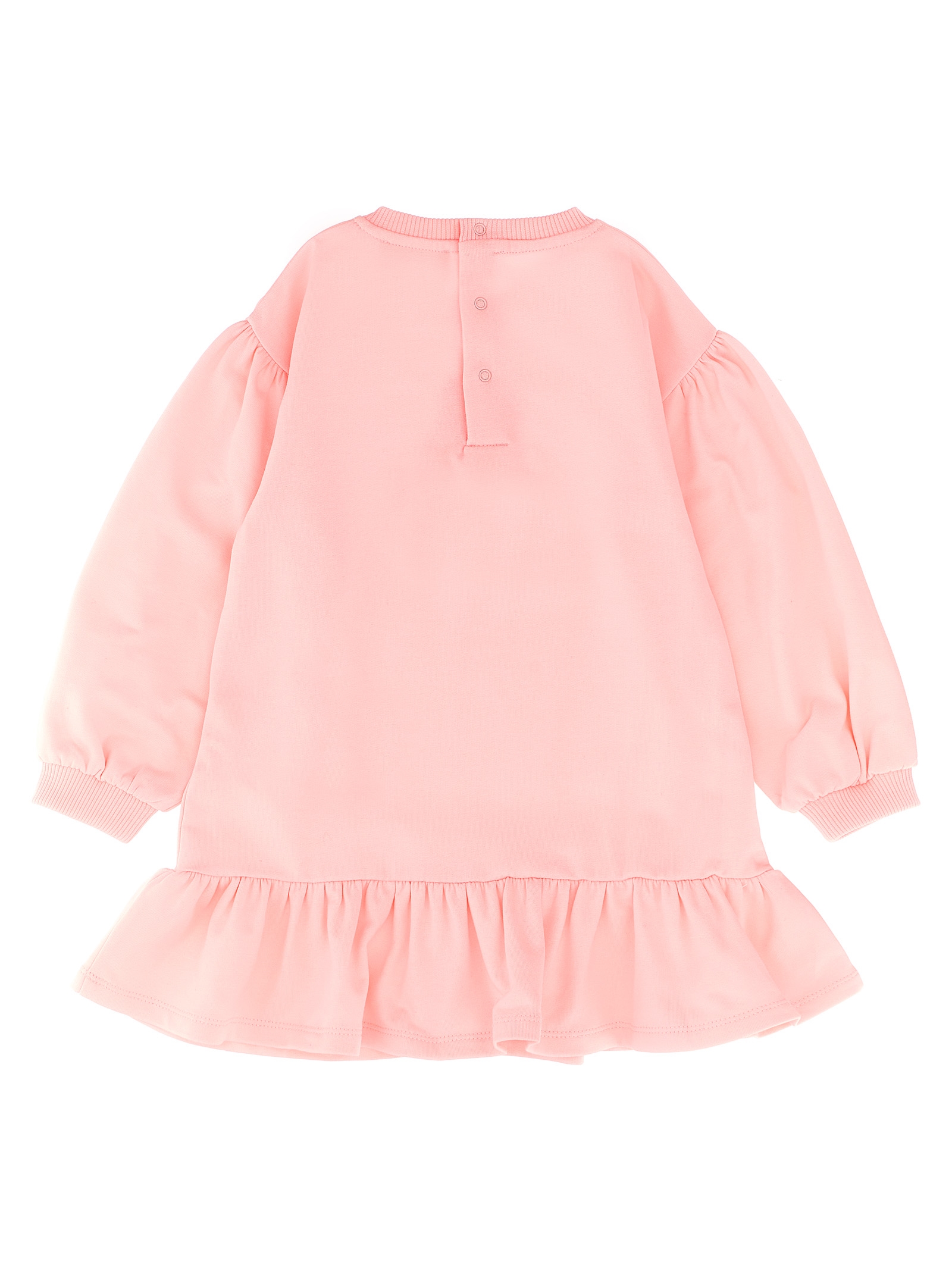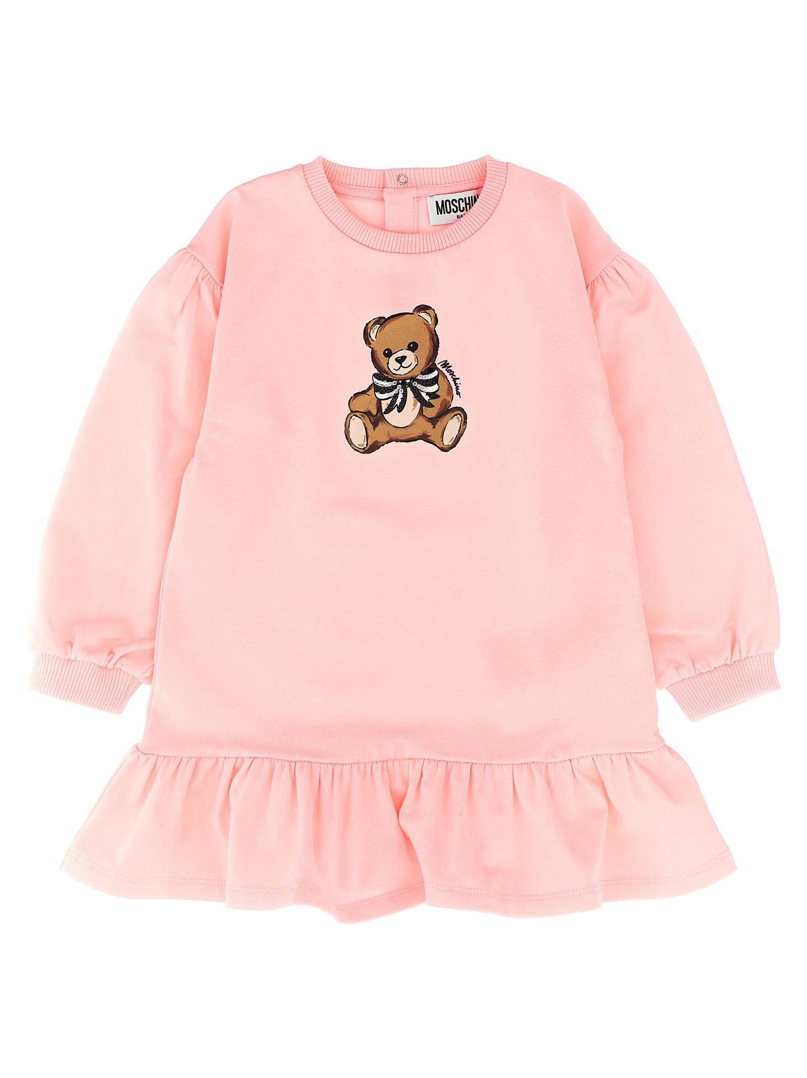 Lightly fleece cotton dress, ‘Moschino Teddy Bear’ print with front sequin appliqué, crew neck, back snap button closure, long sleeves with cuffs, flounce on the hem.