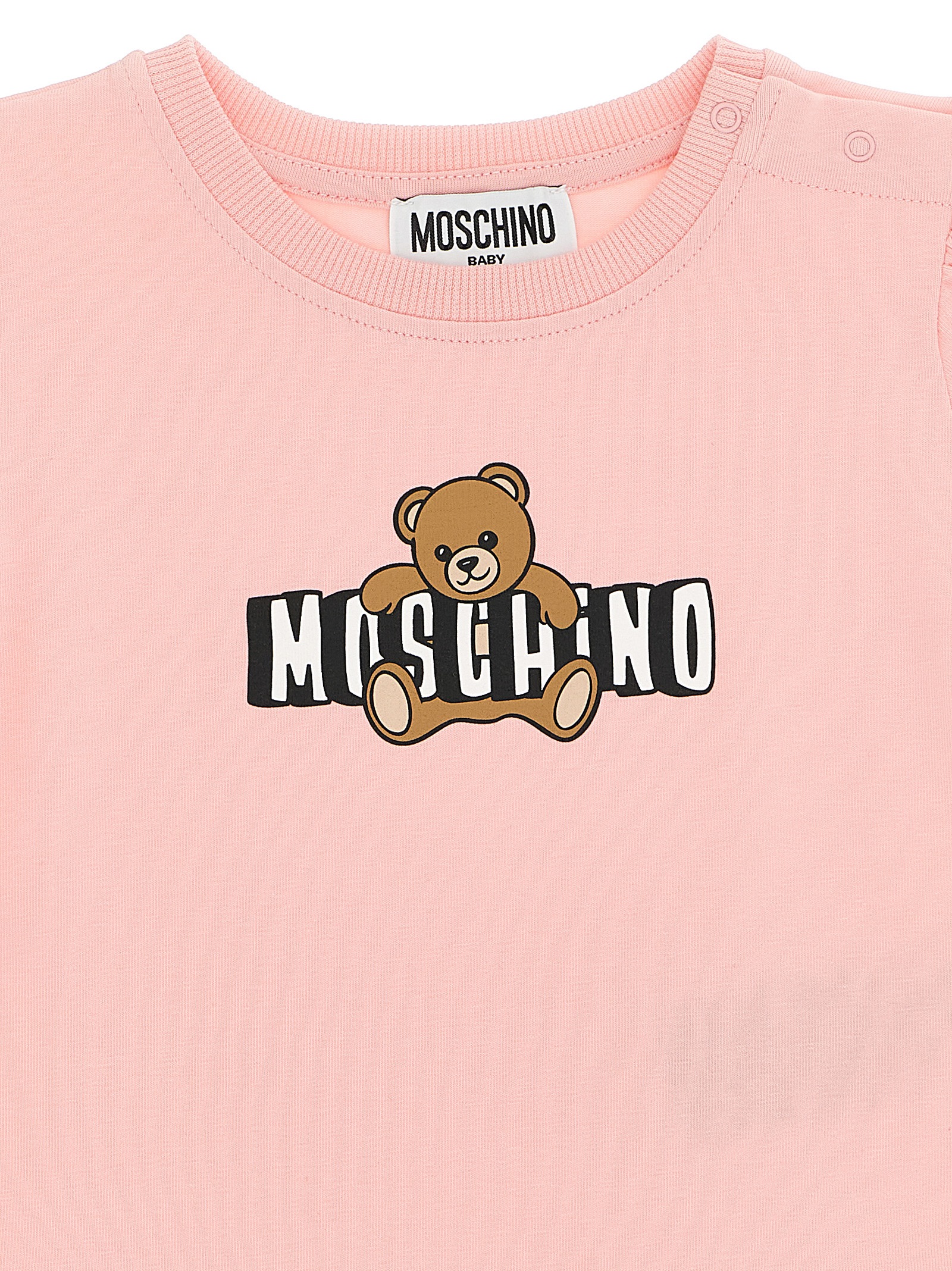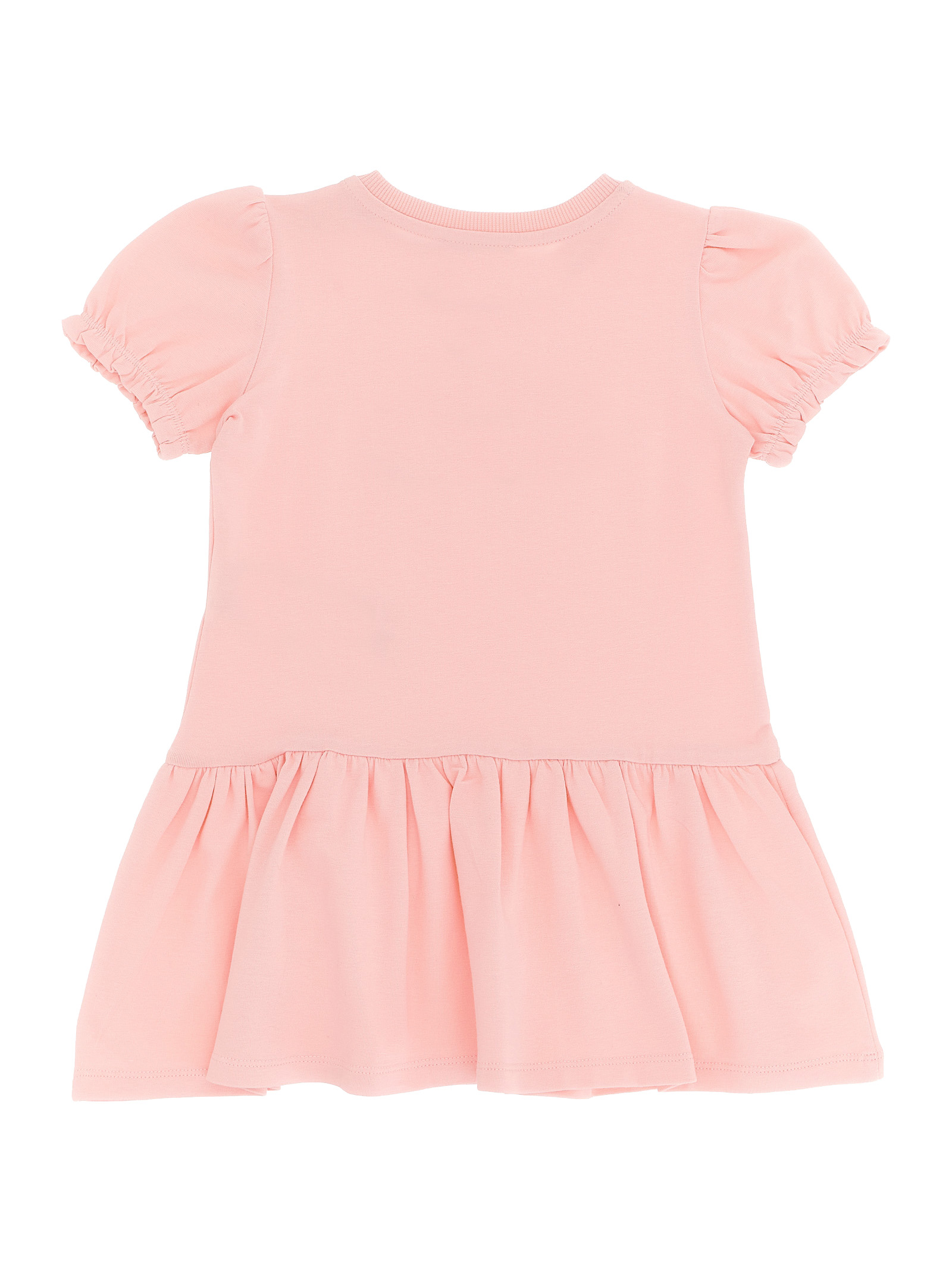Light brushed cotton dress with front ‘Moschino Teddy Bear’ print, crew neck, snap buttons on the left shoulder, short sleeves, and flounces on the hem.