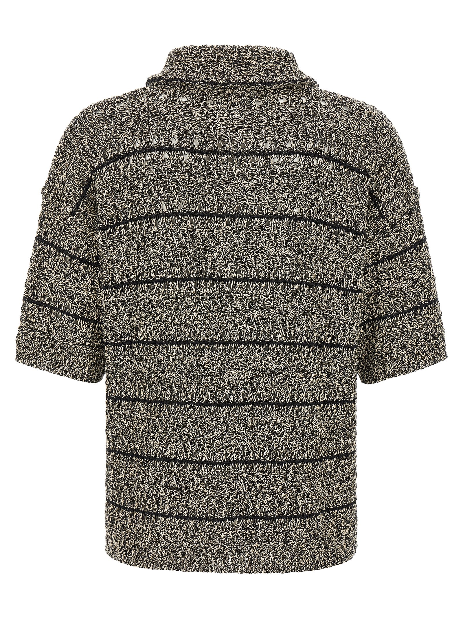 Knitted two-tone cotton cardigan with mouliné yarn insert, collar, front button closure, short cuffed sleeves.
