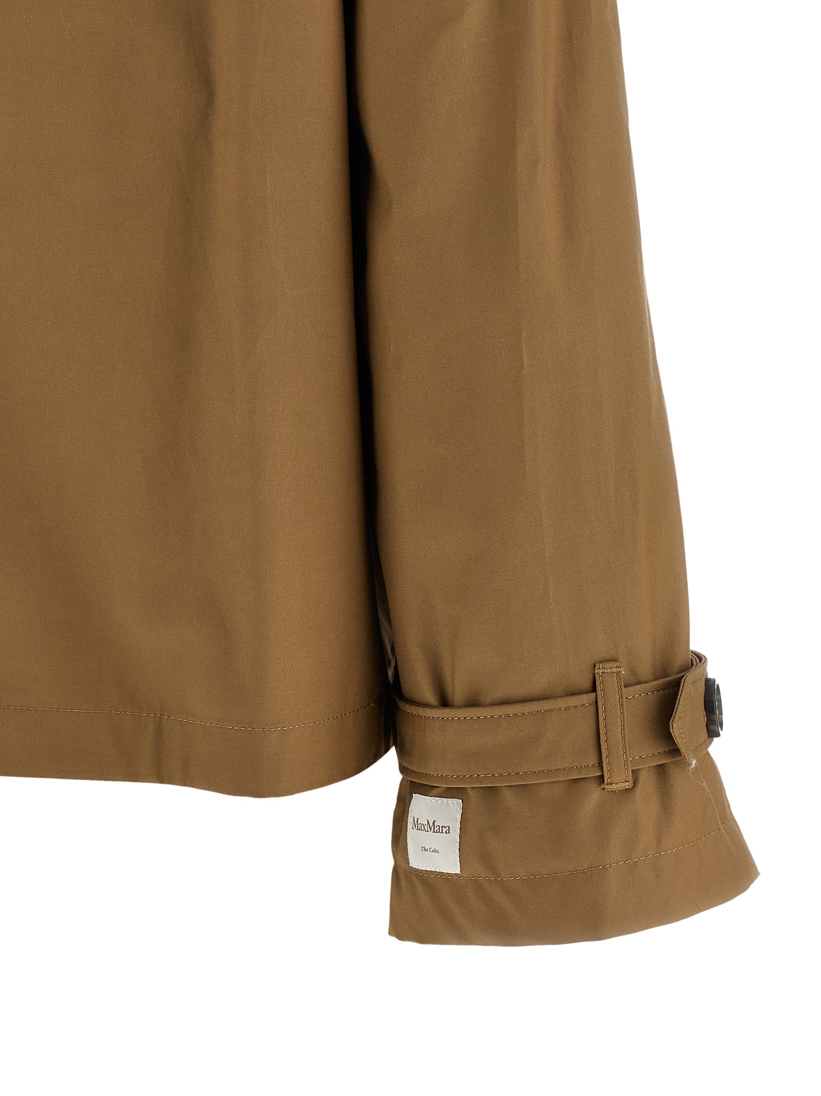 ‘MtcTesoro’ short trench coat in technical waterproof cotton twill, double-breasted style with horn button closure and front flap, shirt collar, pockets, long sleeves with wings on the wrists, cape with back button, taffeta half-lining and jacquard logo ribbon.