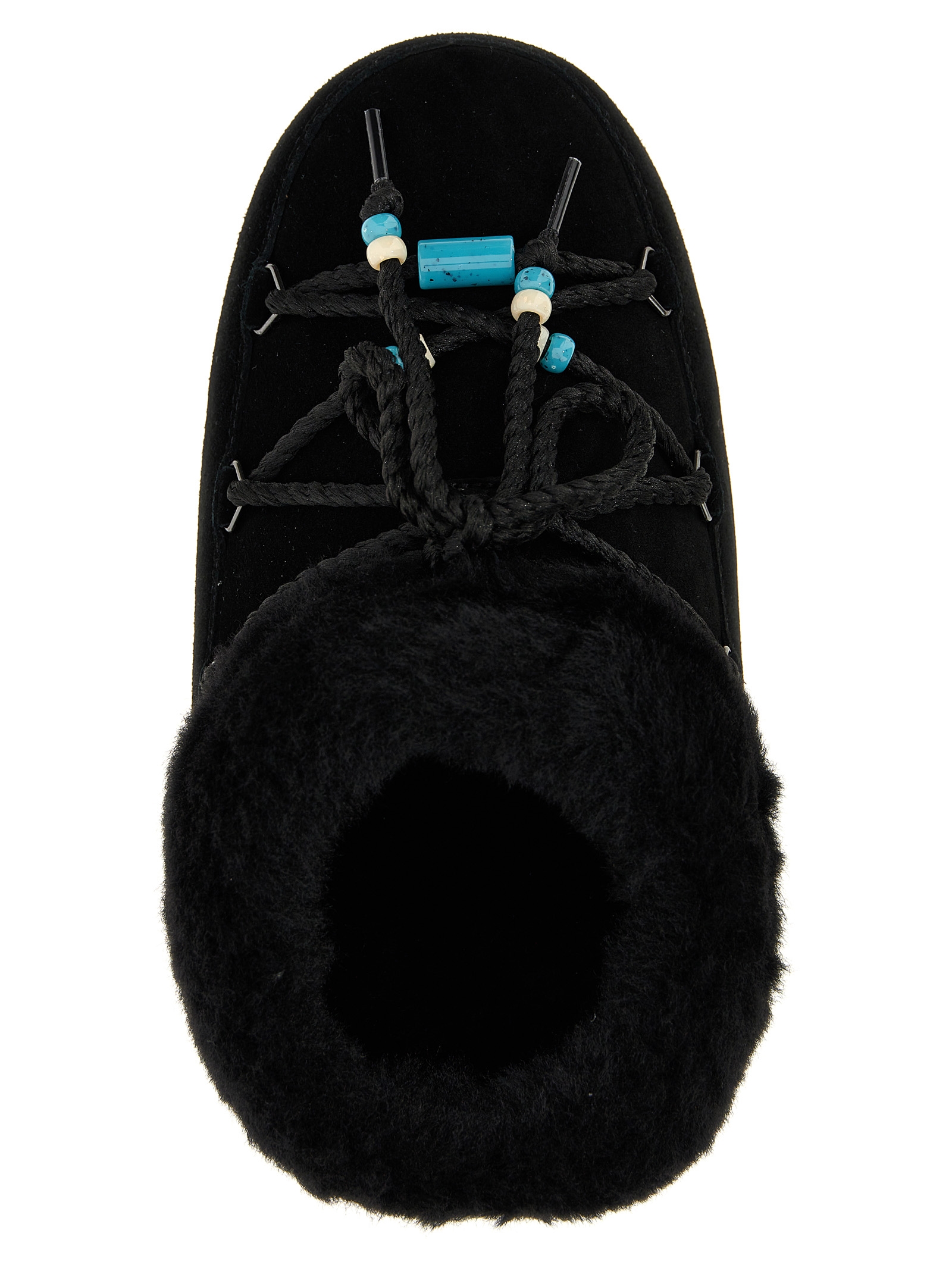‘Mule suede beads’ suede ankle boots with fur insert, ambidextrous model, overlapping tubular laces with beads, non-slip rubber tread.