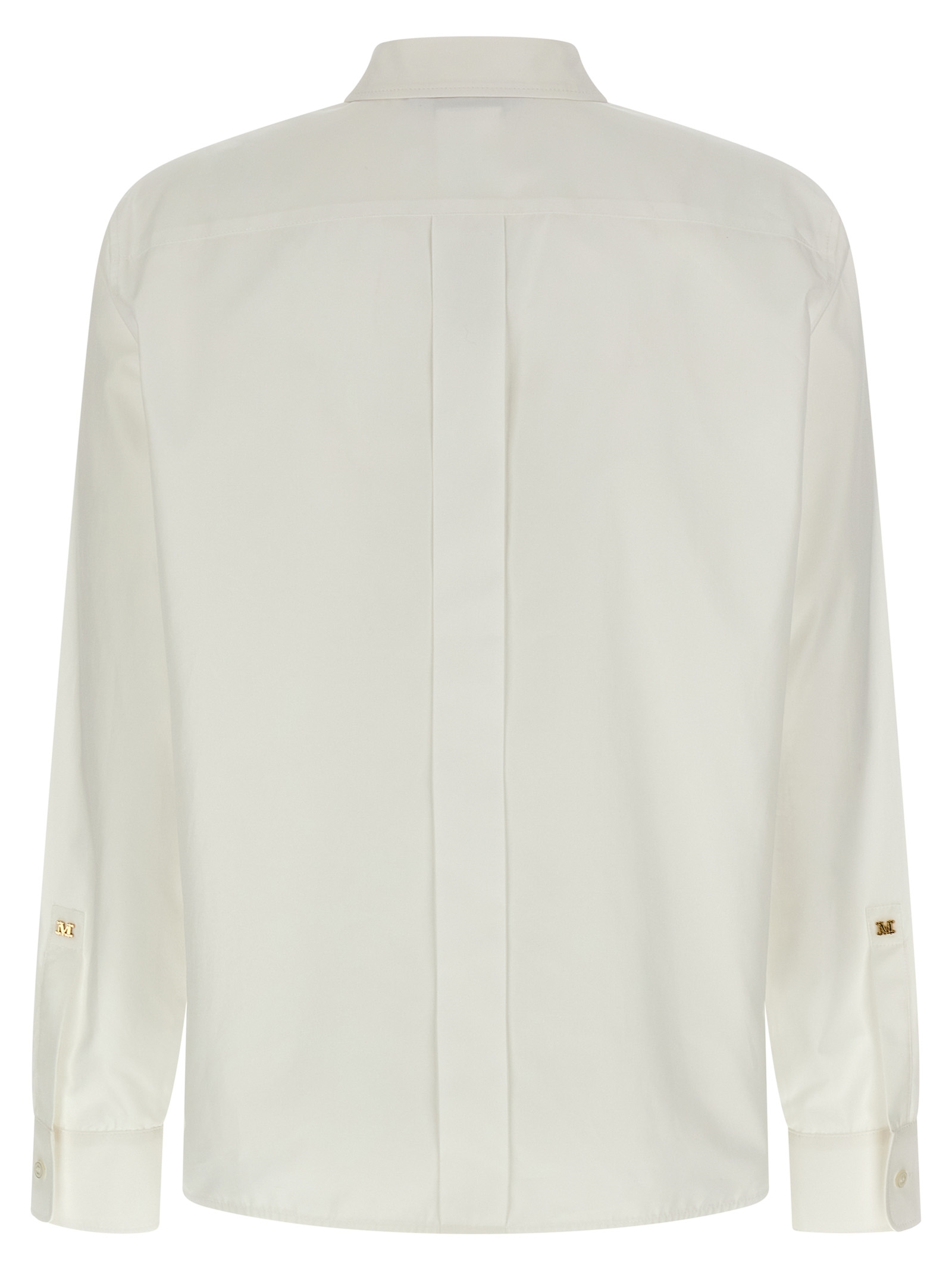 ‘MxmMaroso’ cotton poplin shirt with concealed front button closure, long sleeves with cuffs and metal logo appliqué, rounded hem with side slits.