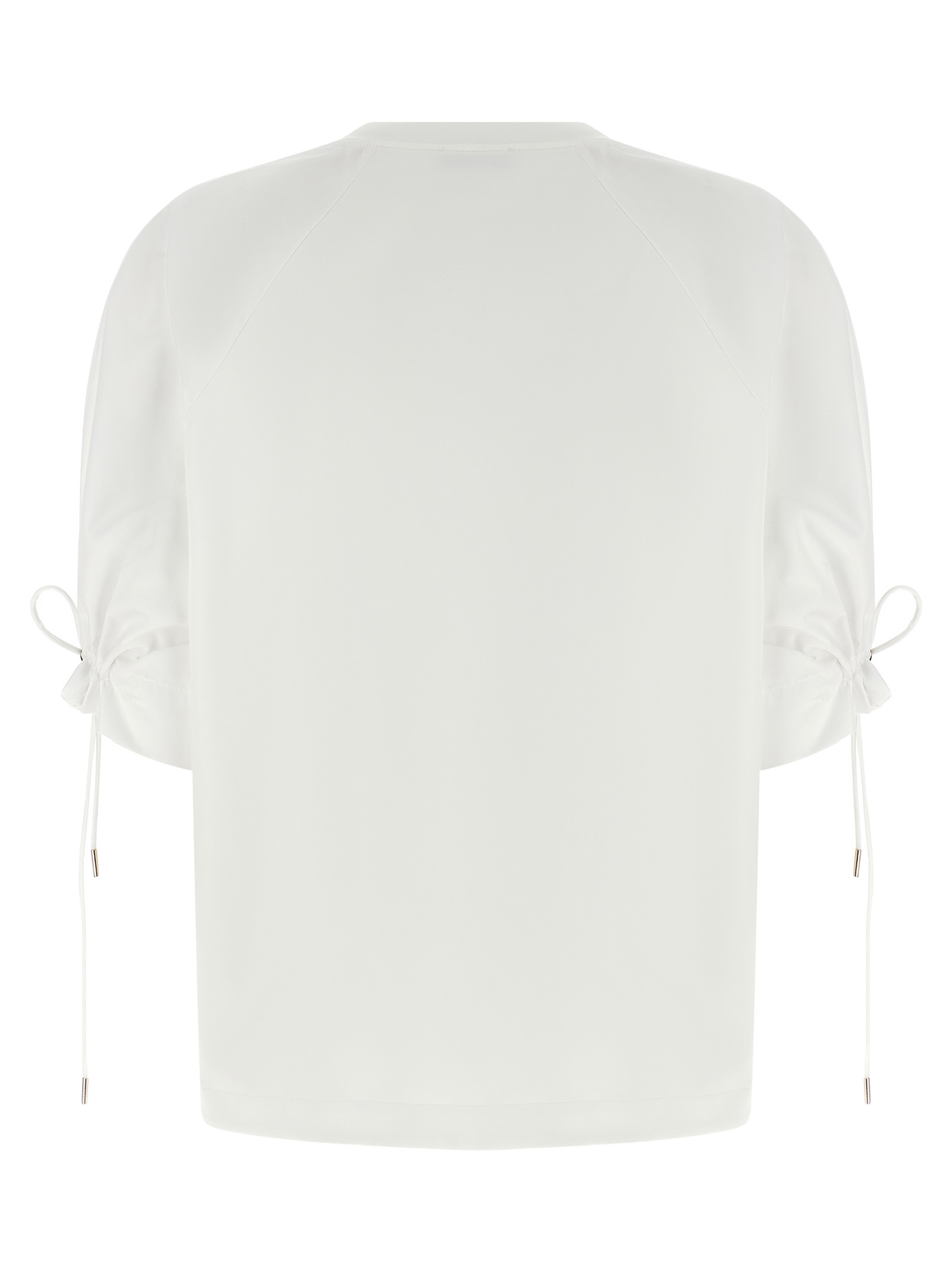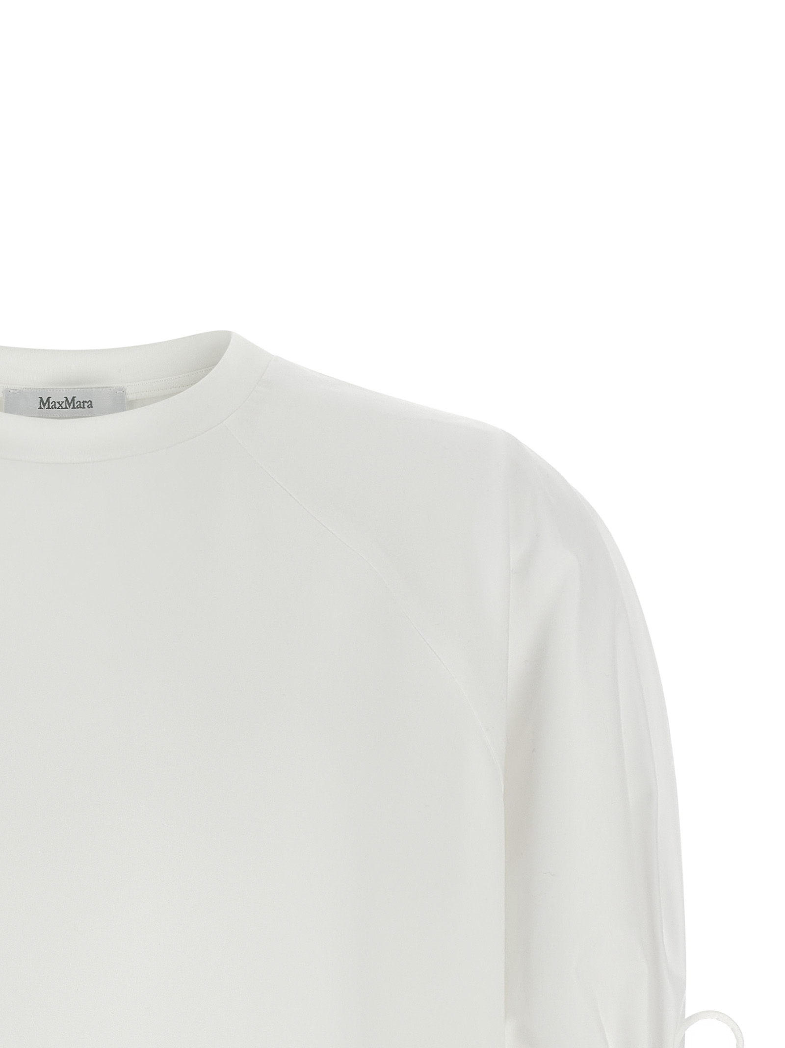 ‘MxmVest’ cotton blend technical jersey t-shirt, tone-on-tone rubber logo patch on the front, crew neck, short raglan balloon sleeves in pure cotton poplin and drawstring on the cuffs, side slits, asymmetric hem.