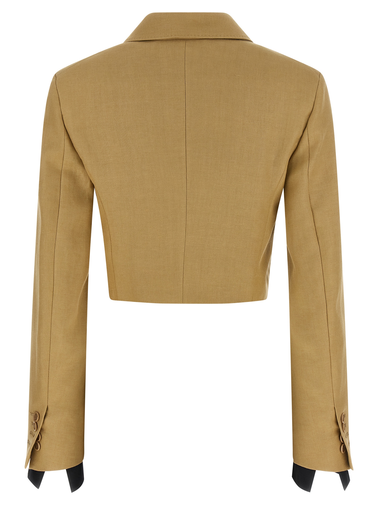 ‘MxsBuono’ diagonal blazer in pure matt linen finished with sartorial dot, single-breasted crop model with front horn button closure, tooth lapels, structured shoulder strap, long sleeves with double layer cuffs of which the one in cotton poplin with trompe l’oeil shirt-effect removable, Monogram stretch fabric lining