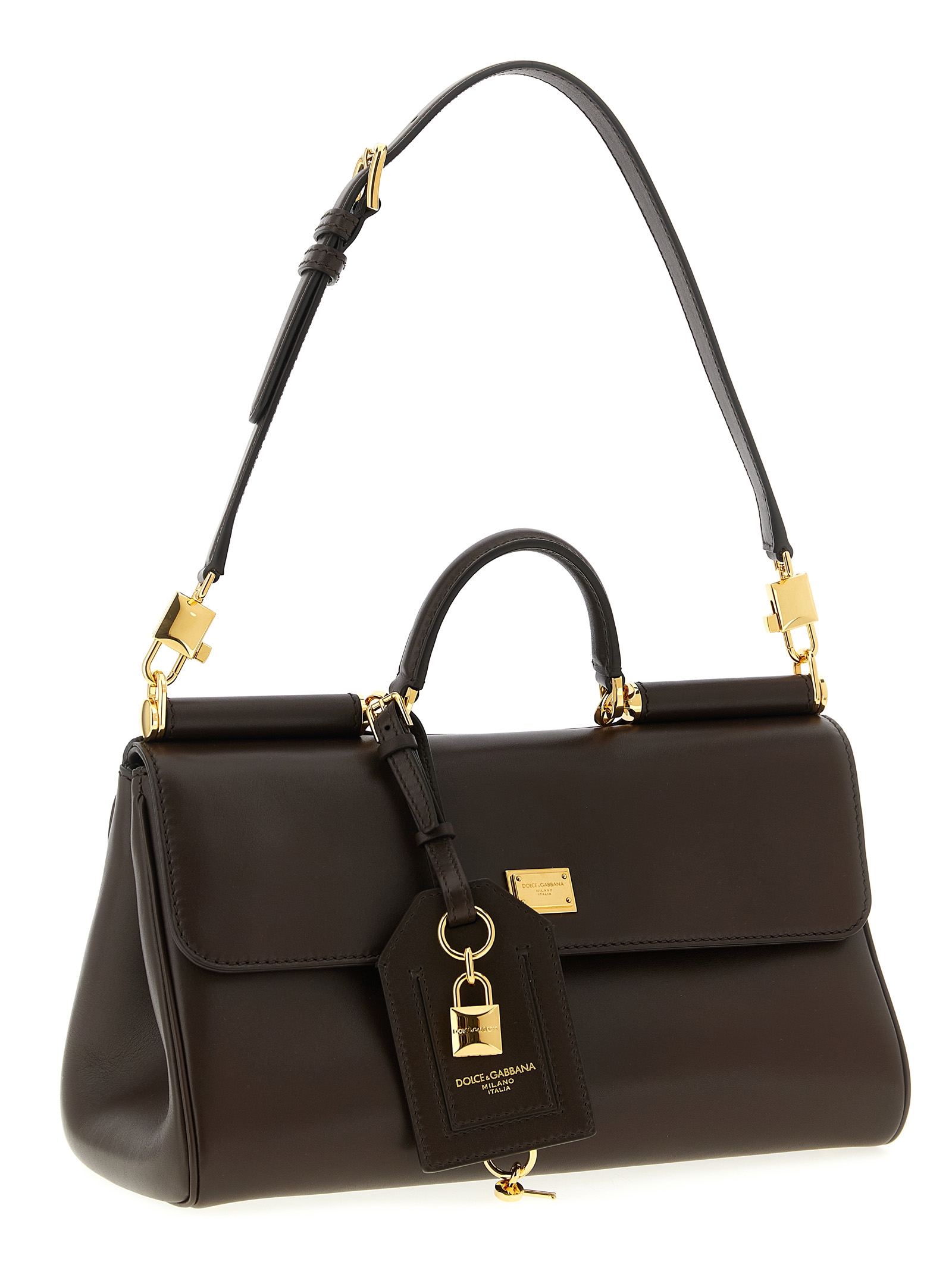 ‘My Sicily’ plongé calf leather handbag, flap closure with tuck-in mechanism and metal tag with front engraved logo, fixed handle, rigid bottom with metal feet, back zip pocket and embossed logo, adjustable and removable shoulder strap.