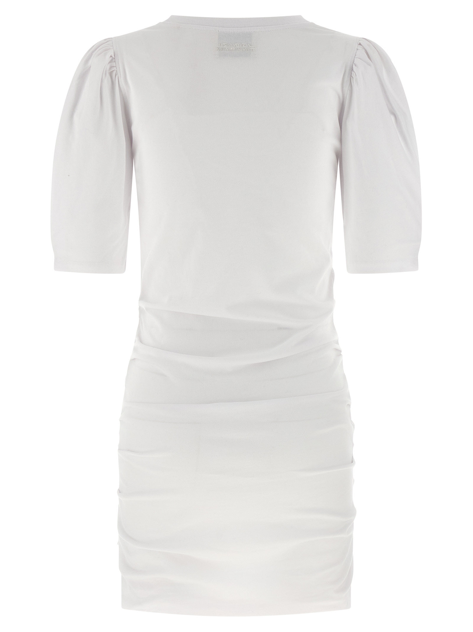 ‘Mylda’ cotton jersey mini dress with side draping, round neckline, 3/4 sleeves with gusset and crinkled shoulder, tone-on-tone logo embroidery at the back.